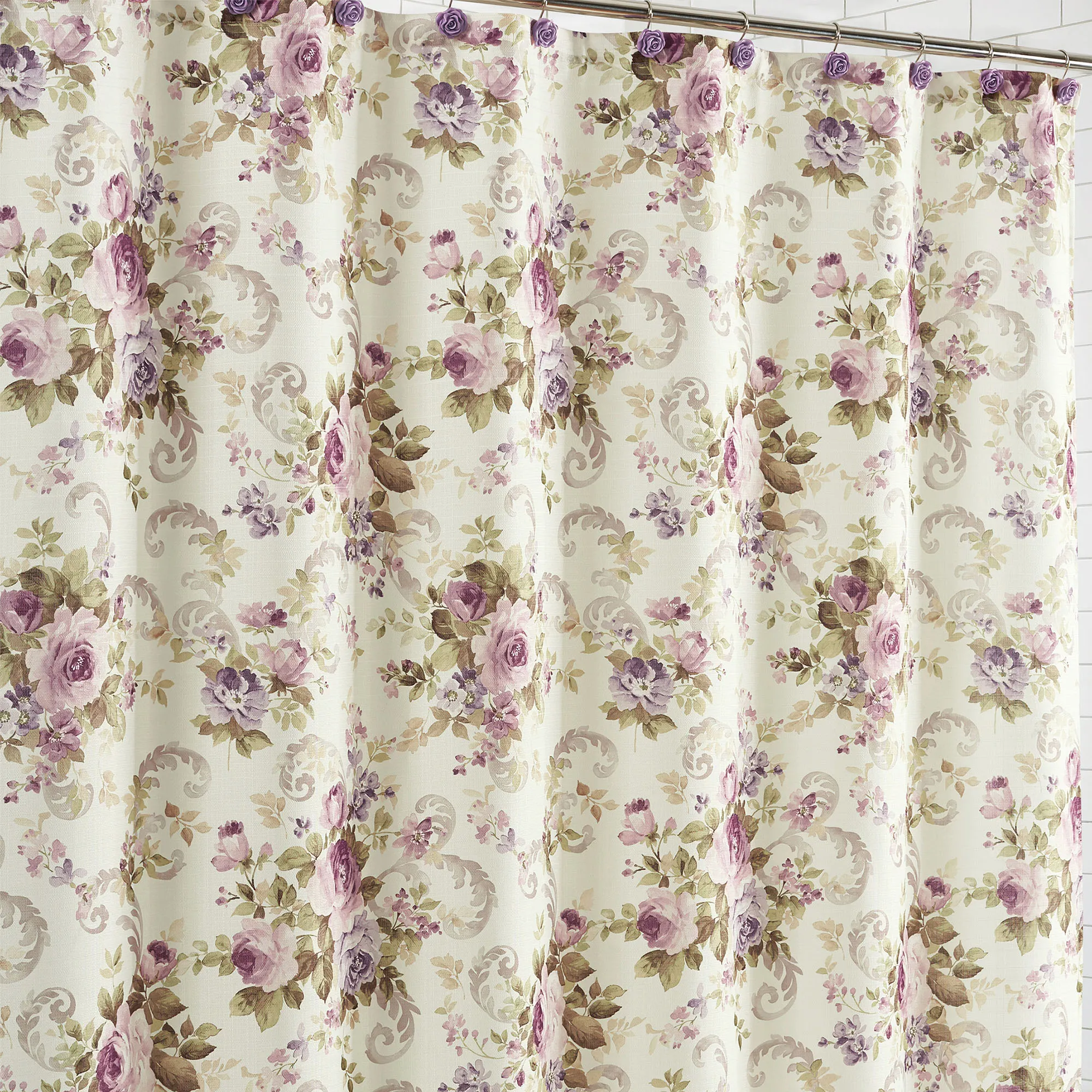 Blossoming roses flourish with sweetness on the Chambord Floral Shower Accessories from Royal Court Home. The polyester Shower Curtain has a floral print in shades of light amethyst, violet, plum, and sage on a woven eggshell background. We recommend the use of a waterproof shower curtain liner, not included. Measures 70"x72". Machine washable. Imported. Shower Hooks are sold separately in a 12-piece set. The resin and metal shower curtain hooks have handpainted roses in light amethyst. Each hook measures 1.5"Wx3"Dx2"H.