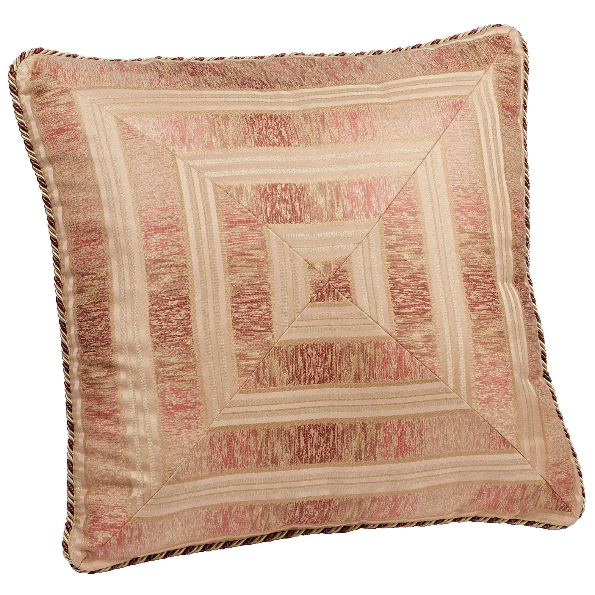 The Chandon European Sham will decorate your sleeping space with elegant splendor. The corded polyester accessory features mingled hues and stripes in hues of rose pink, mauve, pink, ivory, and light gold. The mitred European sham has a French back closure. Dry clean. Imported.