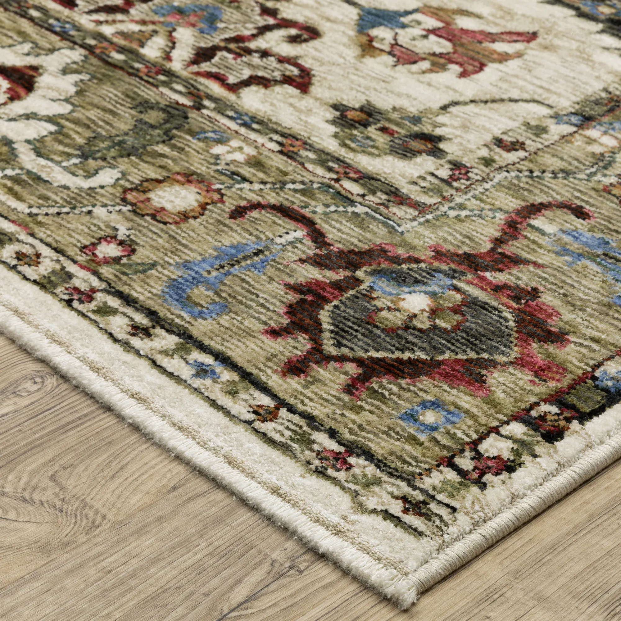 Florals, acanthus leaves, and vine designs decorate the Chapone Ivory Area Rug with splendor. This space-dyed, power-loomed polyester area rug for the living room, .27" thick, features a vining floral motif. The ivory coloration includes shades of ivory, blue, claret, gray, pink quartz, and green. Length-end fringe is .5"L. Backing is woven polypropylene. We recommend professional cleaning by a rug cleaner. Imported.