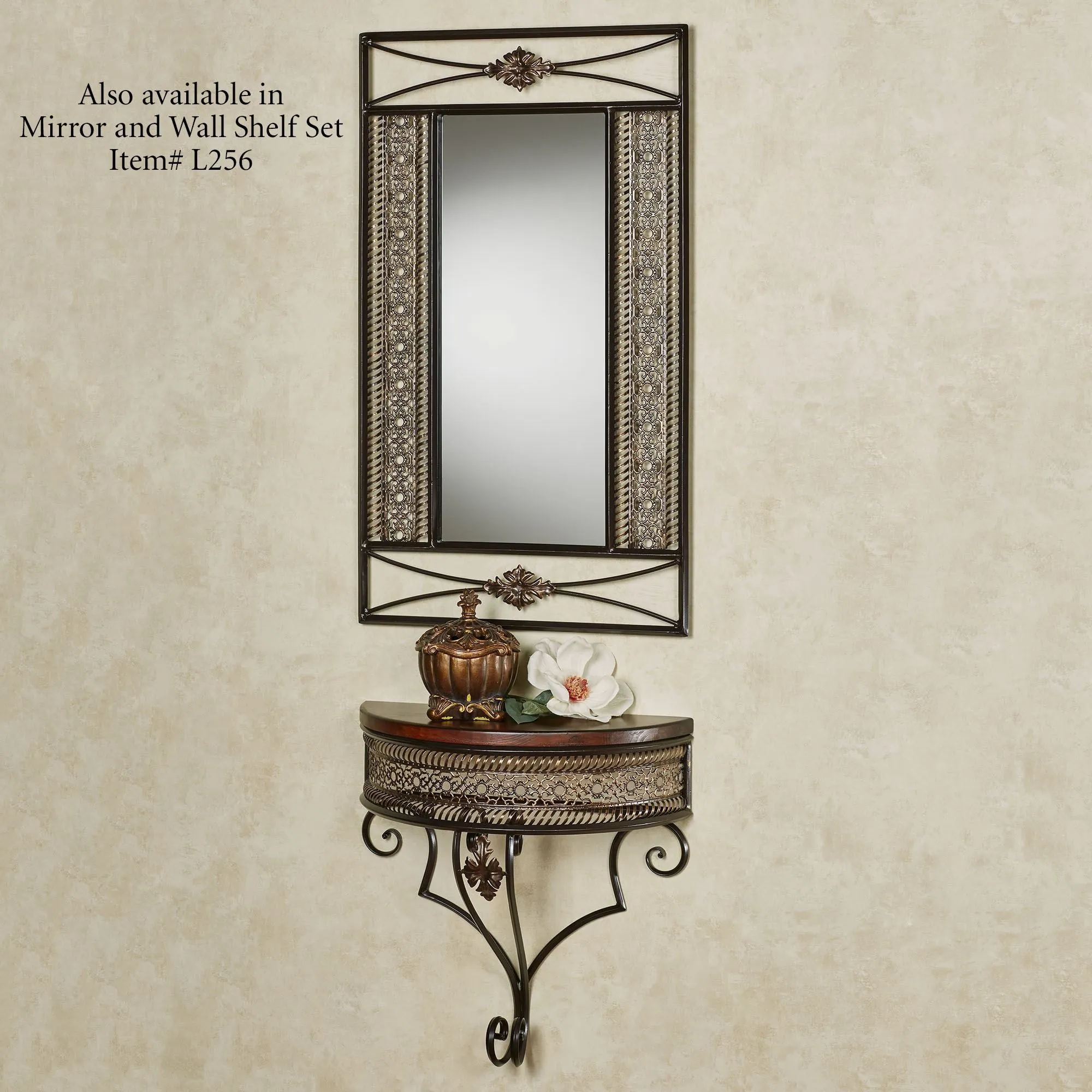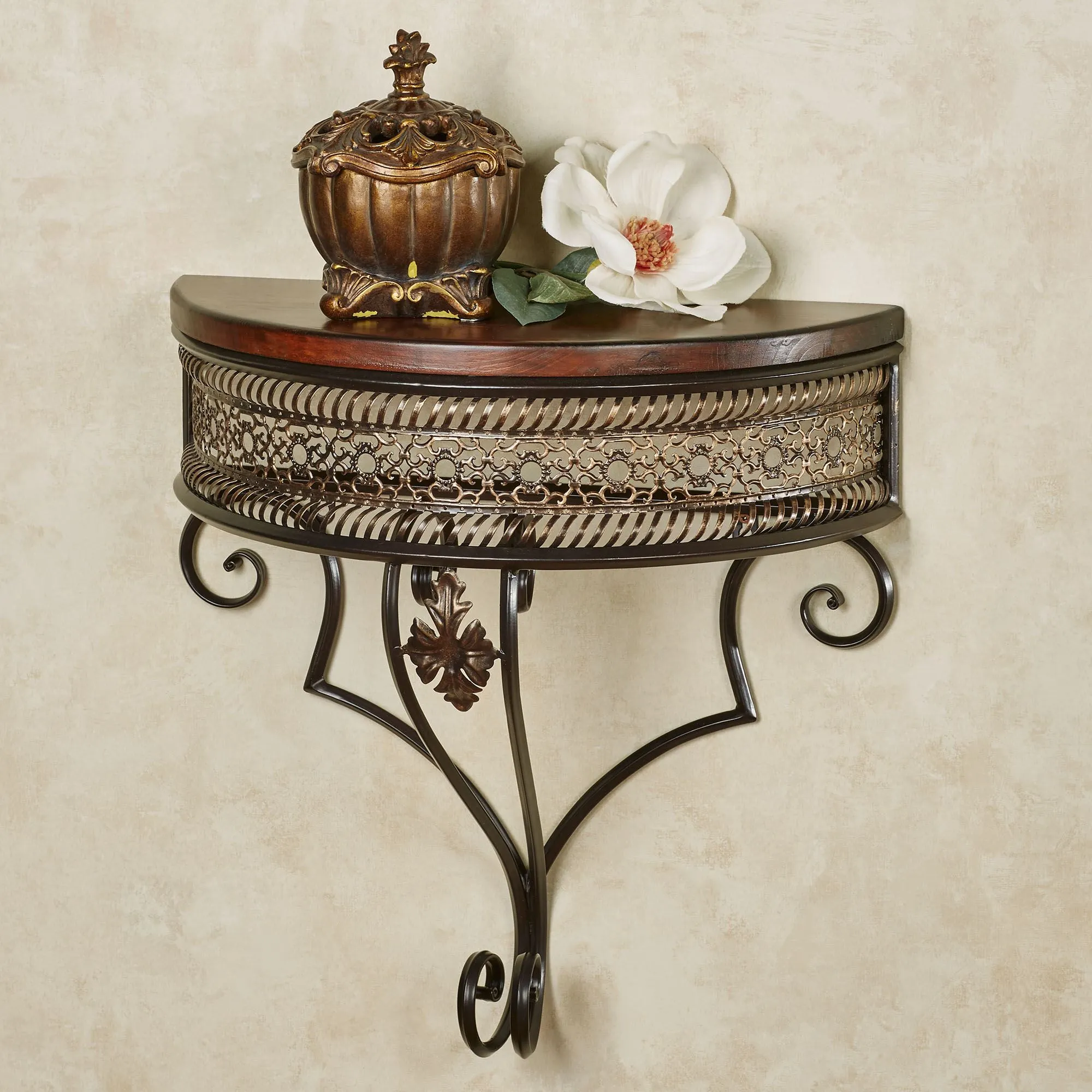 The Charleston Wall Display Shelf adds a refined presence to your space. Finished in bronze and highlighted with gold, the curved wall shelf features a natural cherry-finished wood top, openwork ornate lace-like scrollwork, lovely scrolling metal framework, and an acanthus leaf accent. Decorative wall shelf measures 18"Wx8"Dx19"H.