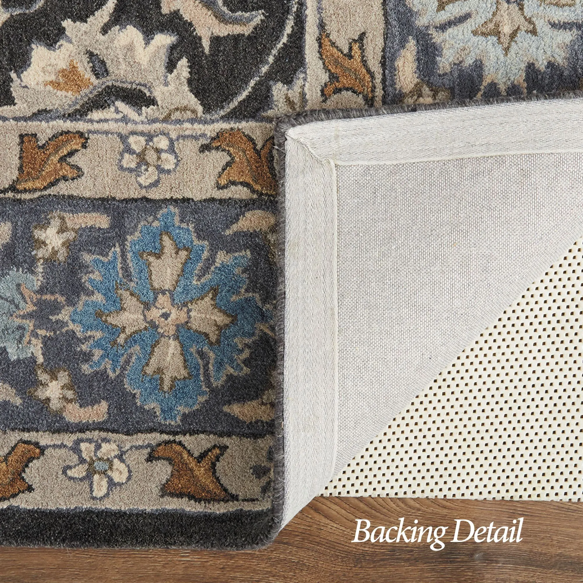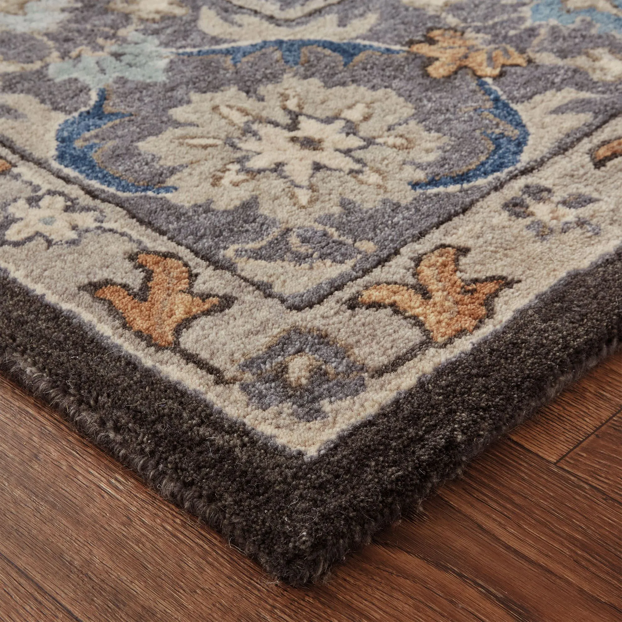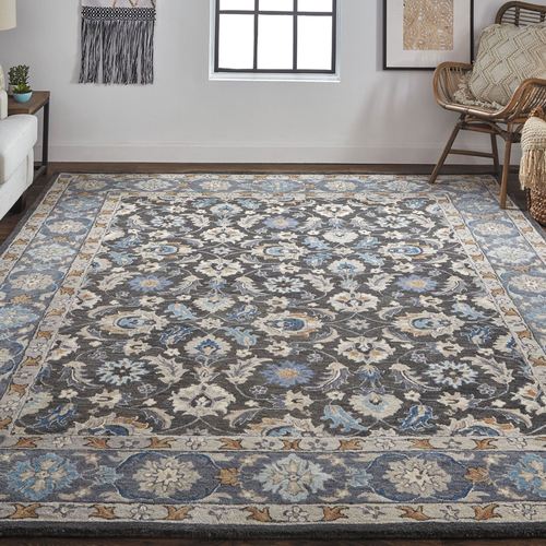 Acanthus leaves are beautifully paired with florals and vining motifs on the Charlotte Rug. Hand-tufted wool area rug, .472" thick, has a traditional motif and includes shades of blue, gray, charcoal, beige, ivory, tan, and pastel blue. Backing is cloth-covered latex. We recommend professional cleaning by a rug cleaner. Imported.