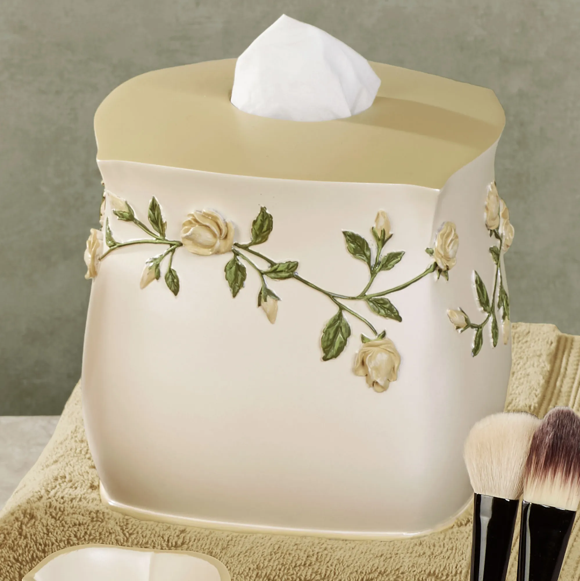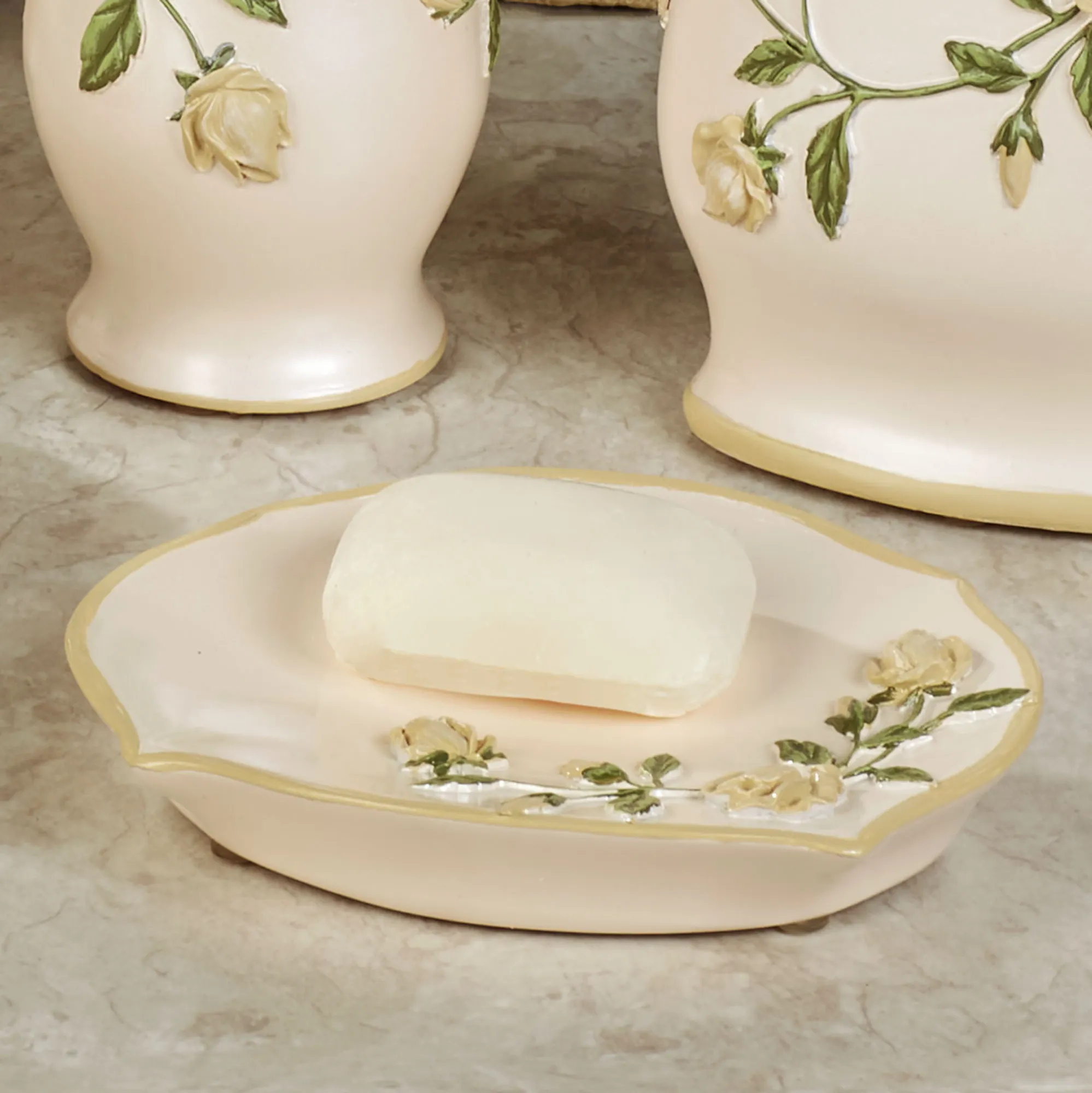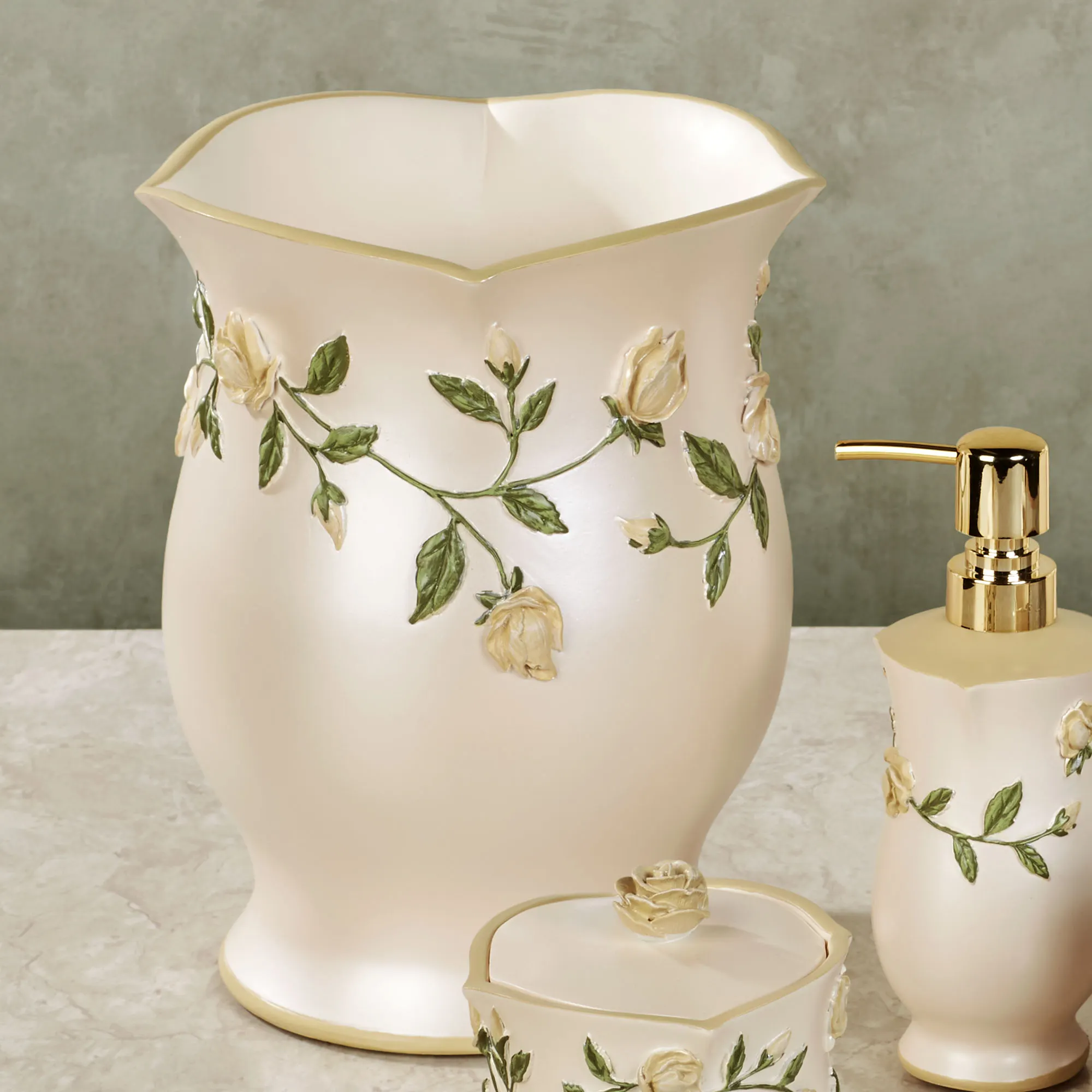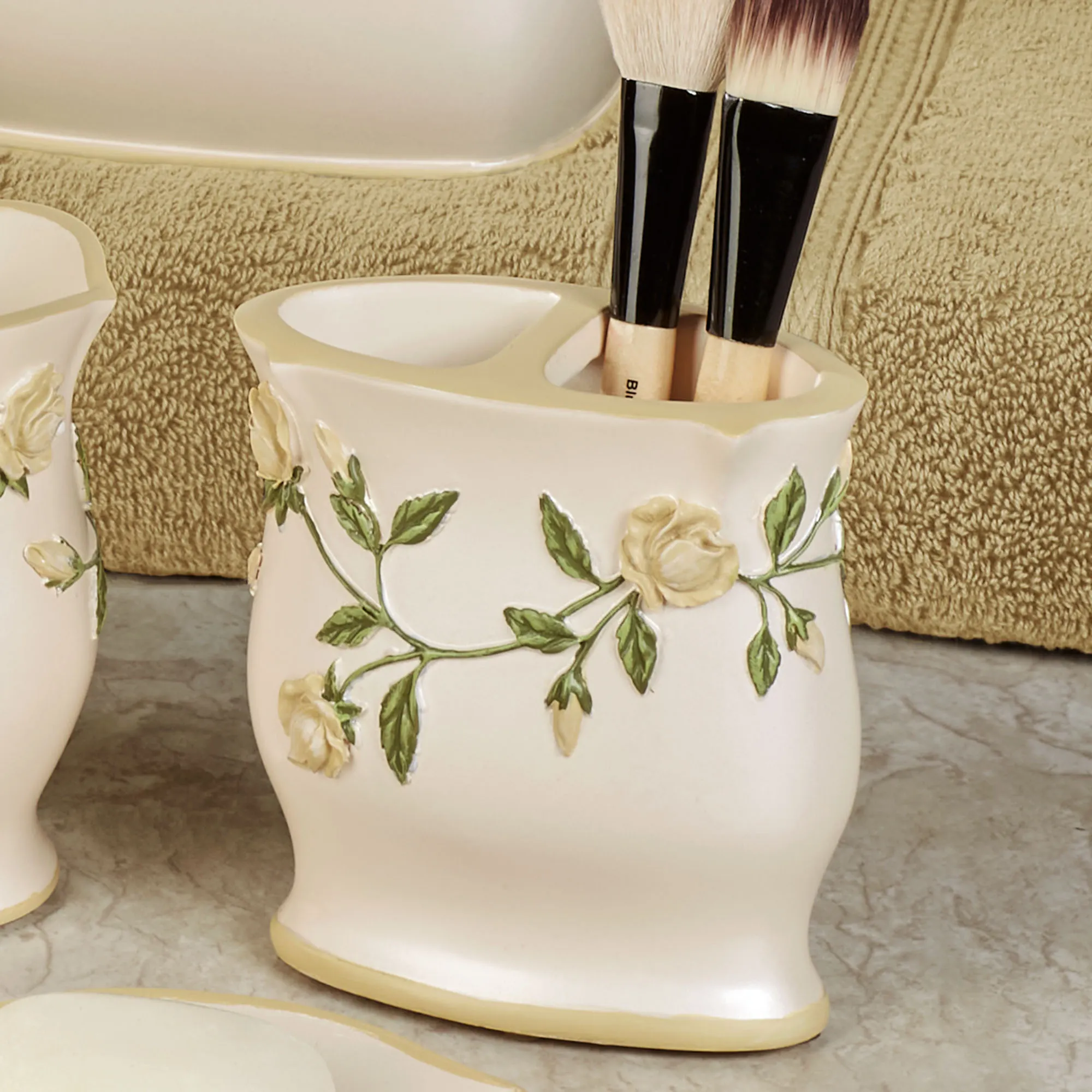 Brighten any bath space with the sweet Charlotte Rose Floral Bath Accessories. Accented with buttercream trim, each pearlescent resin bath accent features handpainted dimensional buttercream roses and trailing green vines across the stylized shape. The Brush Holder can be used to hold your toothbrushes or makeup brushes. The Covered Jar has a rose handle on the removable lid. Specify Brush Holder, Covered Jar, Lotion/Soap Dispenser, Soap Dish, Tissue Cover, Tumbler, Tray, or Wastebasket.
