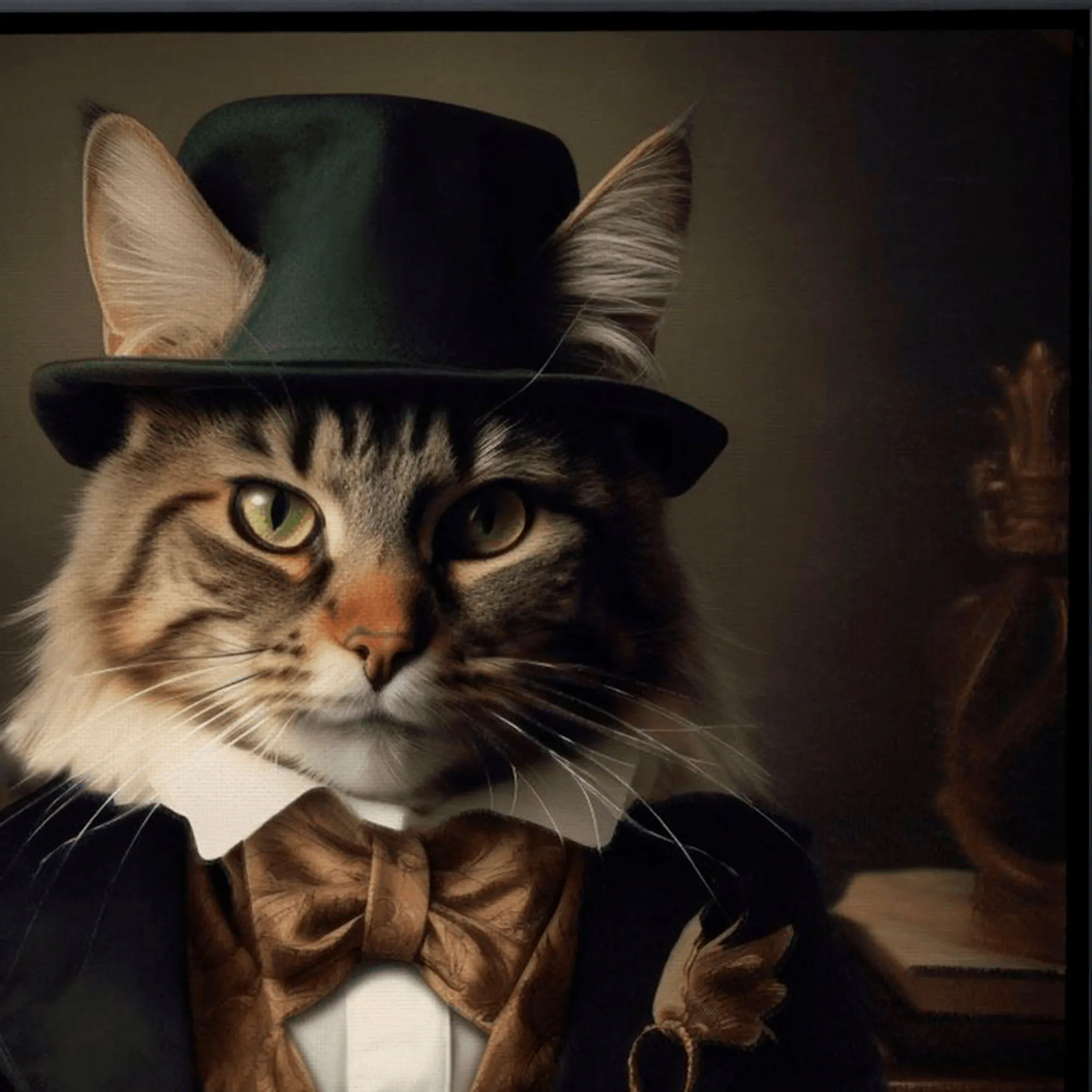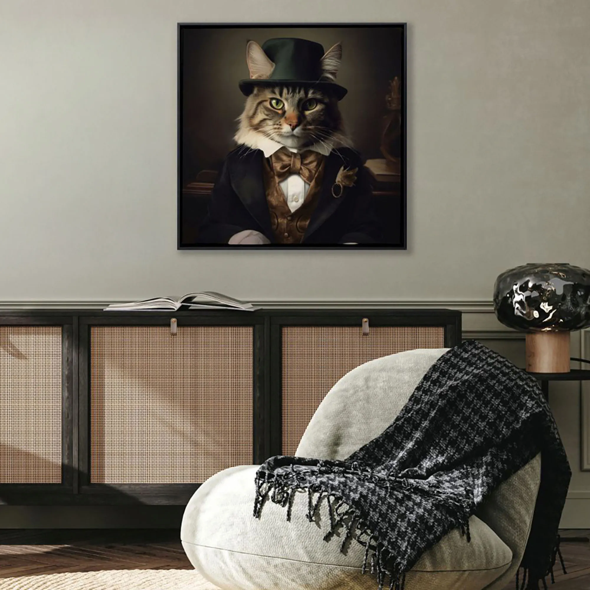 Charming Vintage Style Fancy Victorian Cat in Top Hat Portrait Framed Canvas Wall Art
