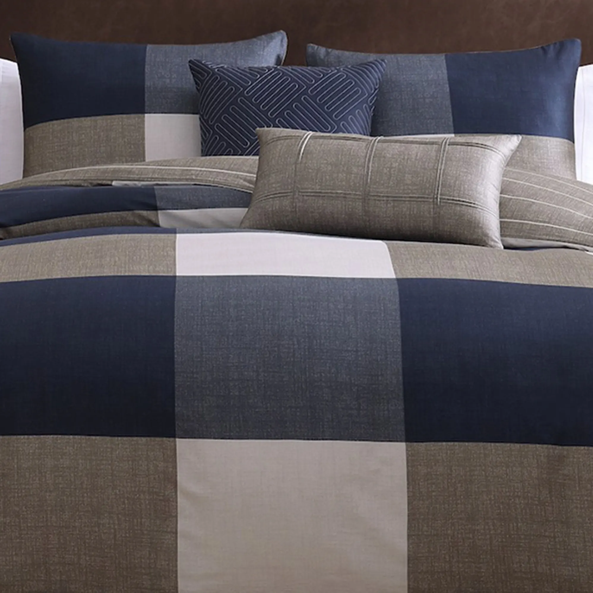 Dress your space with the classic tailored look of the Checkered Bedding. The 5-piece Bed Set includes a comforter, 2 shams, and 2 accent pillows. With a slubbed look, the cotton sateen bedding ensemble features handsome dark blue, light taupe, and white hues in timeless oversized checkered plaid motifs. Oversized comforter has overscale plaid and reverses to light taupe with ivory pinstripes. Click on the Details tab to read about the other items. Fill is polyester. Machine washable; spot clean the pillows. Imported.