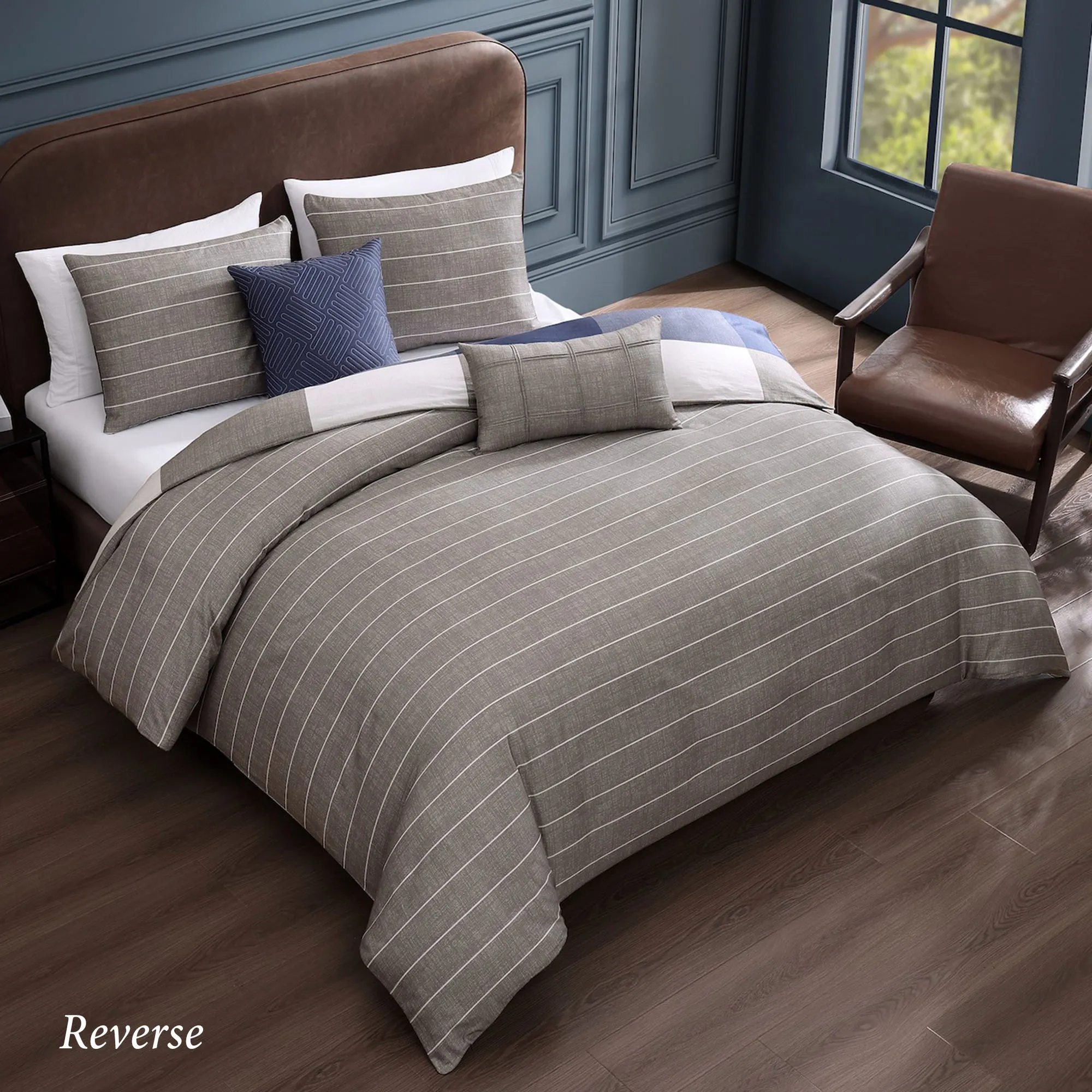 Checkered Block Reversible Dark Blue and Light Taupe 5 pc Comforter Bed Set