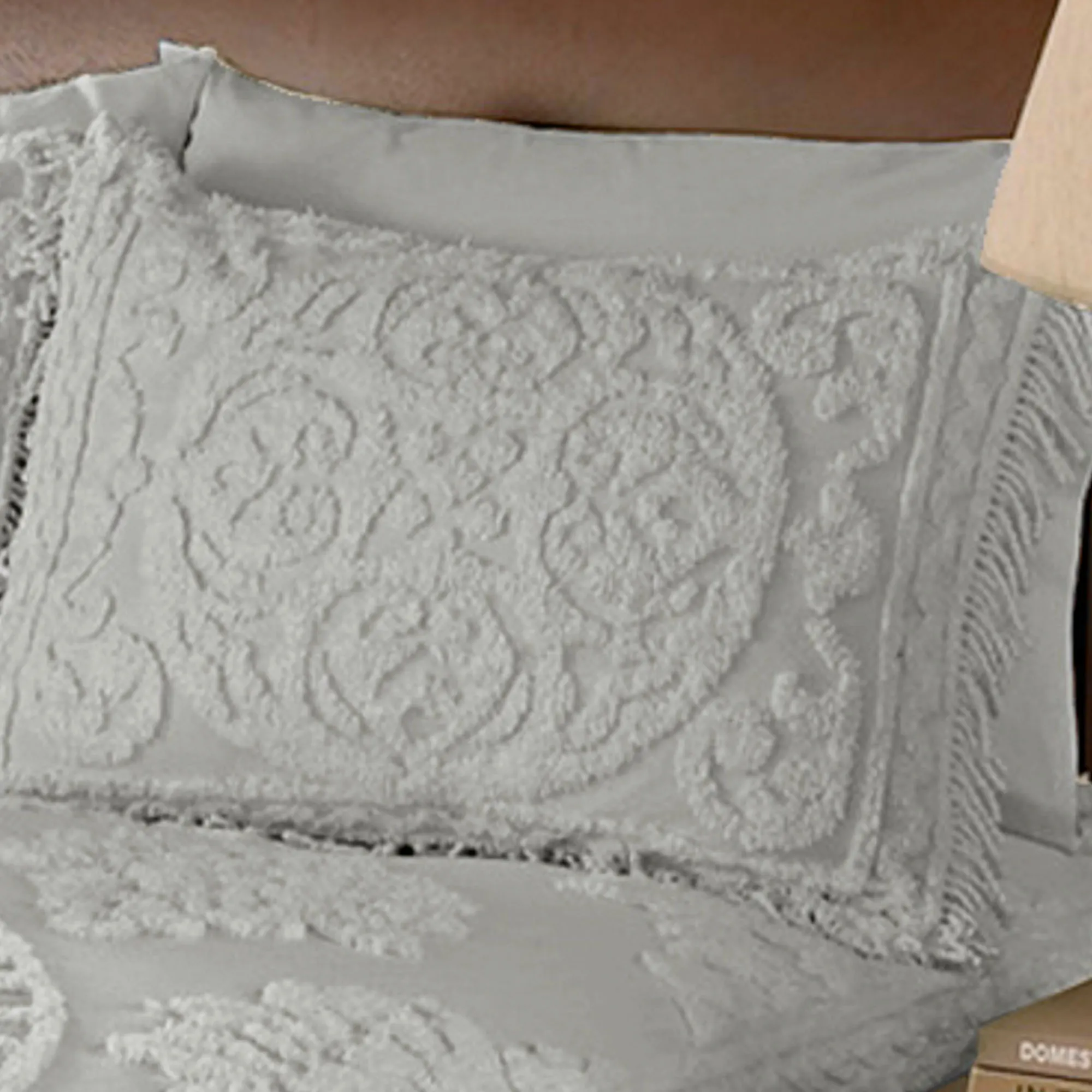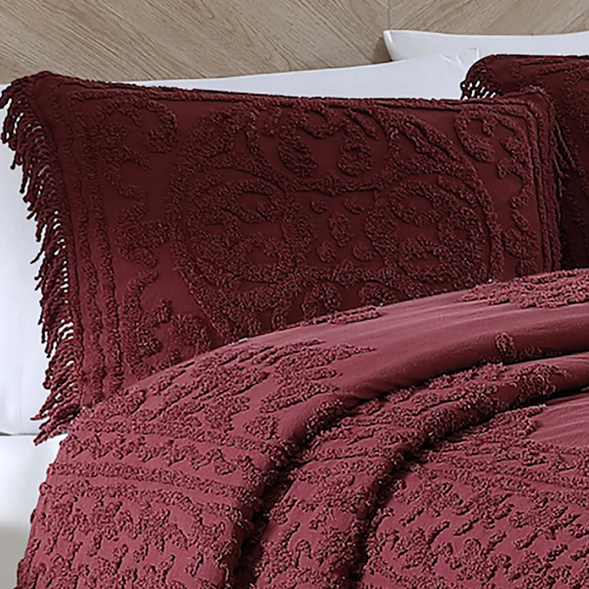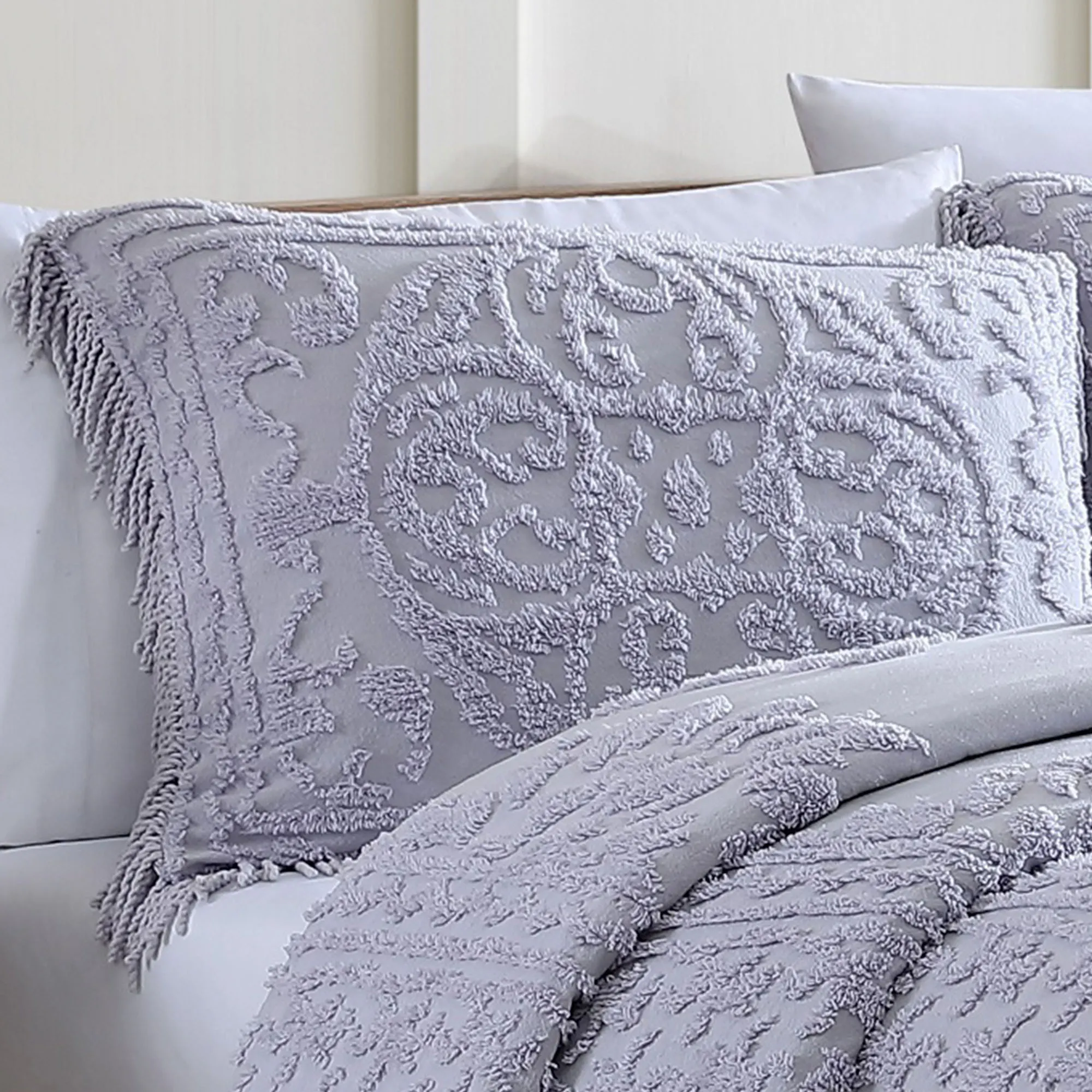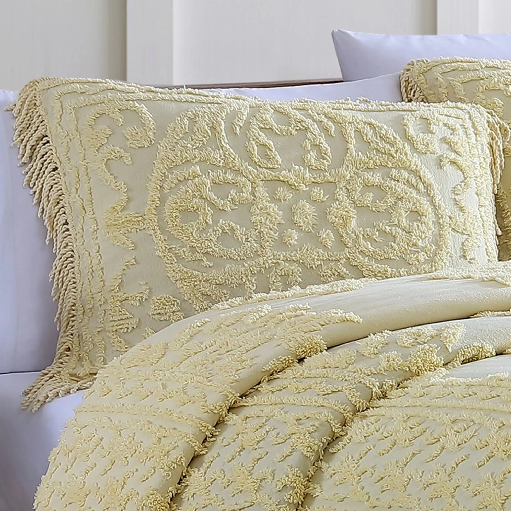 I love, love, LOVE the bedspread and the shams. The bedspread fits my queen guest bed like a glove and the shams fit beautifully on the standard size pillows. I would have LIKED to have given the order a five, but I cannot for the following two reasons: 1) in the picture of the bedspread on the Touch of Class website it APPEARS that the fringe is a contrasting color (such as gray to my old eyes) but when it came the fringe was the same color as the rest of the bedspread (ivory). I was a little disappointed but should not have been surprised. 2) I am "old school" in that I believe if I am ordering a King or Queen size bedspread I SHOULD be able to order king or (at least) queen shams which were not available with this bedspread. Very disappointing but the standard size shams are nice.