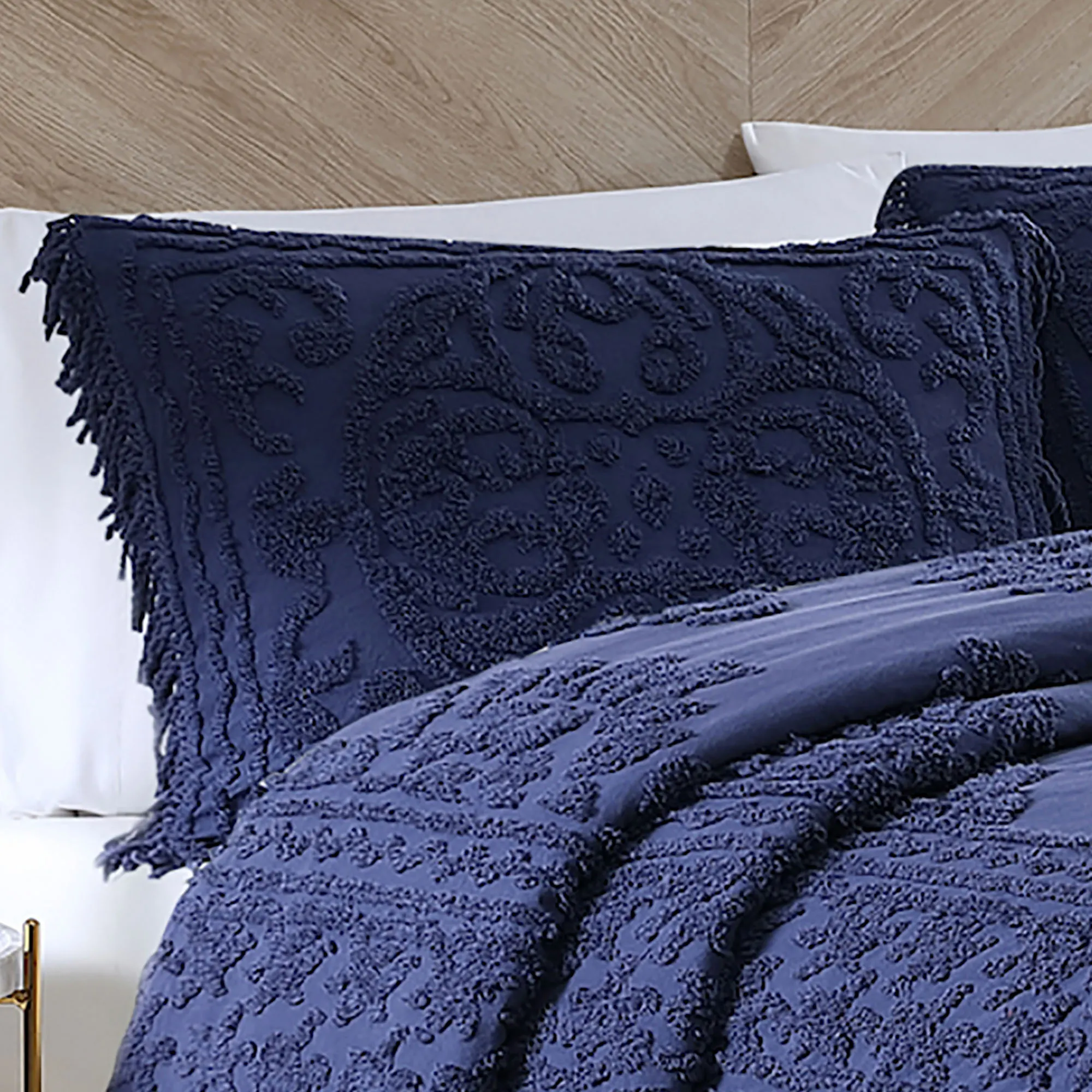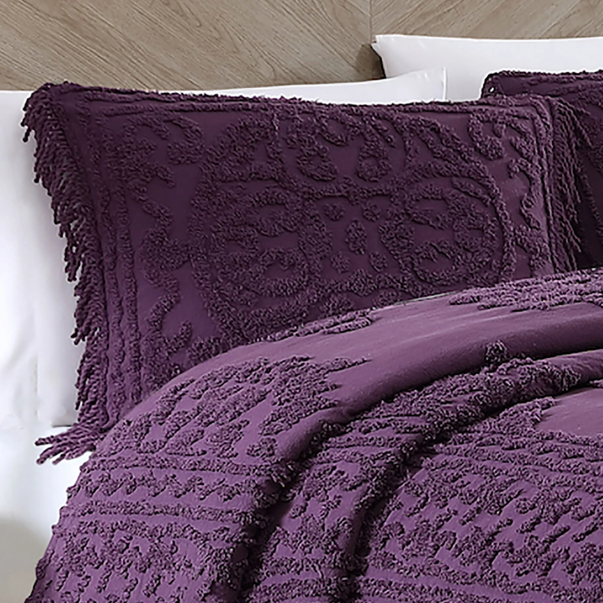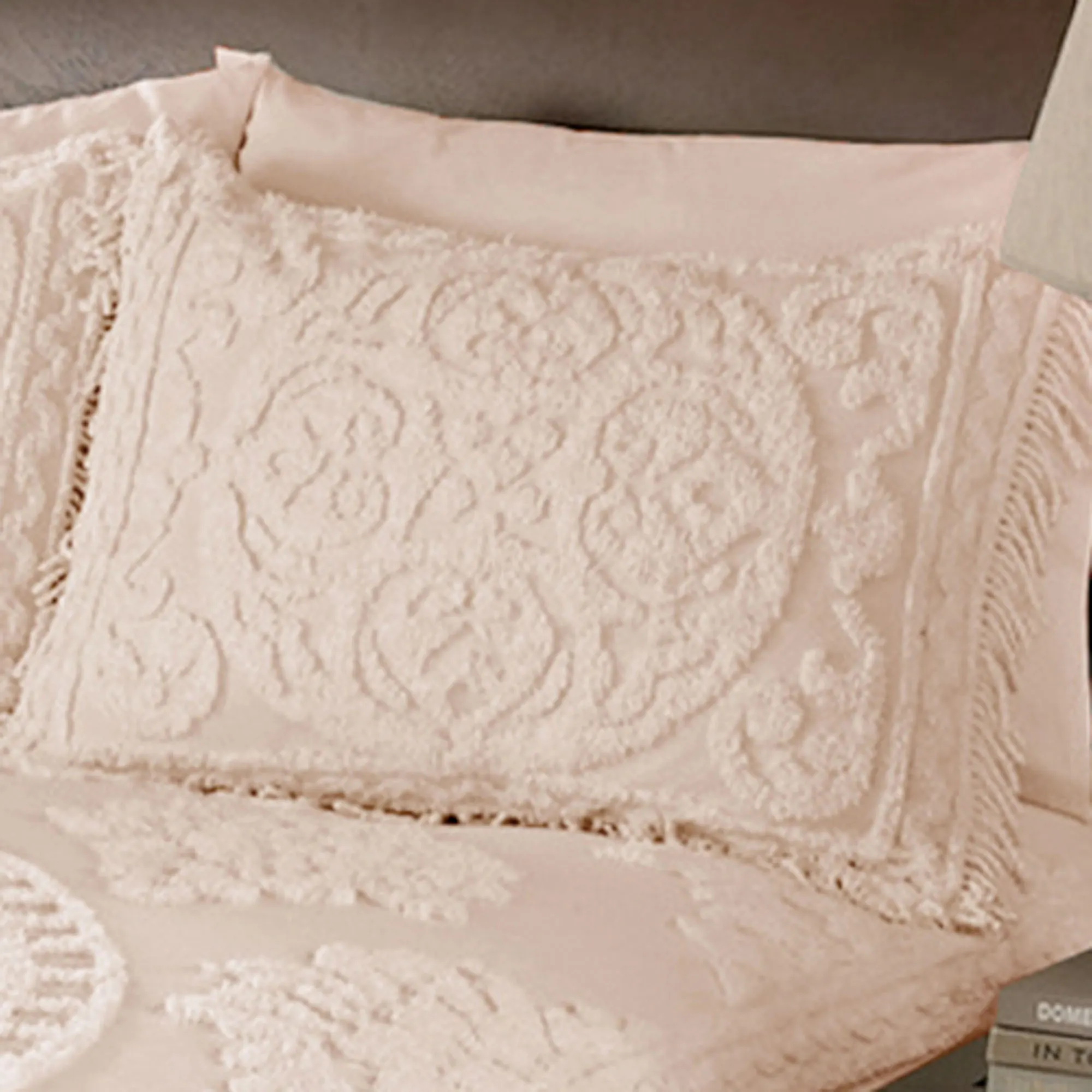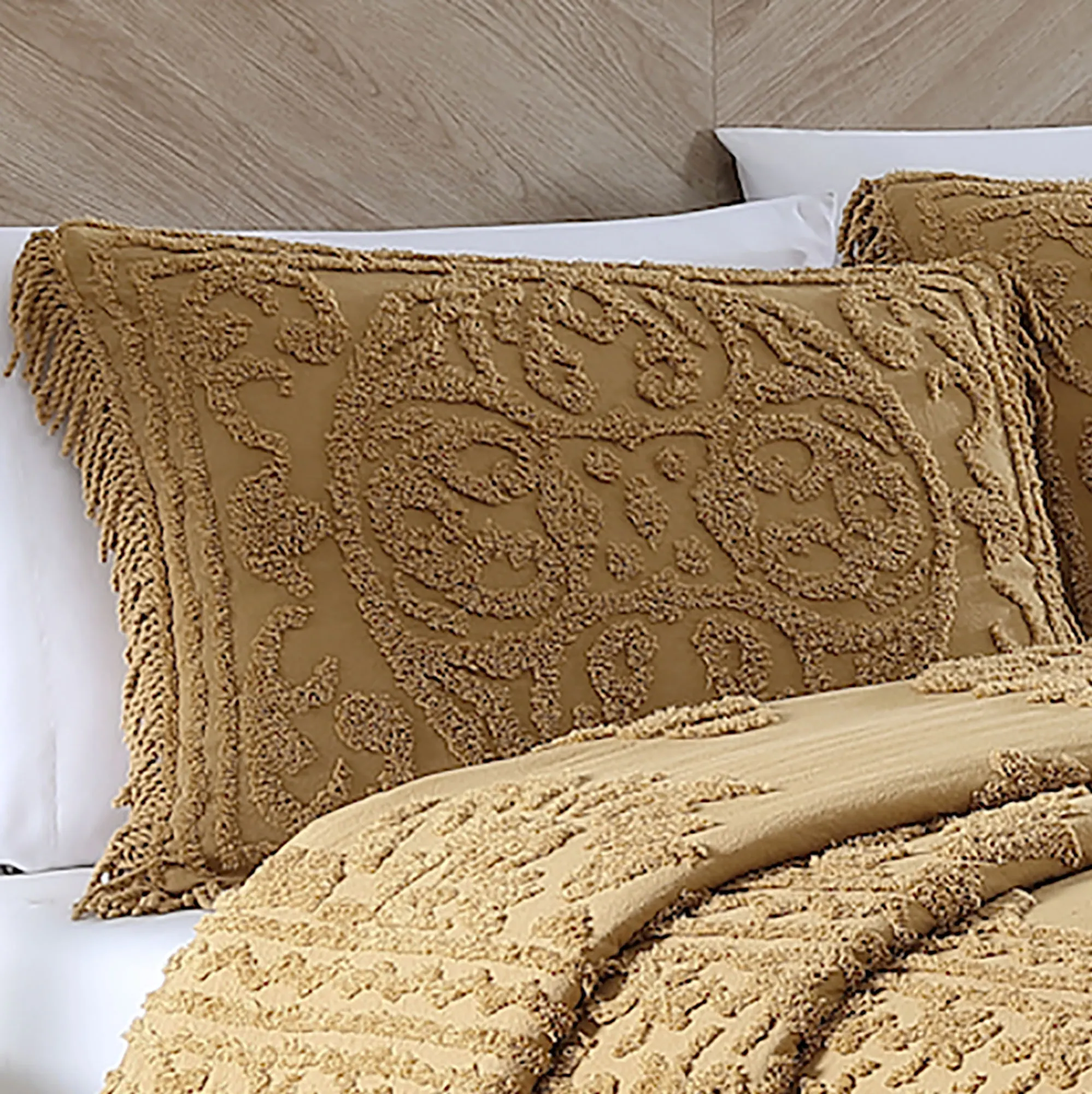 I love, love, LOVE the bedspread and the shams. The bedspread fits my queen guest bed like a glove and the shams fit beautifully on the standard size pillows. I would have LIKED to have given the order a five, but I cannot for the following two reasons: 1) in the picture of the bedspread on the Touch of Class website it APPEARS that the fringe is a contrasting color (such as gray to my old eyes) but when it came the fringe was the same color as the rest of the bedspread (ivory). I was a little disappointed but should not have been surprised. 2) I am "old school" in that I believe if I am ordering a King or Queen size bedspread I SHOULD be able to order king or (at least) queen shams which were not available with this bedspread. Very disappointing but the standard size shams are nice.