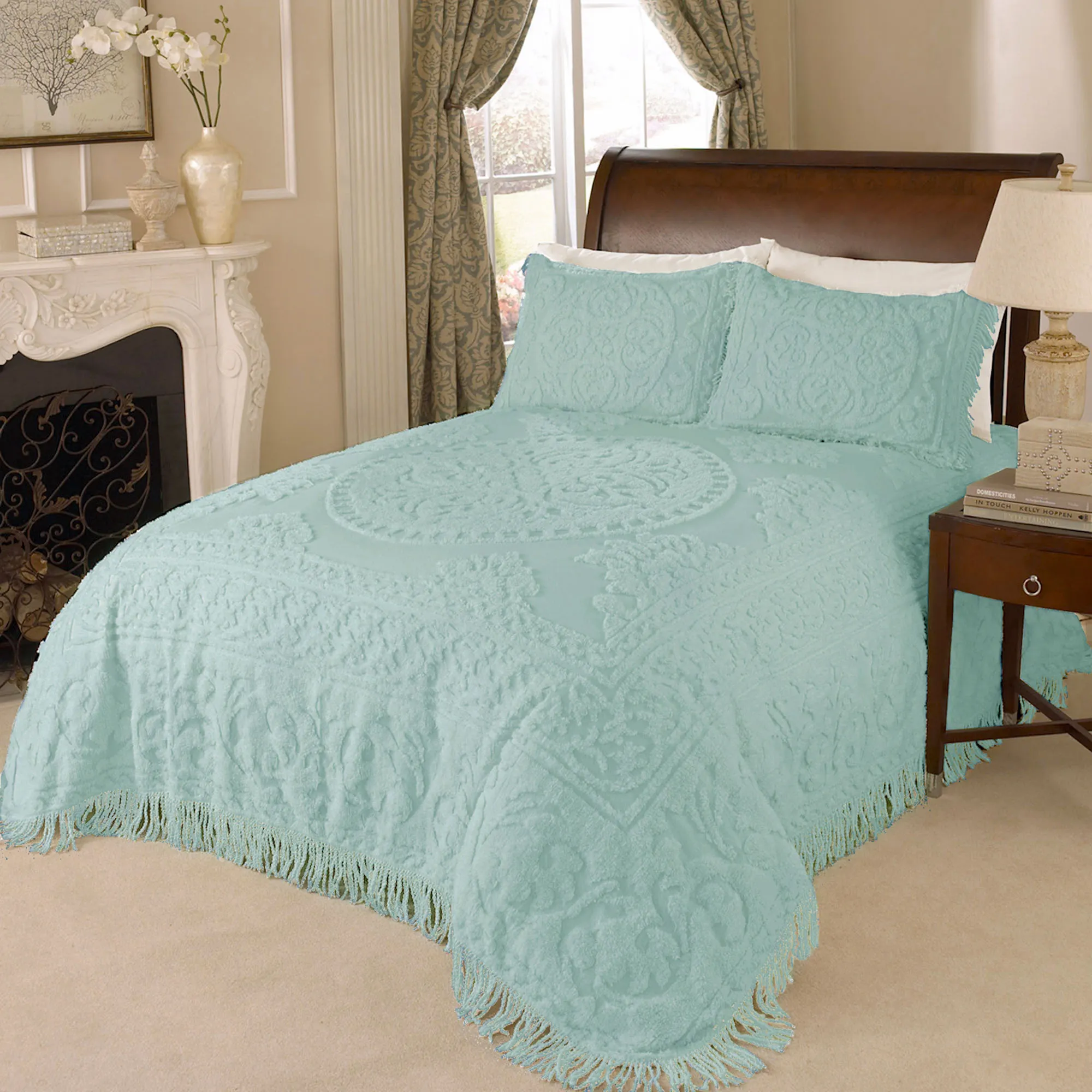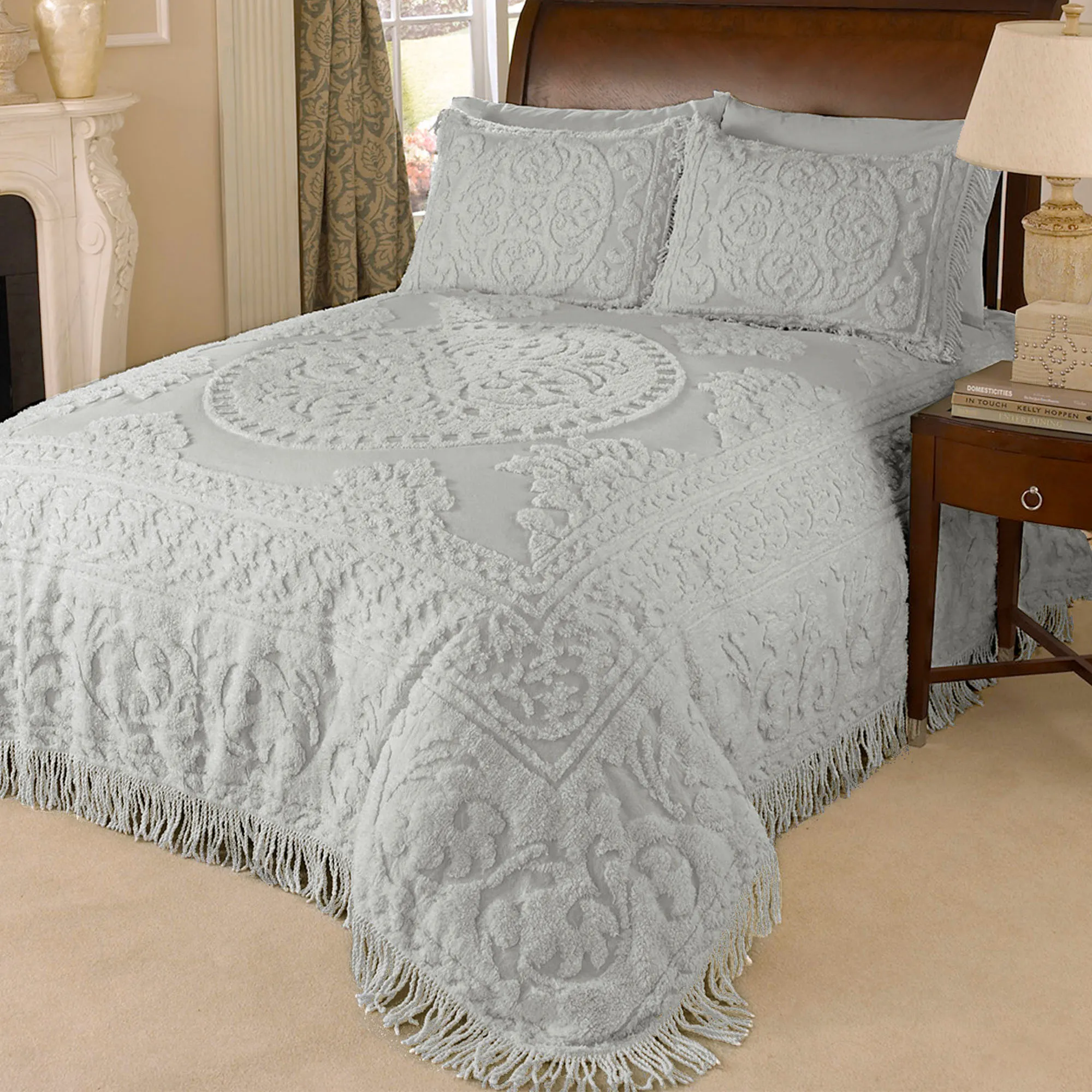 I love this Chenille Medallion Bedspread. The pattern works well with my decor and fits perfectly on the bed. So pretty.
