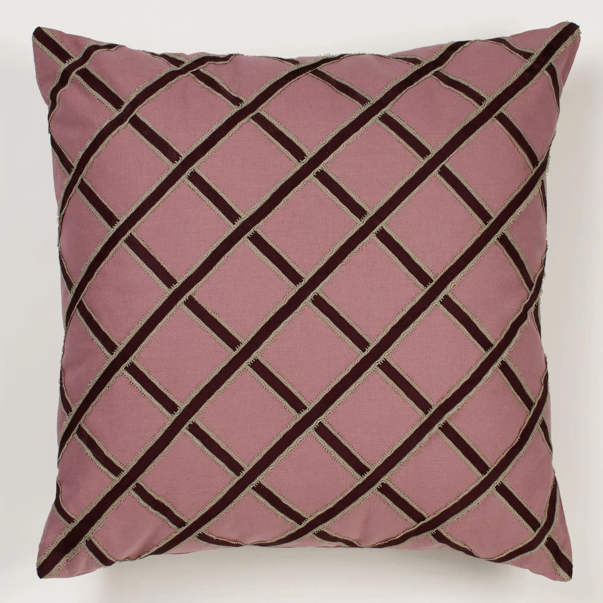CLOSEOUT PRICES! You are sure to Cherish this elegant cotton pillow. This pillow is warm rose with plum grosgrain ribbon and gray lace accents in a lattice pattern; zipper closure. The 22" square pillow is tailored. Pillow insert is polyester. Machine wash the pillow casing. Imported.