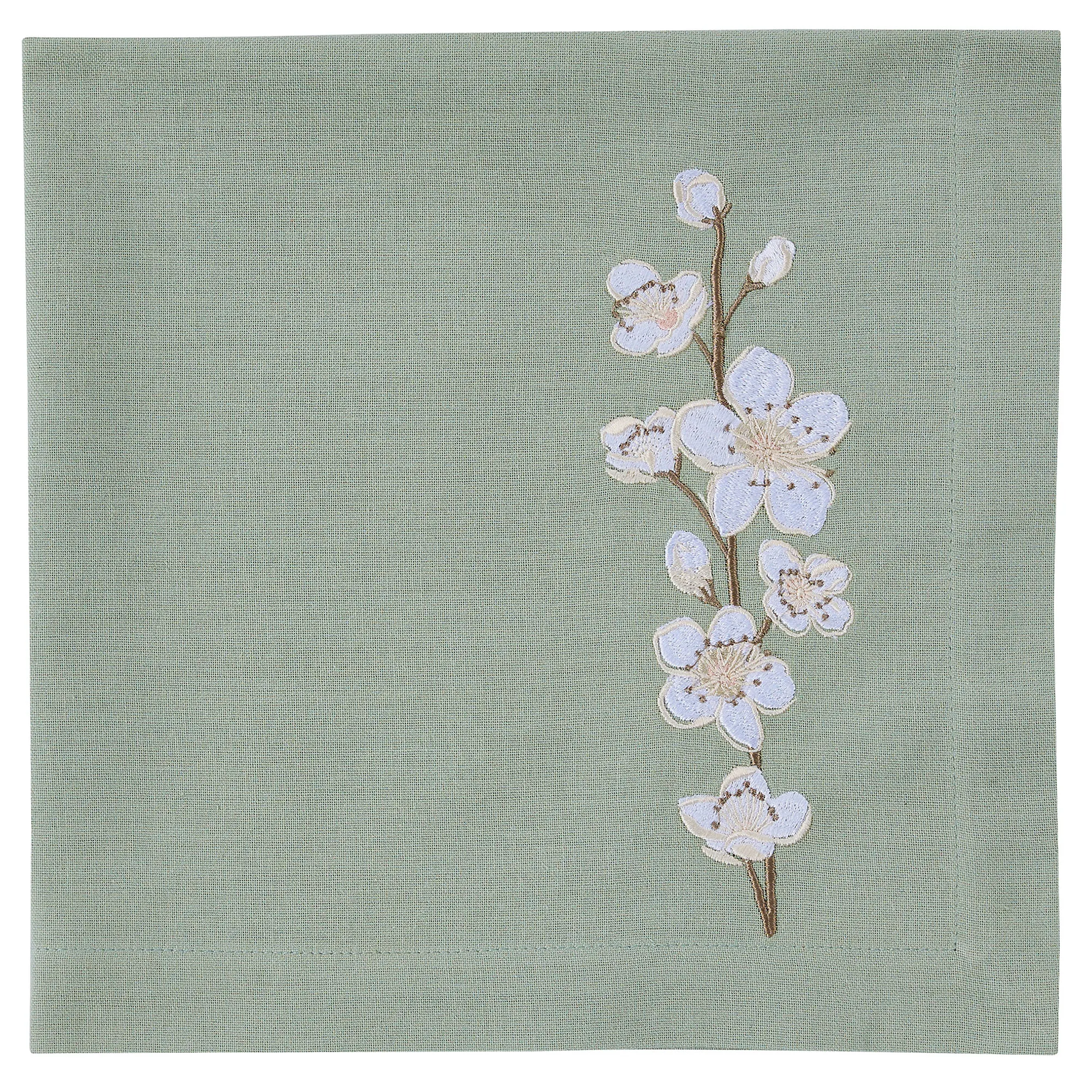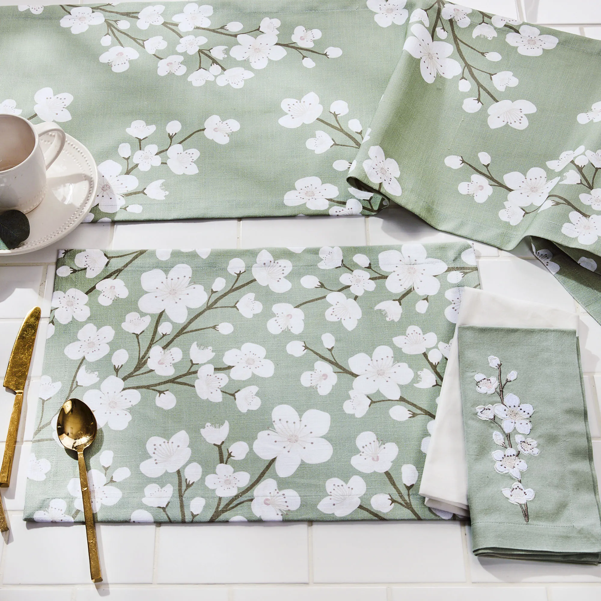 Dine among the Cherry Blossom branches. Soft white printed flowers bloom from the brown branches and soft sage green cotton table linens. The 14"x54 Table Runner has florals at each end. The 15"x72" Table Runner has florals along the sides. Placemats are 19"x13" each; sold as a four-piece set. Napkins have an embroidered sprig and measure 20" sq. each; sold as a four-piece set. Machine washable. Imported.