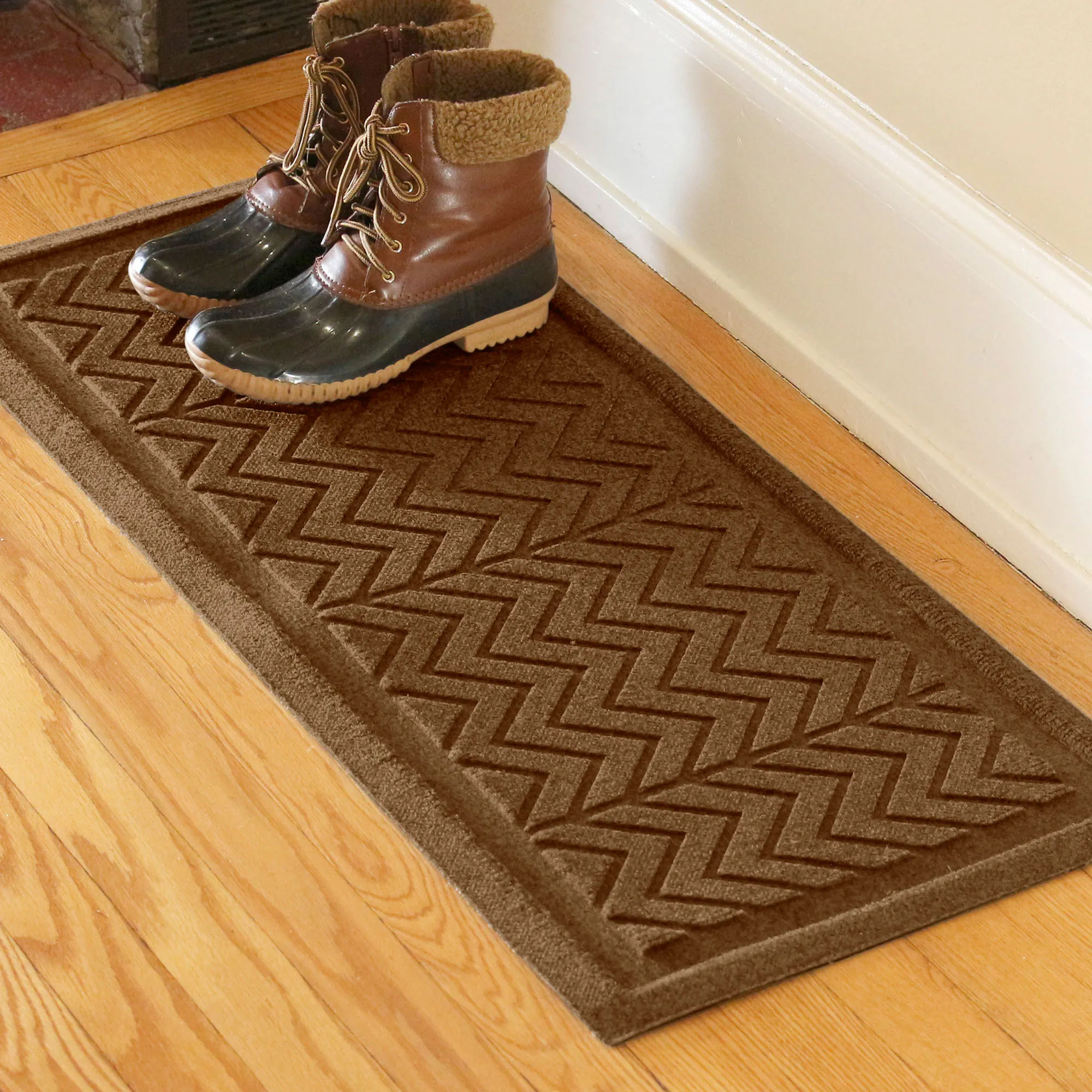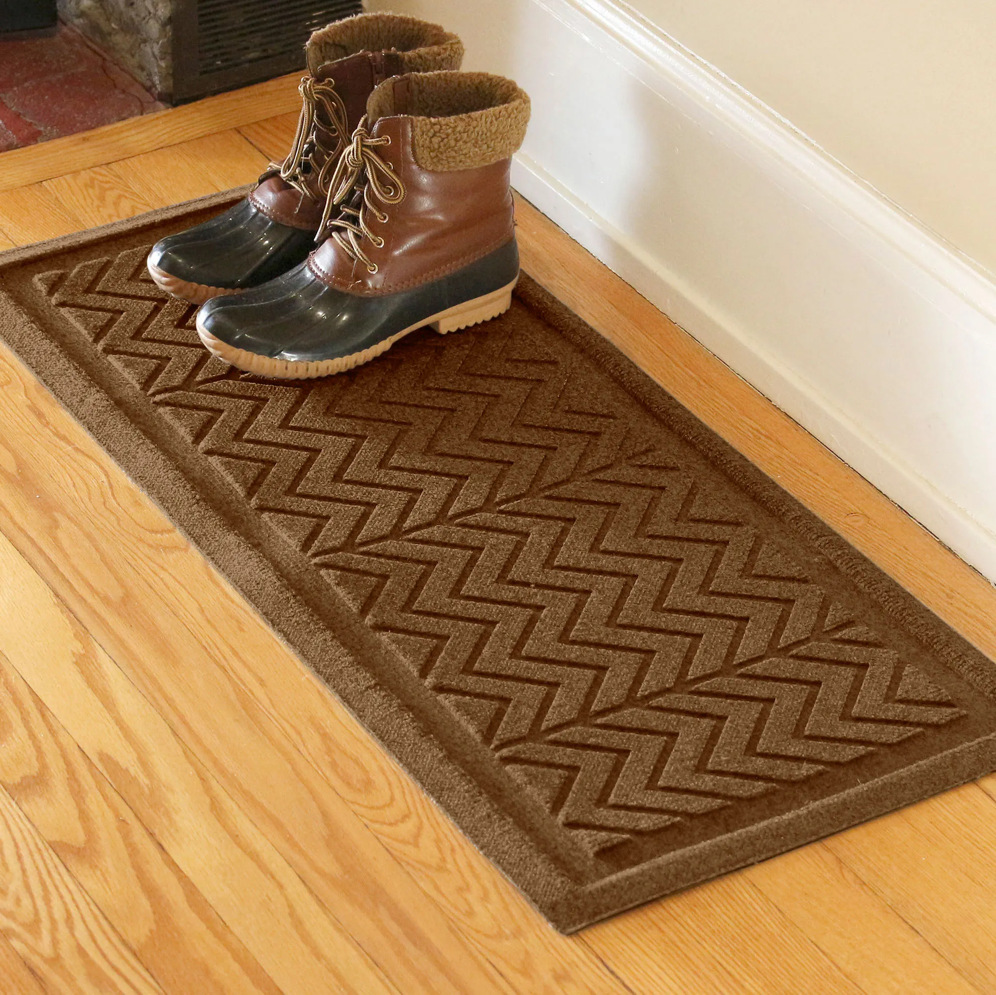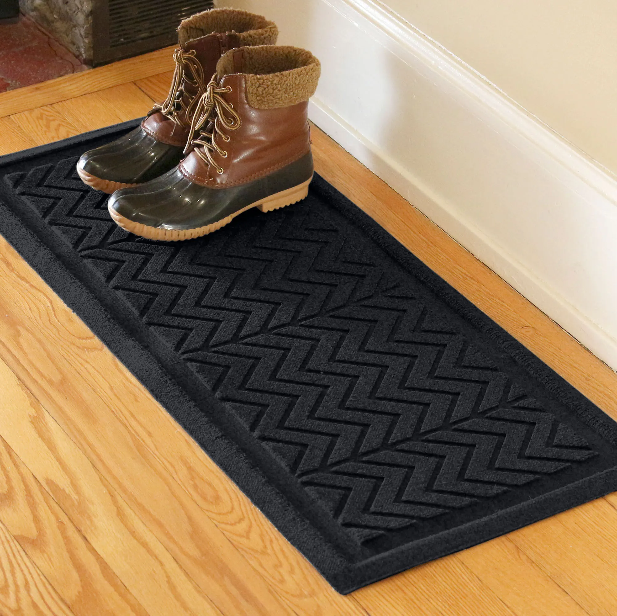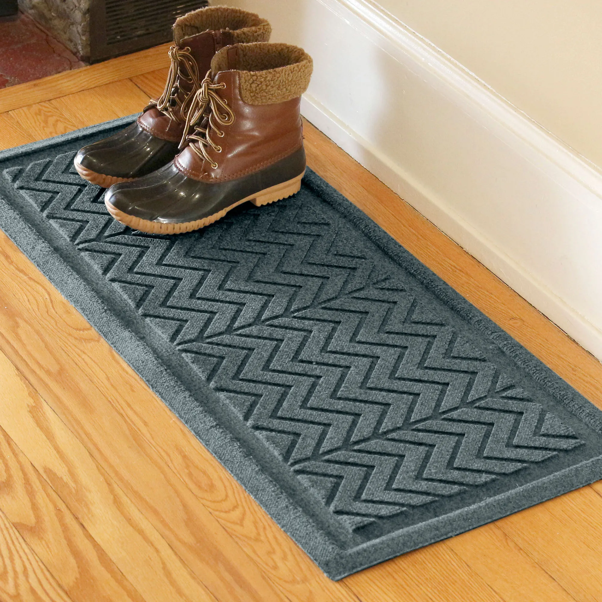 The Chevron Indoor/Outdoor Boot Tray Mat adds fun charm to your entryway. The antistatic PET polyester fiber floor accent has a slip-resistant SBR rubber backing that is skid-resistant and certified by the National Floor Safety Institute. The WaterHog(R) exclusive Water Dam border keeps dirt and water on the mat and not your floor. Mat is mildew-, mold-, and rot-resistant. Boot tray easily absorbs snow and water, scrapes away dirt and debris via the high-low surface texture, and holds up to one gallon or square yard of water. Specify Dark Brown, Charcoal, Gray, Khaki, or Slate Blue; some mats are also available in Burgundy, Dark Green, and Navy. Boot tray mat is 36"x15". Indoor use or outdoor use year round. Hose off to clean.