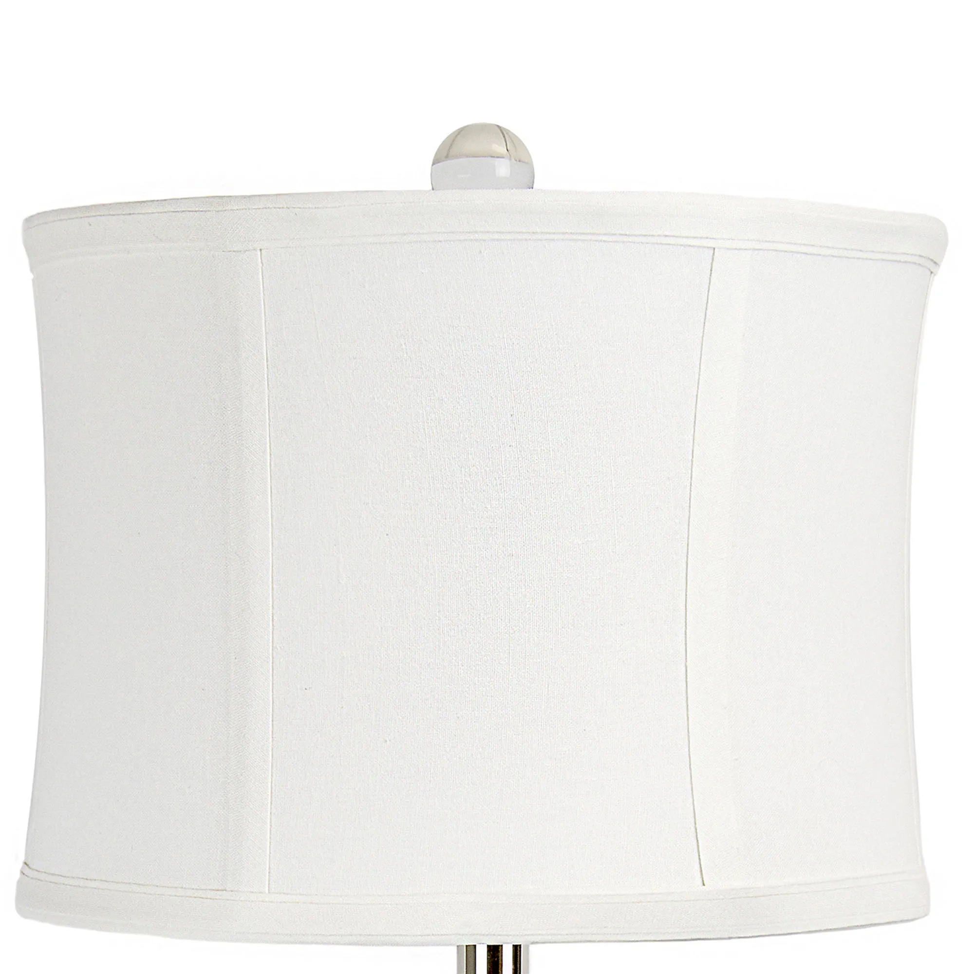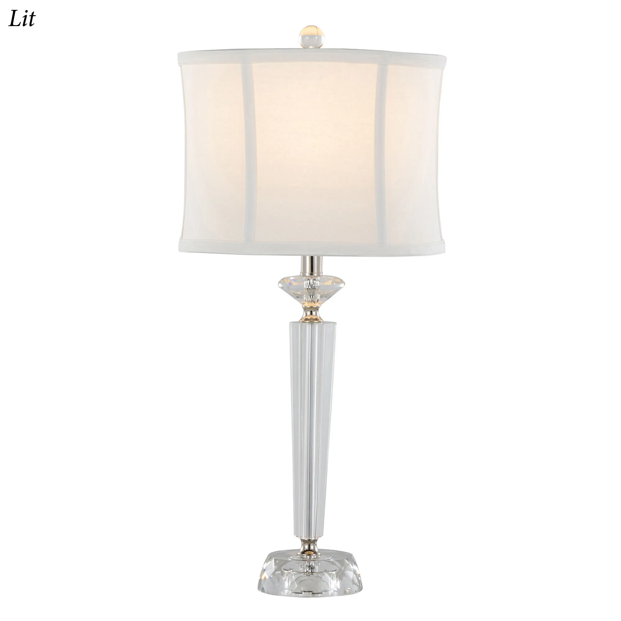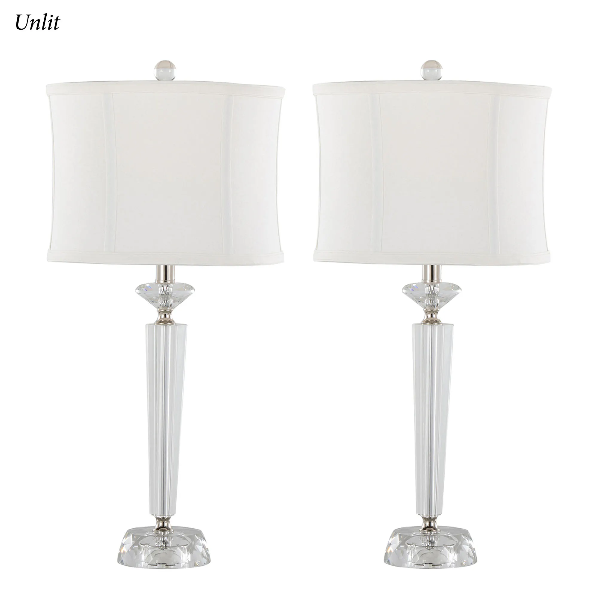 The Chiara Crystal Table Lamp Pair displays brilliant elegance. These refined, clear crystal lamps have candlestick-style fonts topped with diamond accents and metal accents with a polished nickel finish. The off-white shades are linen fabric. UL listed. Each lamp requires one 100W max. bulb, not included, and measures 12"dia.x26"H, including the 1.75" crystal finial. Pair weighs 12 lbs.