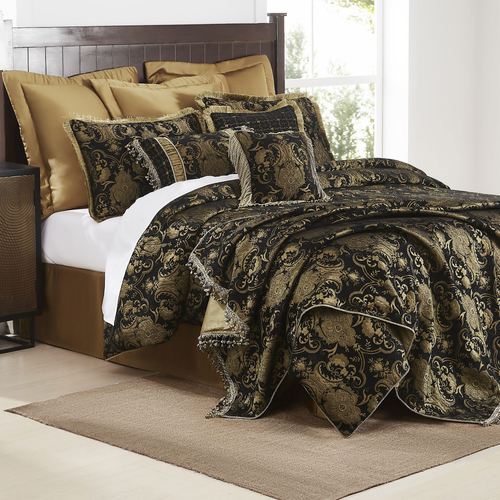 The Comforter Set includes comforter and two shams. Oversized comforter fits mattresses up to 15". Comforter has woven motifs on a black chenille background, twist cording, and a gold cotton backing. The shams mimic the comforter and have brushed fringe on the ends; French back closures. For comforter set, choose Queen or King.