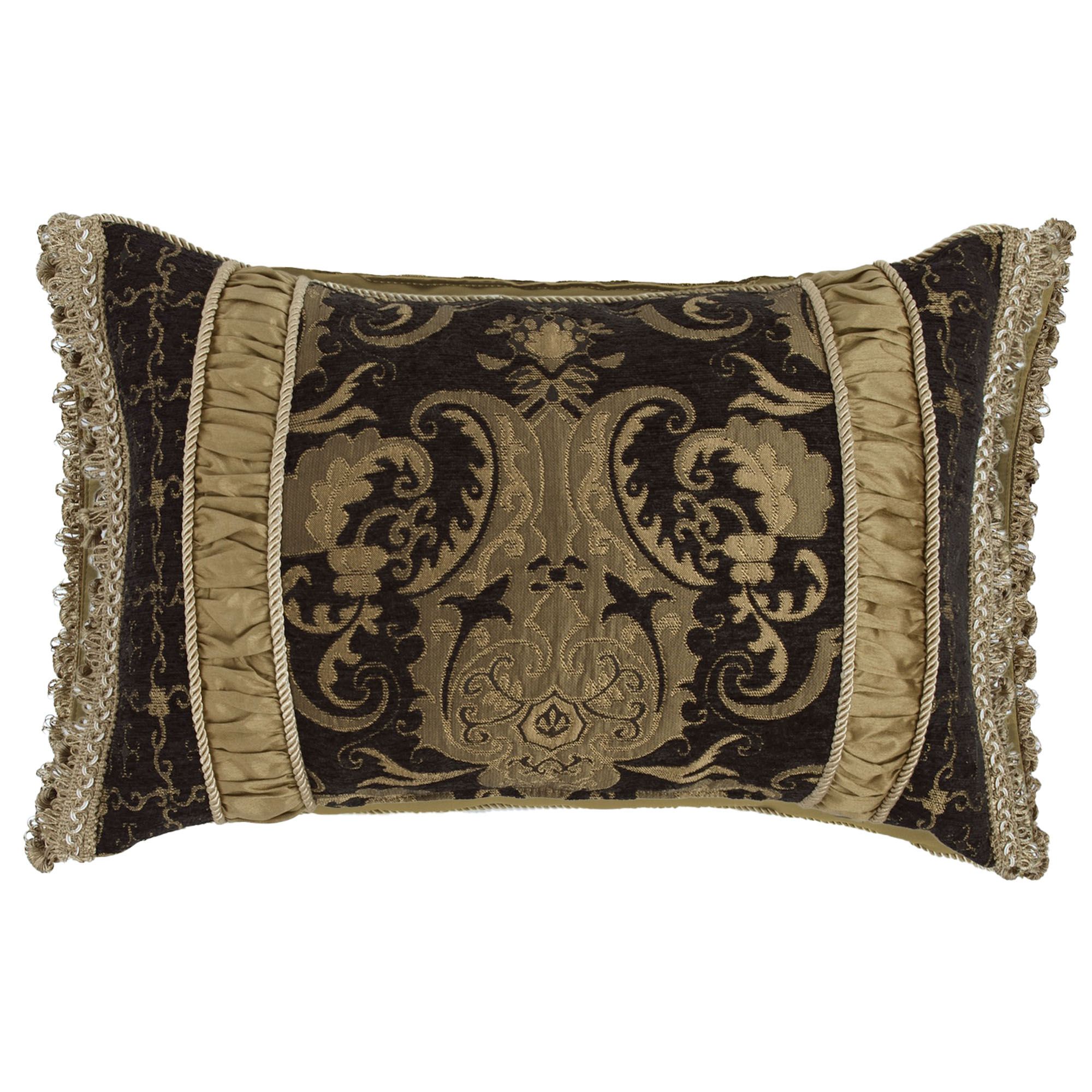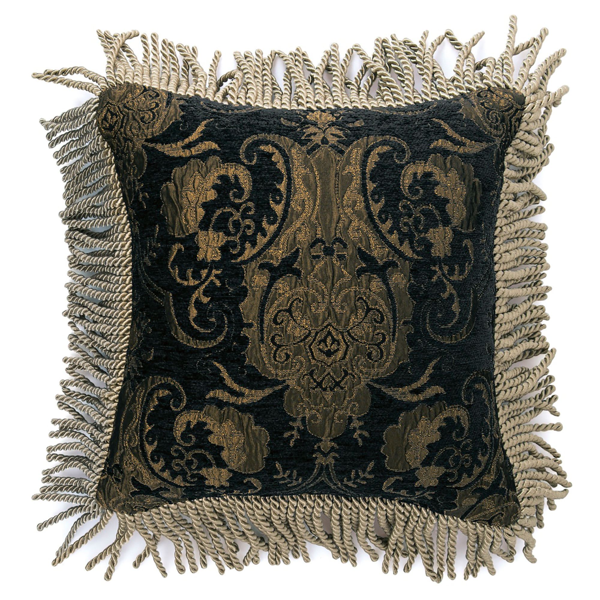 Pillows: Spot clean. Rectangle has woven motifs on black chenille, ruched gold shantung bands, twist cording, and tassel accents. The 13" Square has woven motifs on black chenille and 4.5"L bouillon fringe. The 20" Square has gold scrolls on black chenille and brushed fringe.