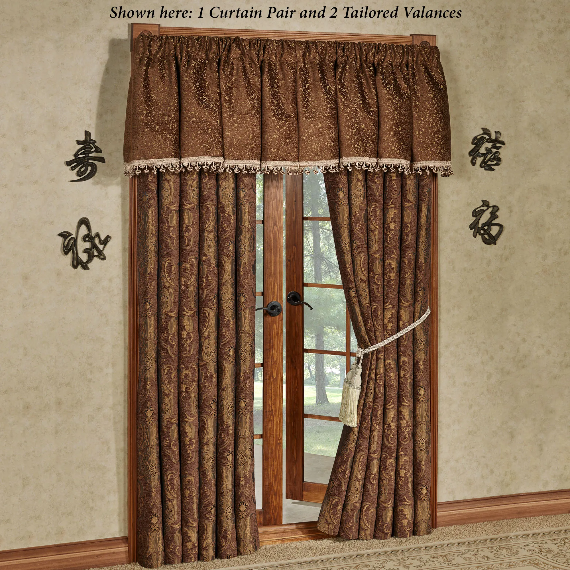 Tailored Window Treatment is lined. Wide Curtains have woven jacquard designs and a 3" rod pocket. Fabric tiebacks are included (tassel tiebacks shown are not included). Valance has dark brown chenille on dark gold with gimp trim and onion fringe. Rod pocket is 4".
