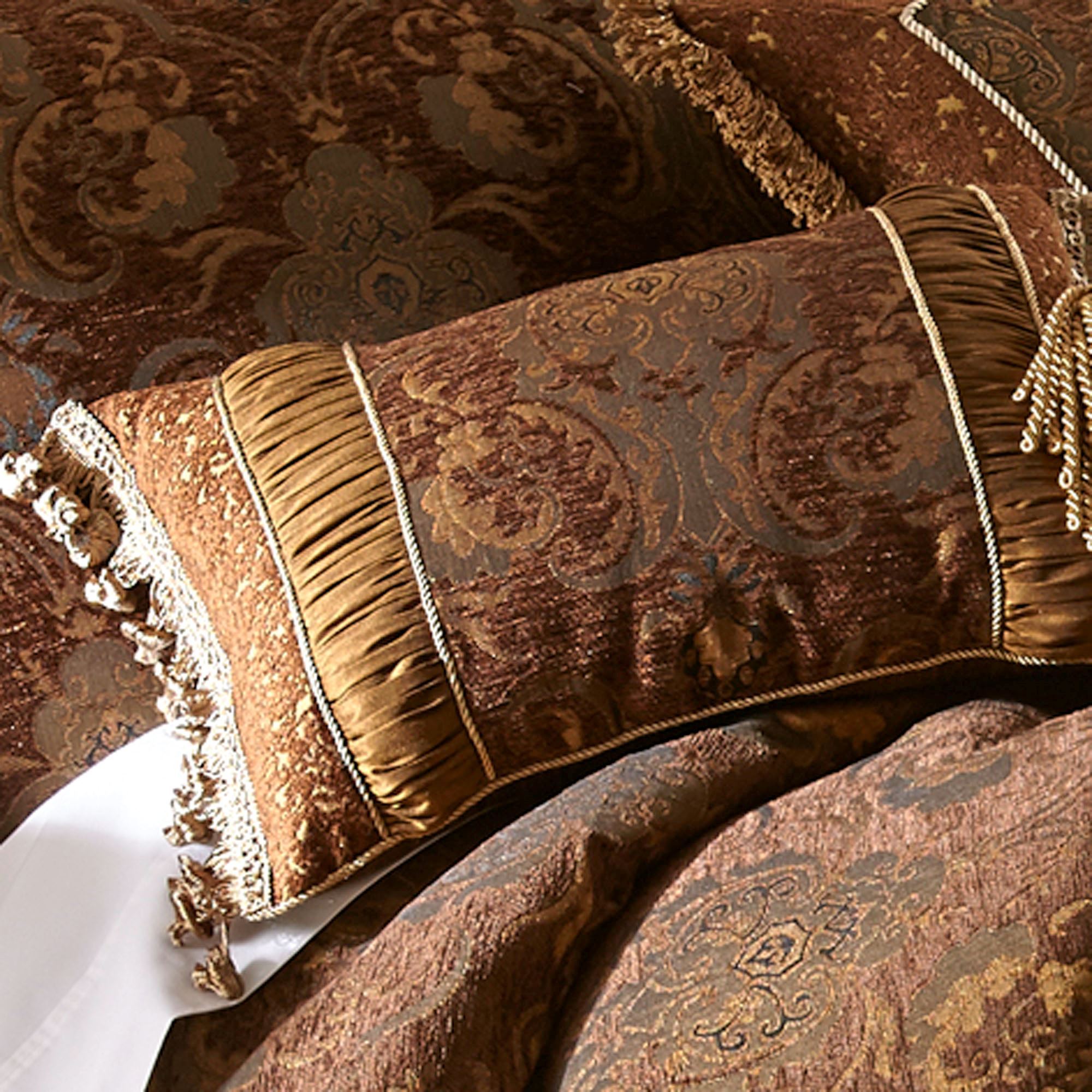 Pillows have polyester fill. Spot clean. The Fringed 14" Square mimics the comforter and is trimmed with 4.5"L bullion trim. Rectangle has jacquard designs, dark gold shantung ruching, chenille accents, twist cording, and onion fringe. The Framed Corded 20" Square has jacquard designs, chenille accents, twist cording, and brushed fringe. The Fringed 20" Square has jacquard designs and brushed fringe.