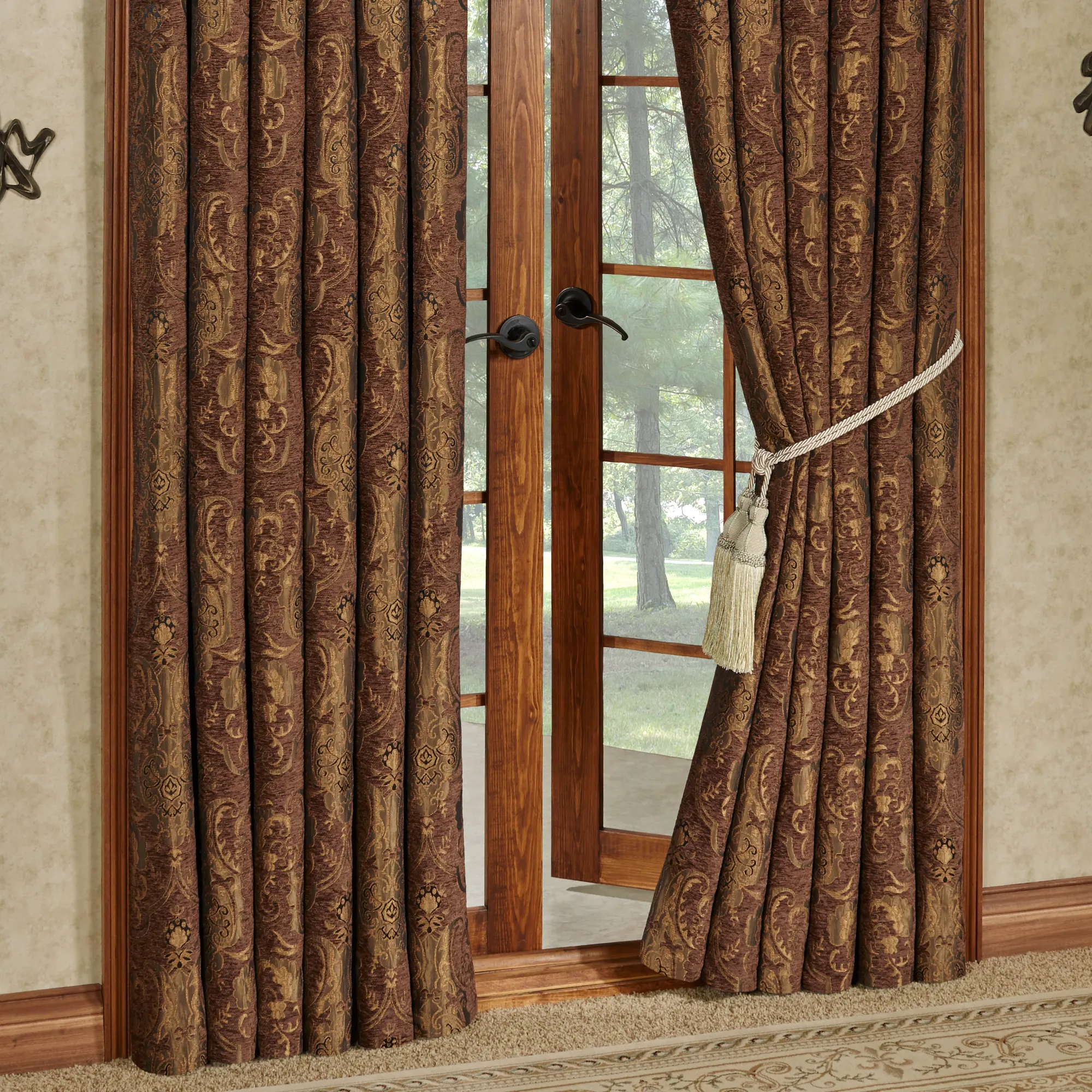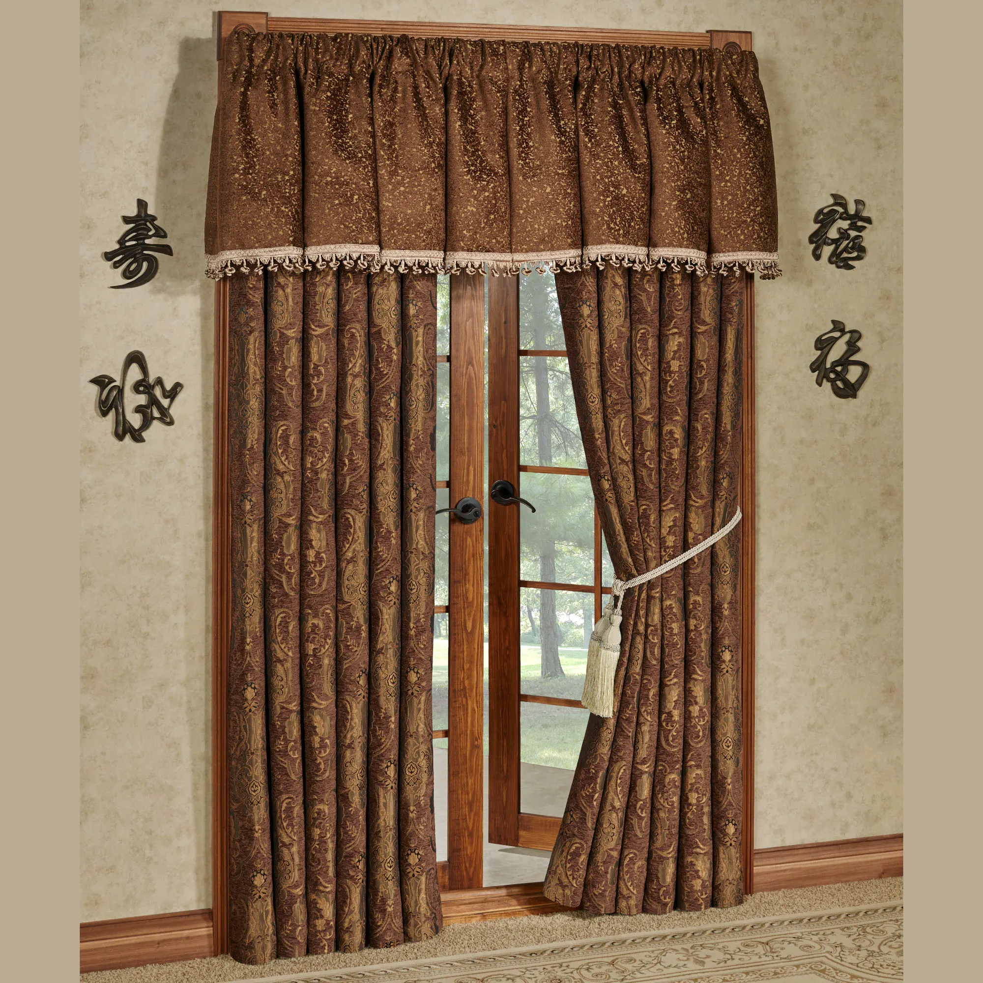 The China Art Brown Window Treatment by Sherry Kline has a rich, exotic flair that will add spice to your room. The tailored, polyester window treatment is lined. Specify Wide Curtain Pair or Valance (no longer available). Wide Curtains have a dark brown chenille background with Asian-inspired, woven jacquard designs in shades of dark gold and black. Curtains have a 3" rod pocket. Fabric tiebacks are included (tassel tiebacks shown are not included). Valance has dark brown chenille on dark gold with gimp trim and onion fringe. Rod pocket is 4". Dry clean. The curtain pair width is the total width of two panels together.