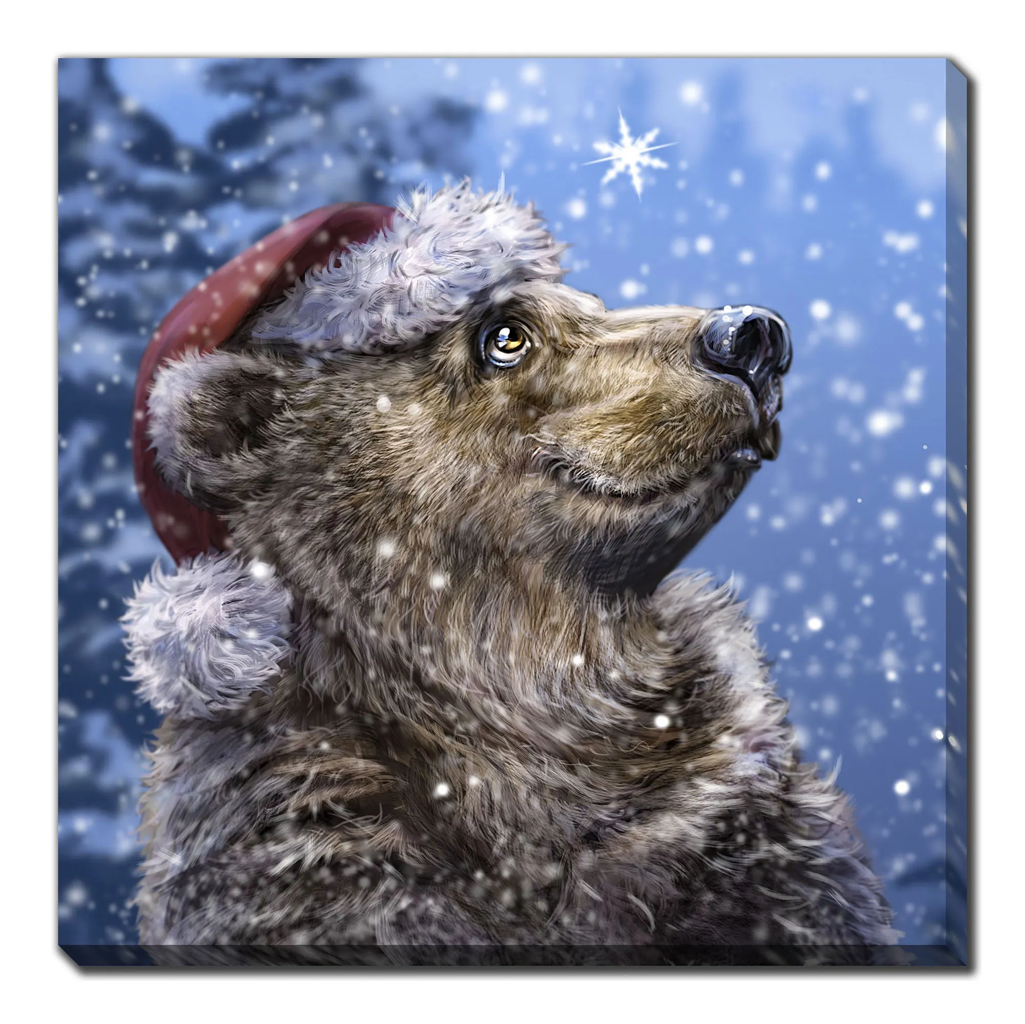 Nothing delights the Christmas Bear more than freshly fallen snow just in time for Santa's arrival. Wearing his favorite red Santa hat, the brown bear watches the falling snow with a smile on his face. Gallery-wrapped over a wooden frame, the canvas wall art features handpainted gel embellishments. Overall, the Christmas bear canvas measures 27"sq.x1.5"D.