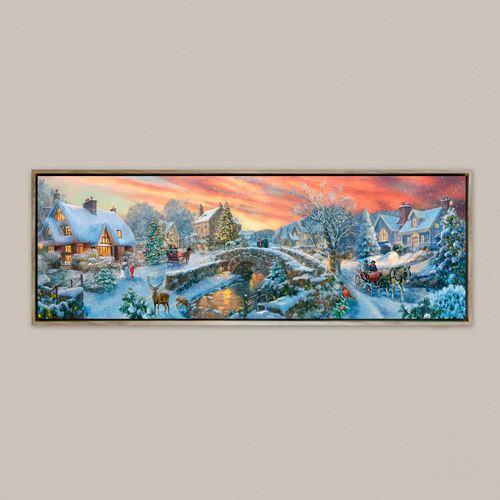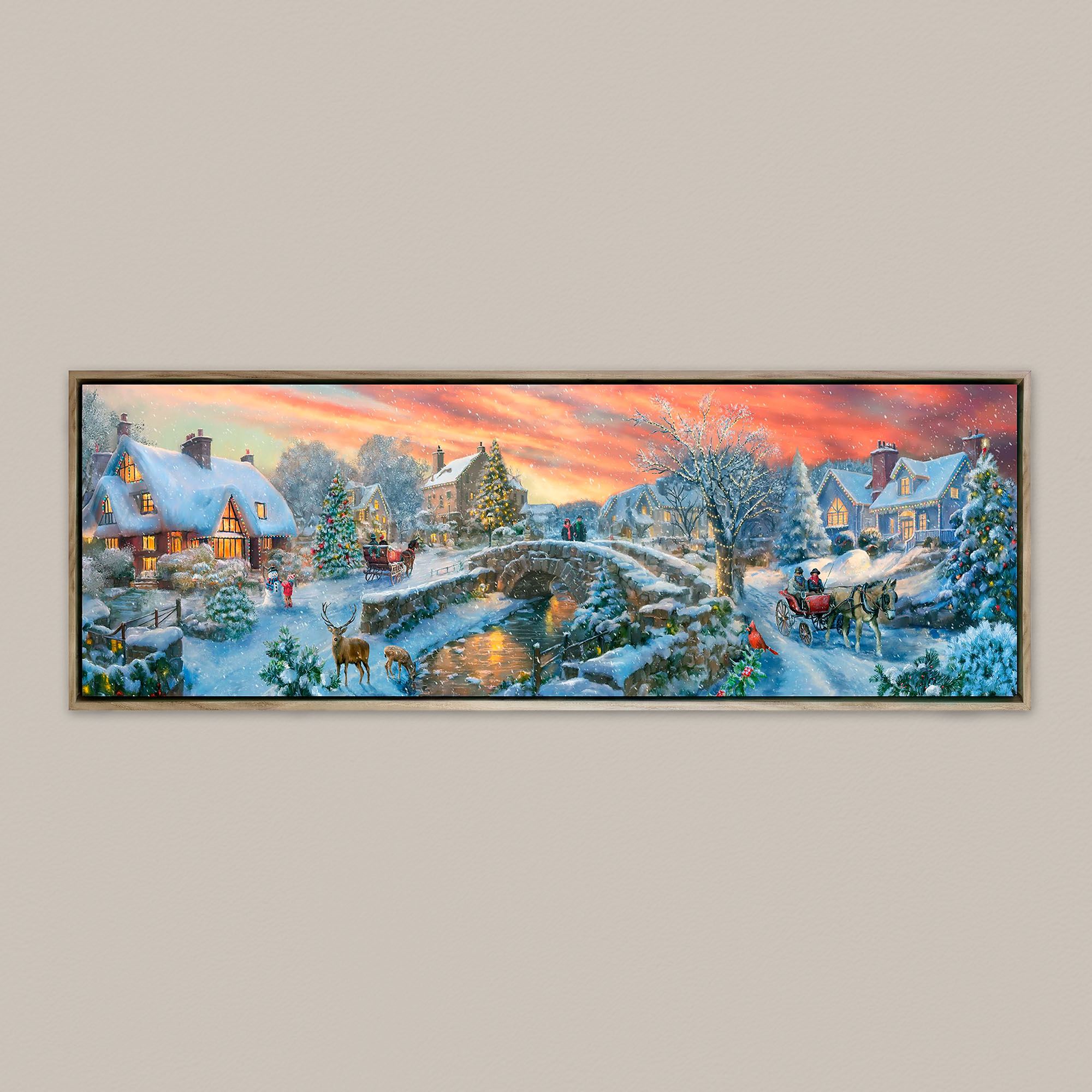 The Christmas Bridge Framed Canvas exudes a picturesque holiday nostalgia. Adorned with handpainted gel embellishments, the canvas wall art features a beautiful snowy village complete with grand houses, decorated trees, two deer, a cardinal, horse-drawn carriages, a child building a snowman, and two people walking over the center bridge. Complete with a floating-style brown barnwood-like polystyrene frame, the Christmas wall art measures 37.5"Wx2"Dx13.5"H.