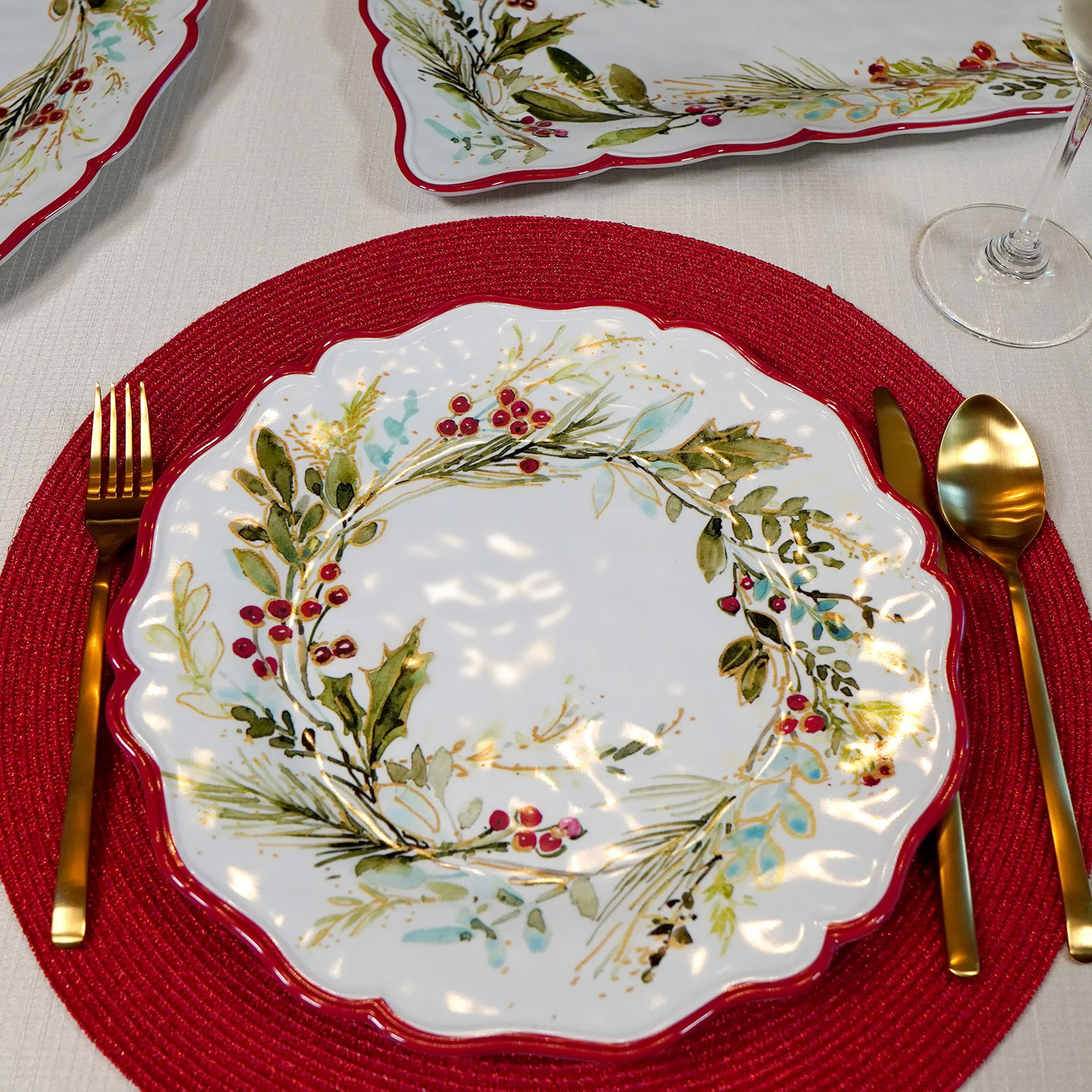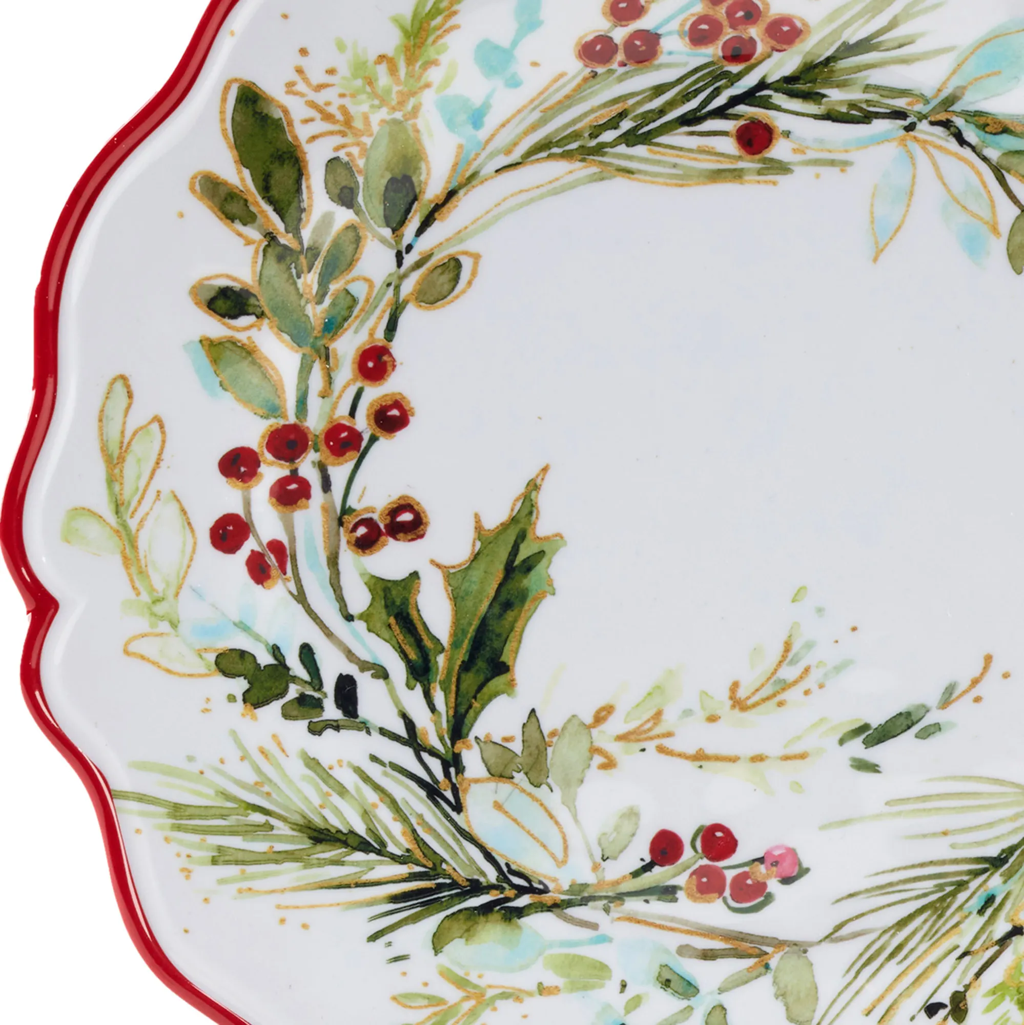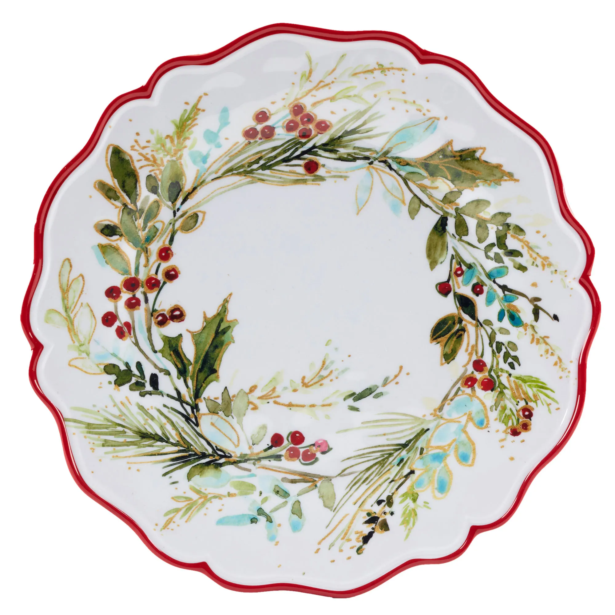 The Christmas Gatherings Melamine Dinner Plate Set perfectly completes your festive tablescape. By artist (C)Susan Winget, each white heavyweight melamine plate features a gloss finish, charming red-rimmed scalloped edge, and wreath design with green pine boughs, holly leaves, greenery, and red berries. The durable plates are BPA-free, scratch-resistant, and stackable. Sold as a set of four, each dinner plate measures 11"dia.x1"H. Food safe. Dishwasher safe.
