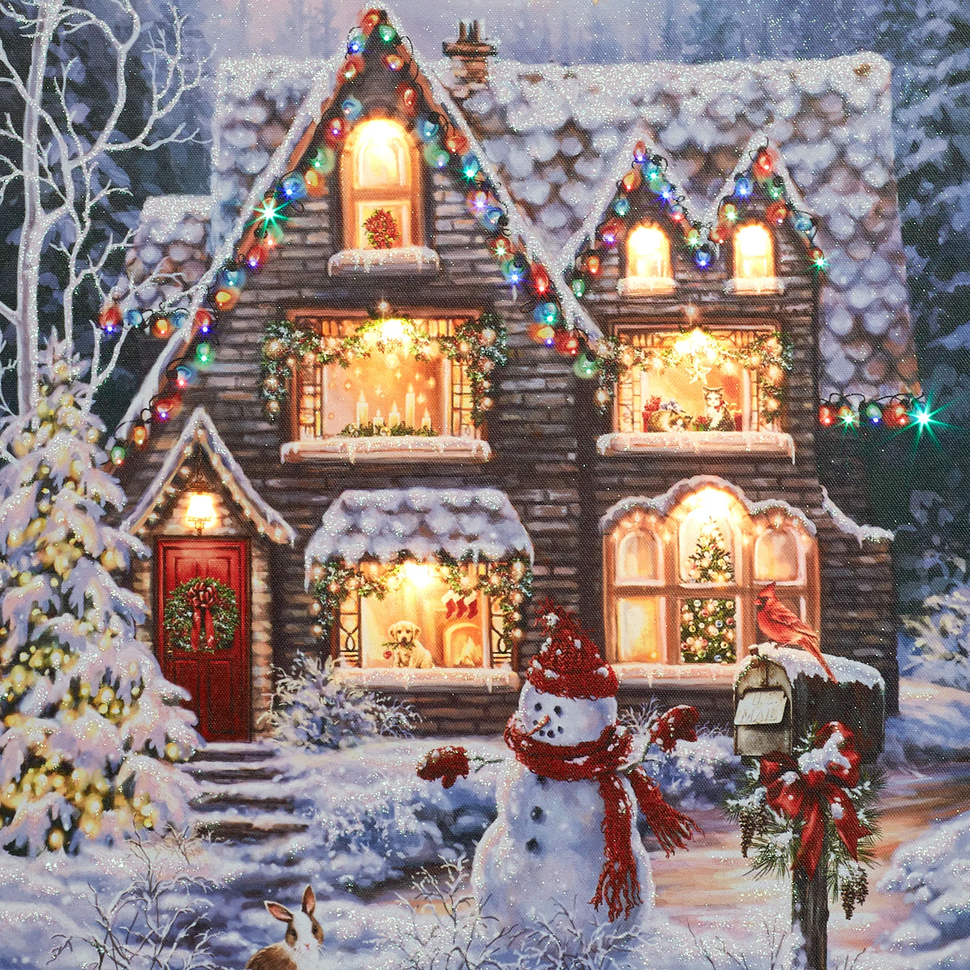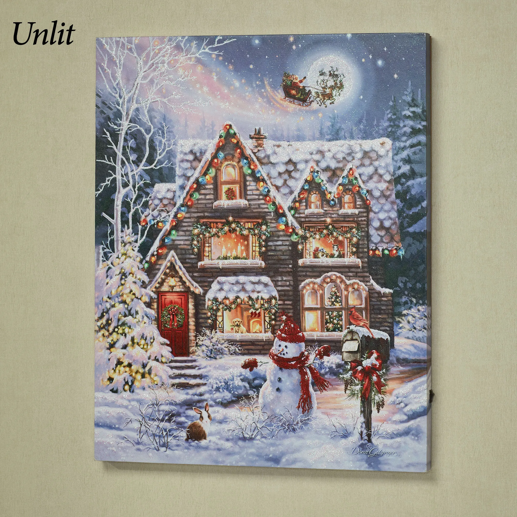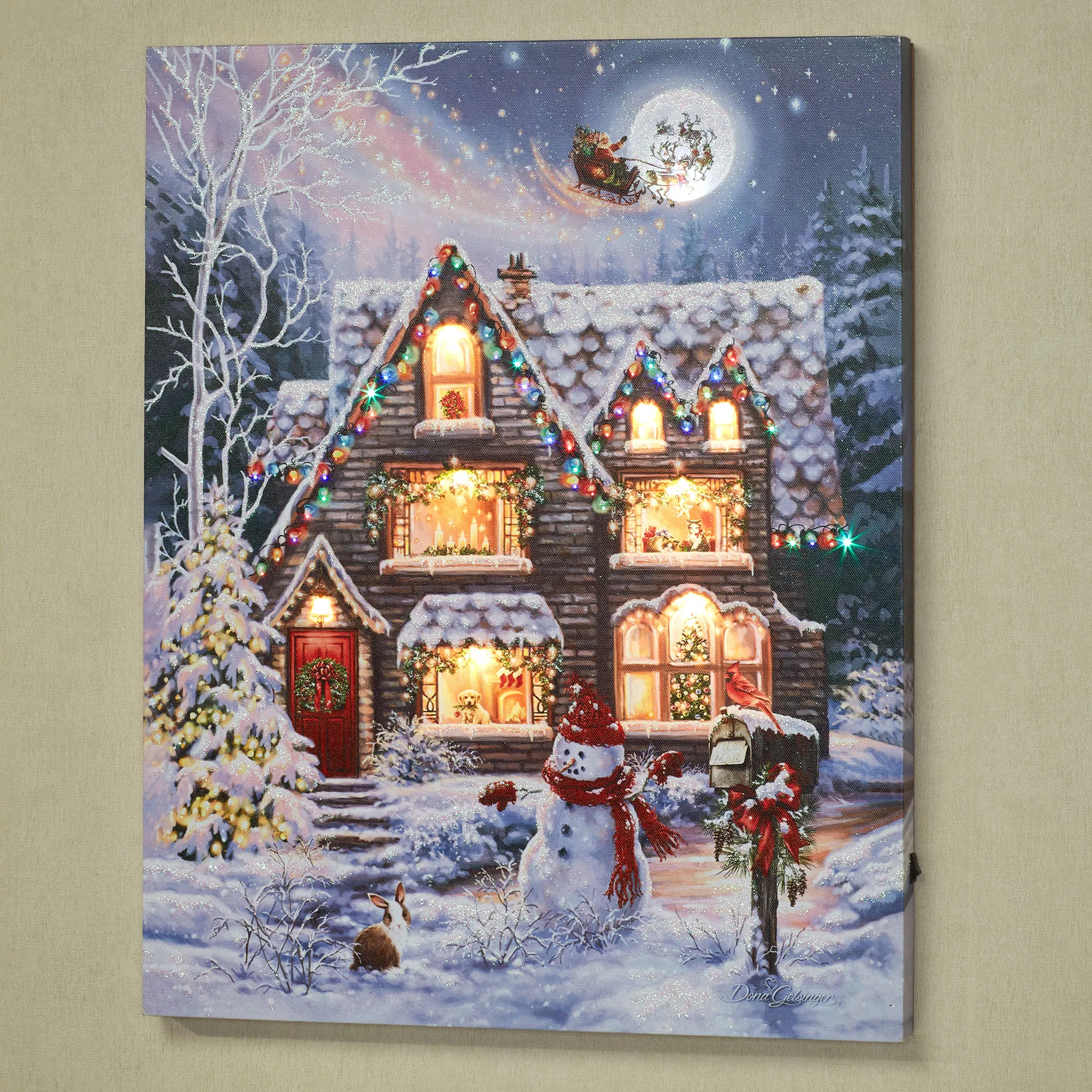 The Christmas House only gets more picturesque when Santa and his reindeer glide magically over the roof towards the full moon. From original art by artist (C)Dona Gelsinger, the canvas wall art features a beautifully decorated snowy house complete with lights, garland, a wreath on the red door, candles, a Christmas tree, a puppy, kittens, and a friendly snowman waiting outside. Glowing LEDs, twinkling colored fiber optic lights, and glittered accents bring the festive canvas to life. Requires four of your AA batteries to operate the on/off switch and built-in six-hour timer on the back side; for a continuous on option, use your 5V USB-C cord and adapter with the port located above the battery pack. Gallery-wrapped over a wooden frame, the lighted Christmas wall art measures 16"Wx1"Dx20"H.