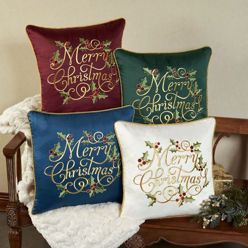 Add a festive touch with the Camelot Decorative Christmas Pillow. In a classic holiday solid color, the polyester matte satin pillow features an embroidered design of "Merry Christmas," green holly leaves, and red berries. Sold individually; each square pillow is 18" with decorative twist cording edges. Fill is polyester. Spot clean only. Imported.
