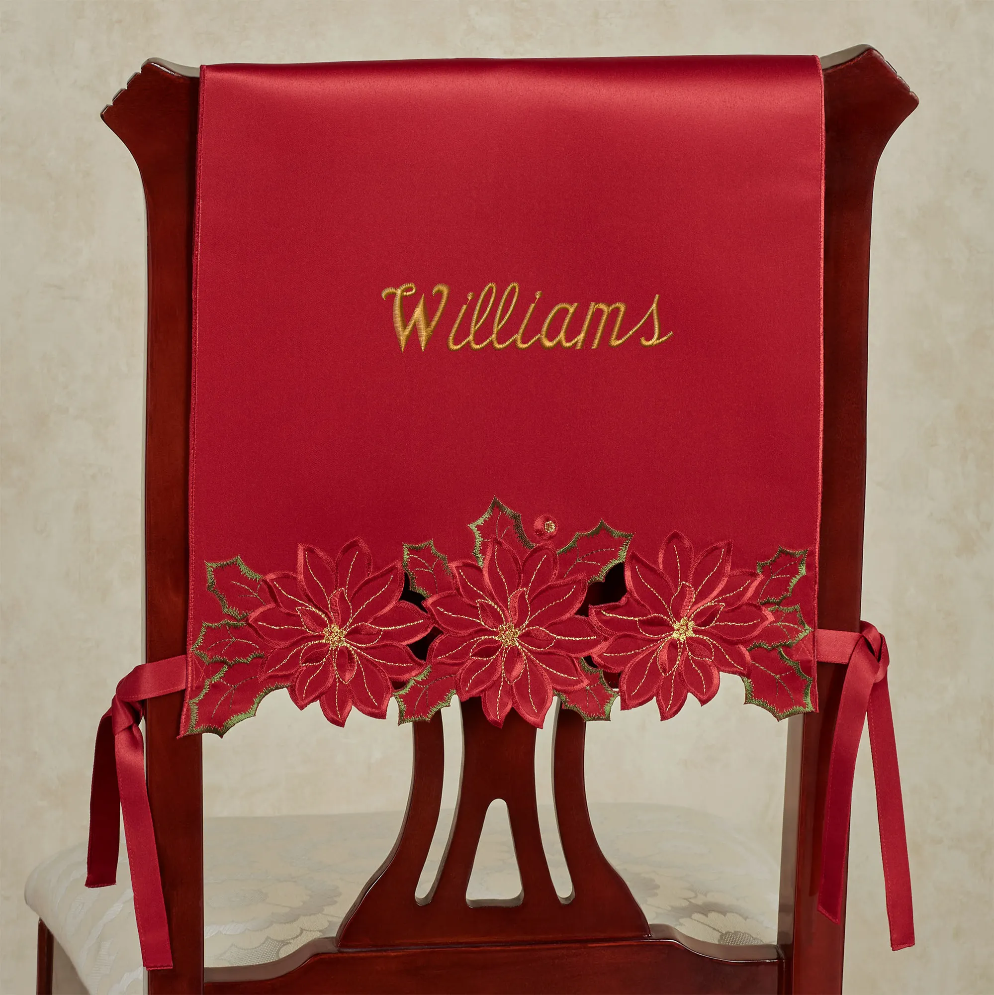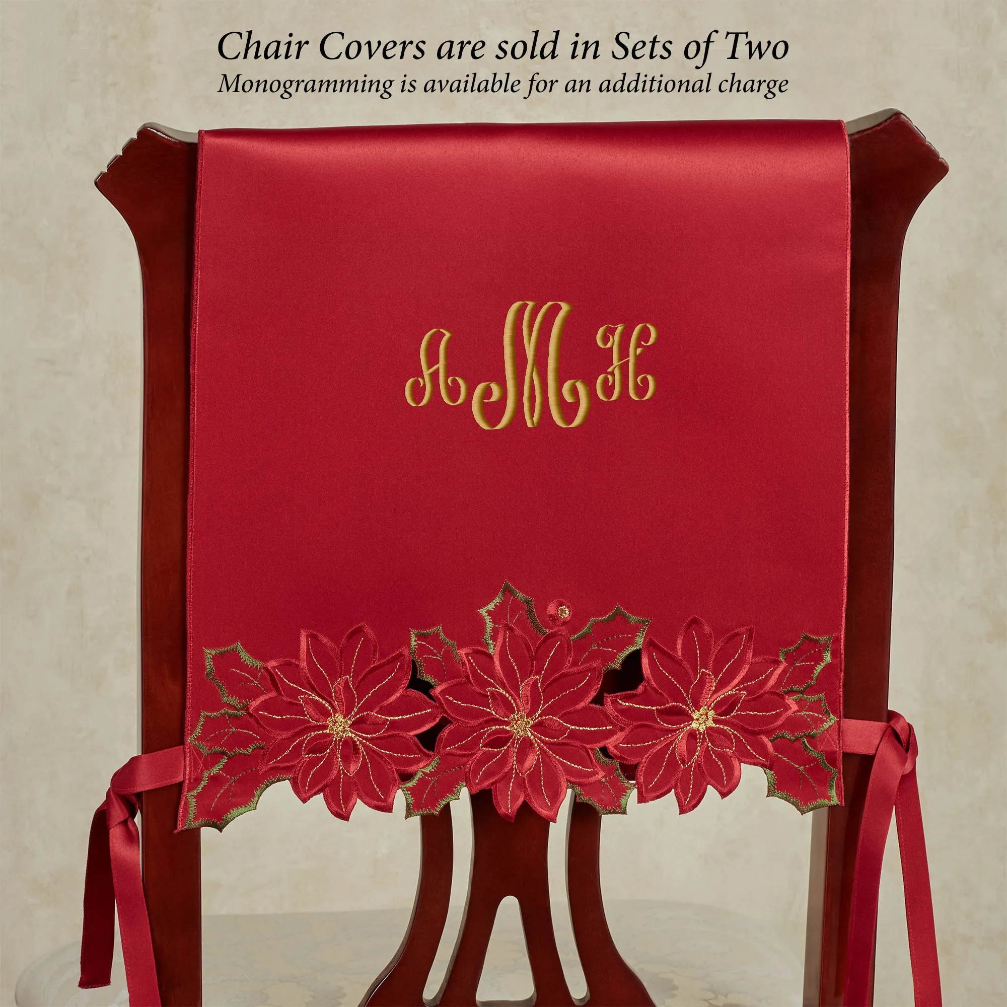 Enjoy the beauty of the Christmas Poinsettia Chair Cover Set this holiday season. Finely cut by hand, these polyester satin chair covers have cutwork poinsettia flowers embellished with green and gold embroidered accents. Each red chair cover is 16"x16" when styled on a chair and has ties to create a bow. Machine washable. Imported. Chair cover set may be personalized with a name or initial(s) for an additional $14 ($7 per cover); specify up to 11 letters for each cover. You may personalize each cover differently. Click on the burgundy "i" icon below the item name for more information.