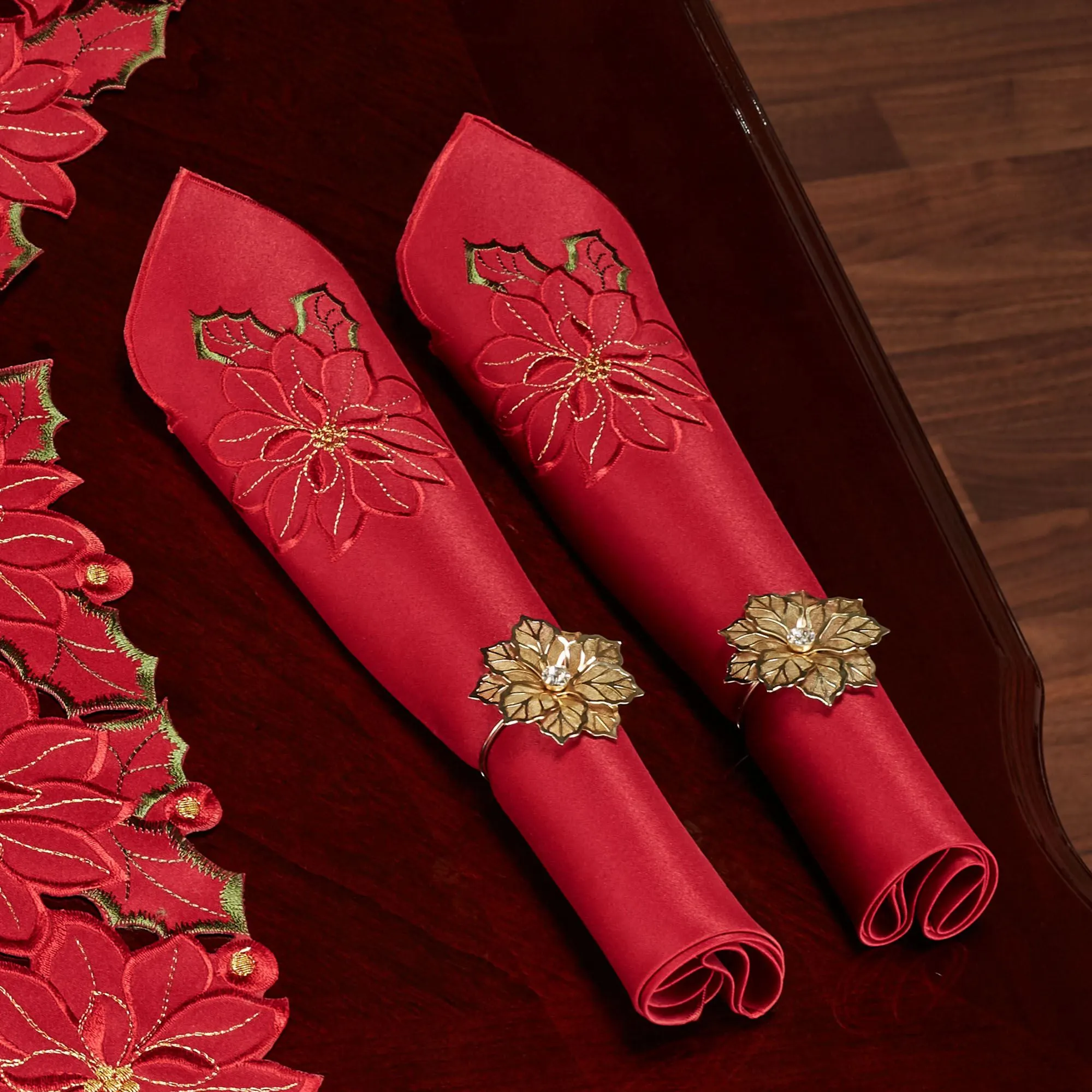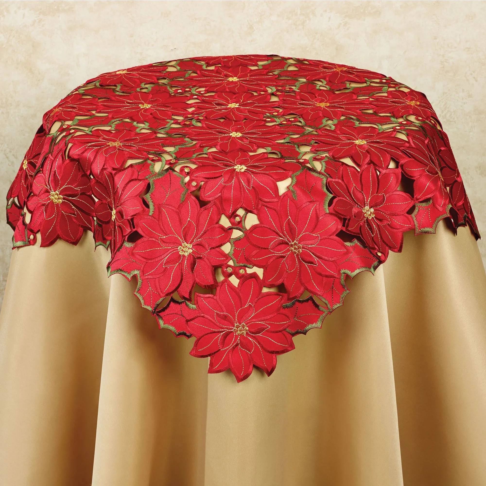 Enjoy the beauty of the Christmas Poinsettia Table Linens this holiday season. Finely cut by hand, the polyester satin accents have red cutwork florals detailed with green and gold embroidery; napkins do not have cutwork. Measurements are approximate. Specify Oblong Tablecloth, Napkin Set of 4, or Table Topper. Machine washable. Imported.