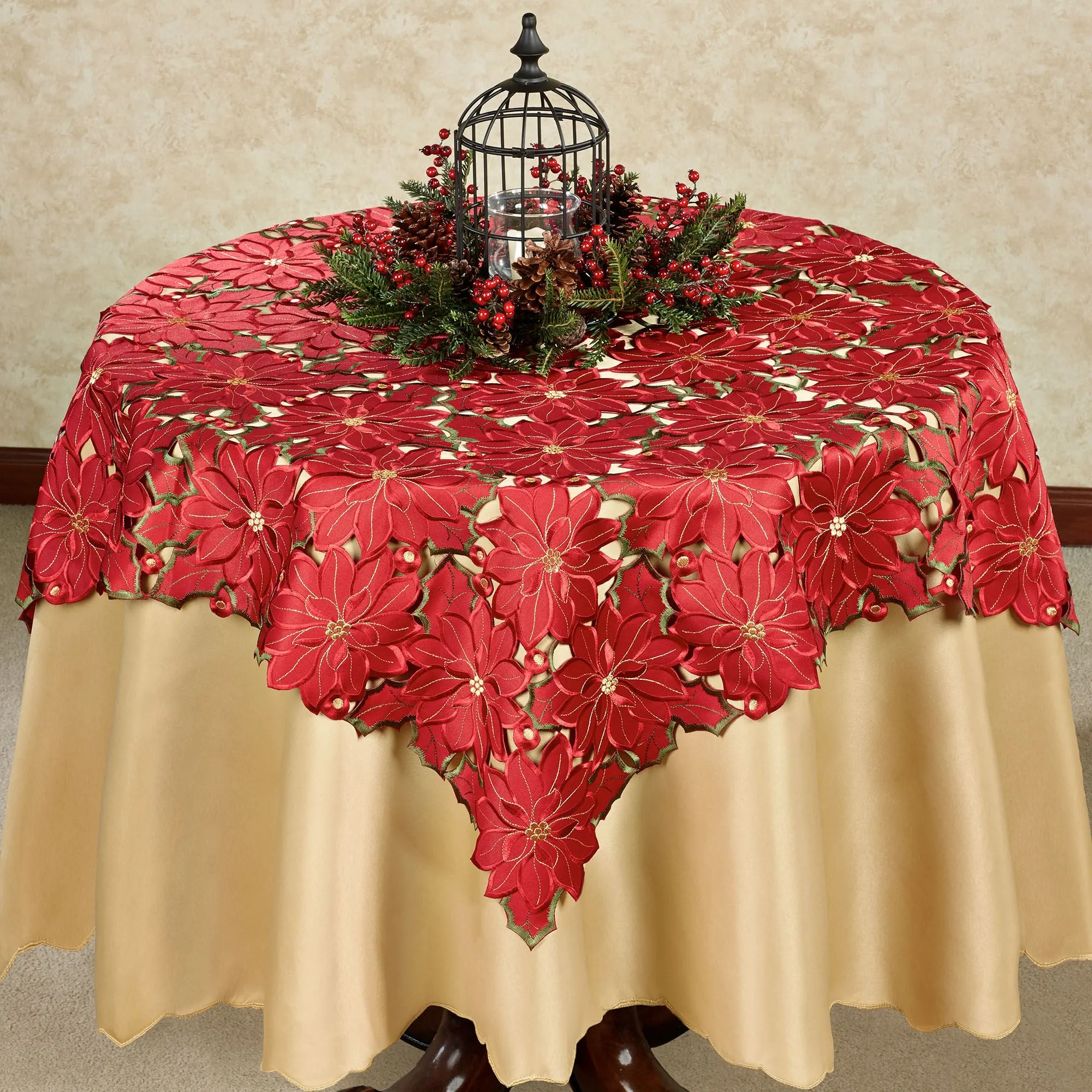 Christmas Poinsettia Red Cutwork Tablecloth and Table Linens