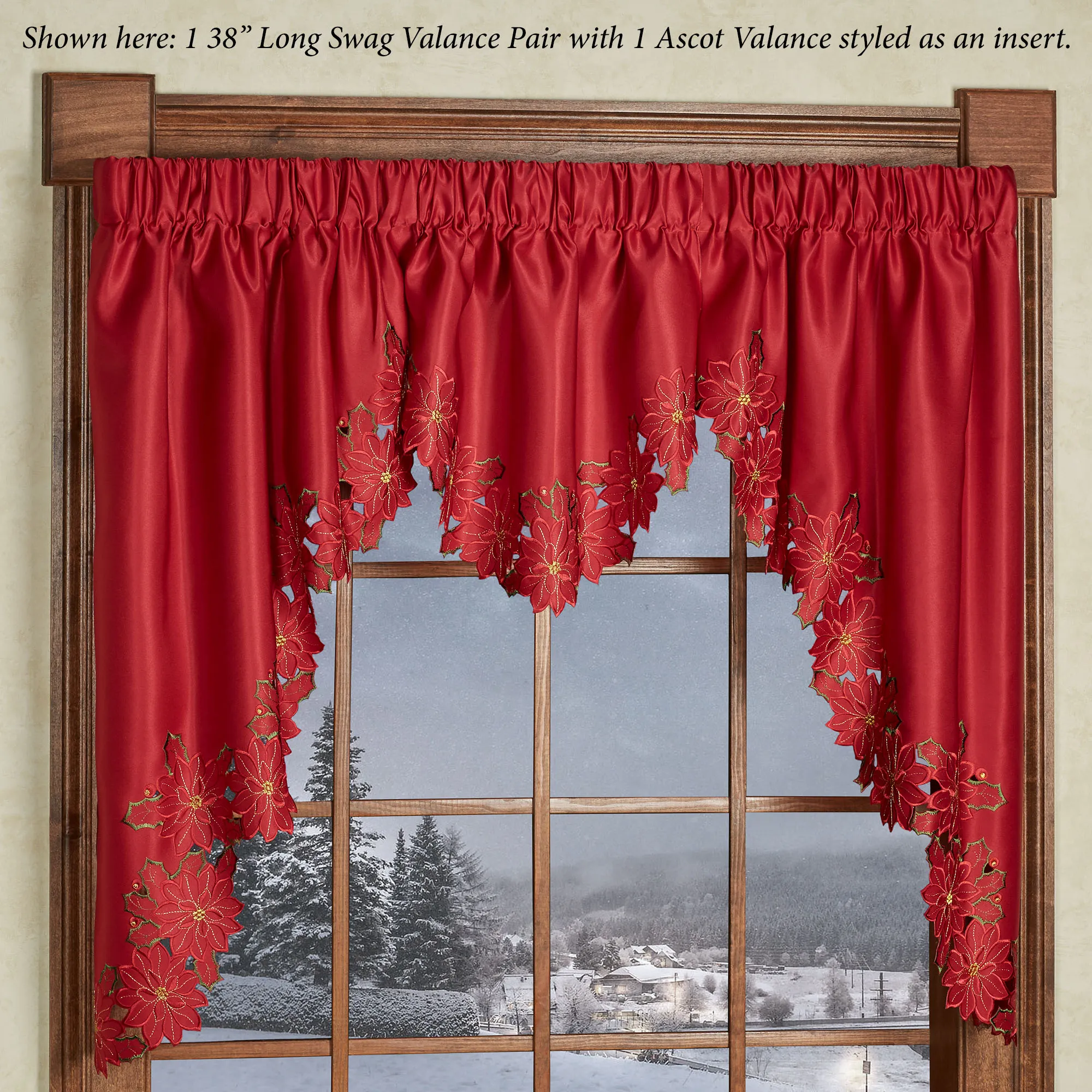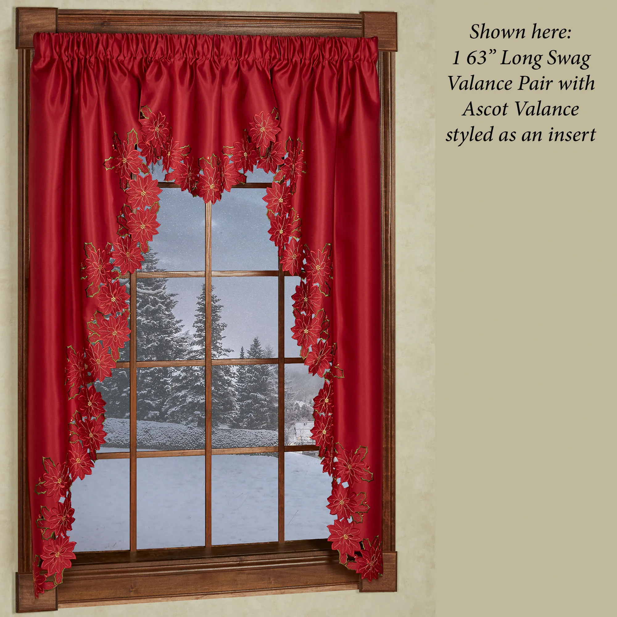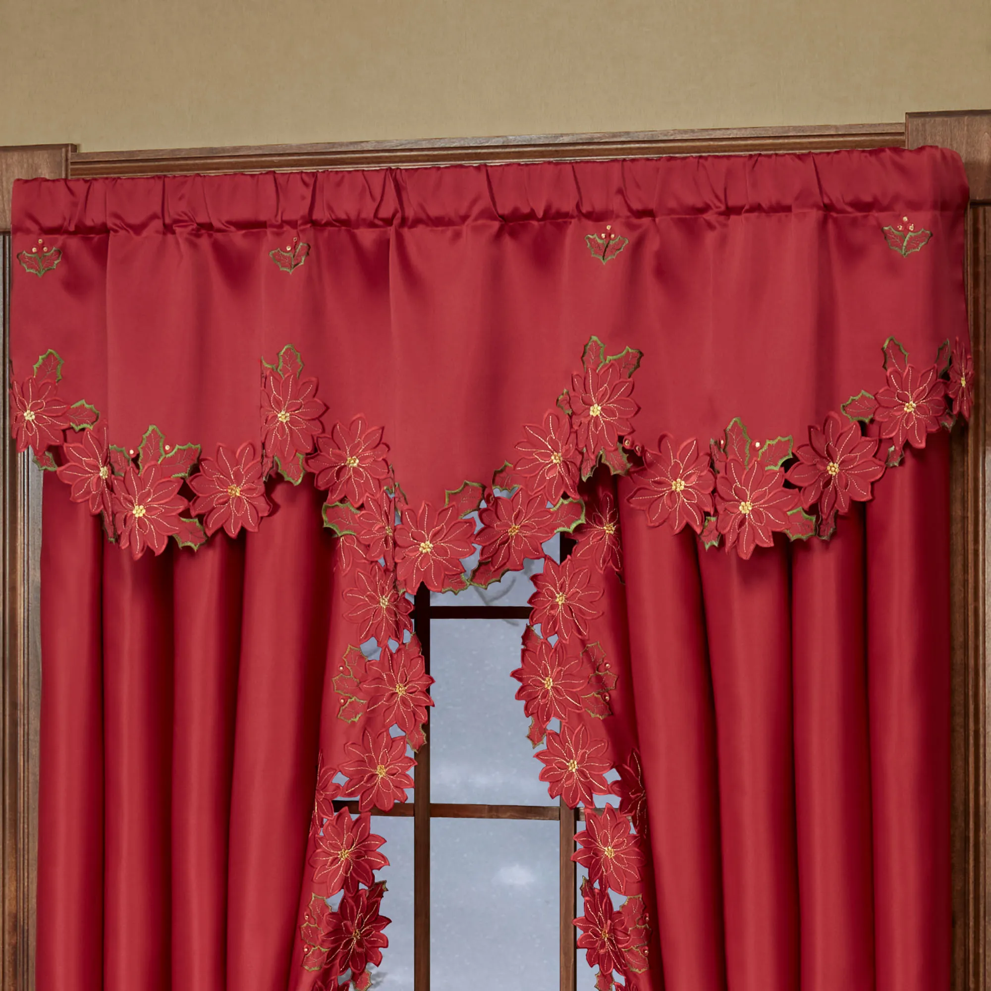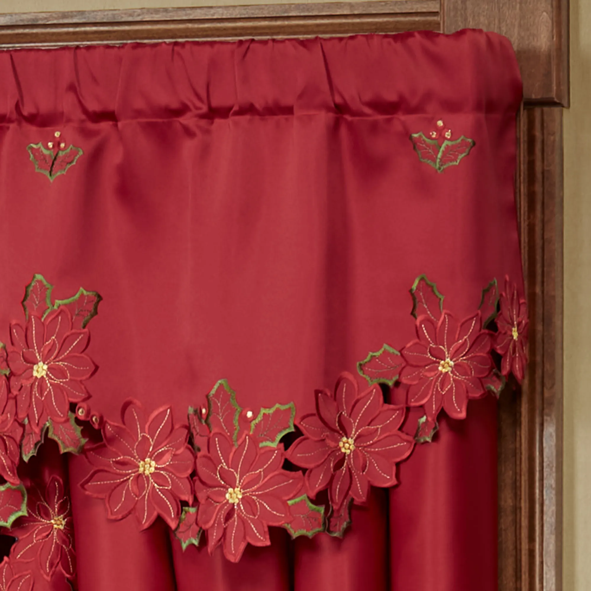 Enjoy the beauty of the Christmas Poinsettia Window Treatment this holiday season. Finely cut by hand, the red polyester satin accents have cutwork florals detailed with green and gold embroidery. Scalloped edges detail all. Specify Scalloped Valance, Tailored Curtain Pair, Swag Valance Pair, or Ascot Valance. Curtains include cutwork tiebacks. Rod pockets are 3". Machine washable. Imported. The curtain pair width is the total width of two panels together.