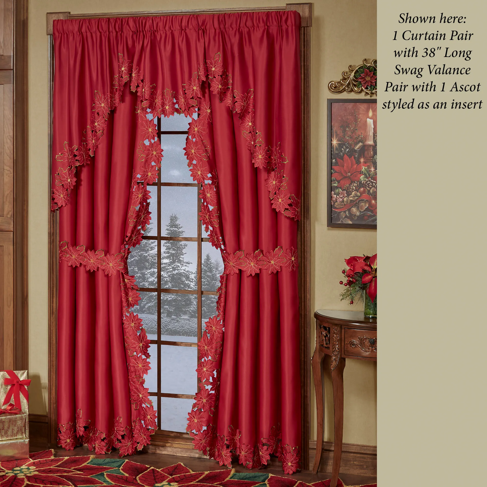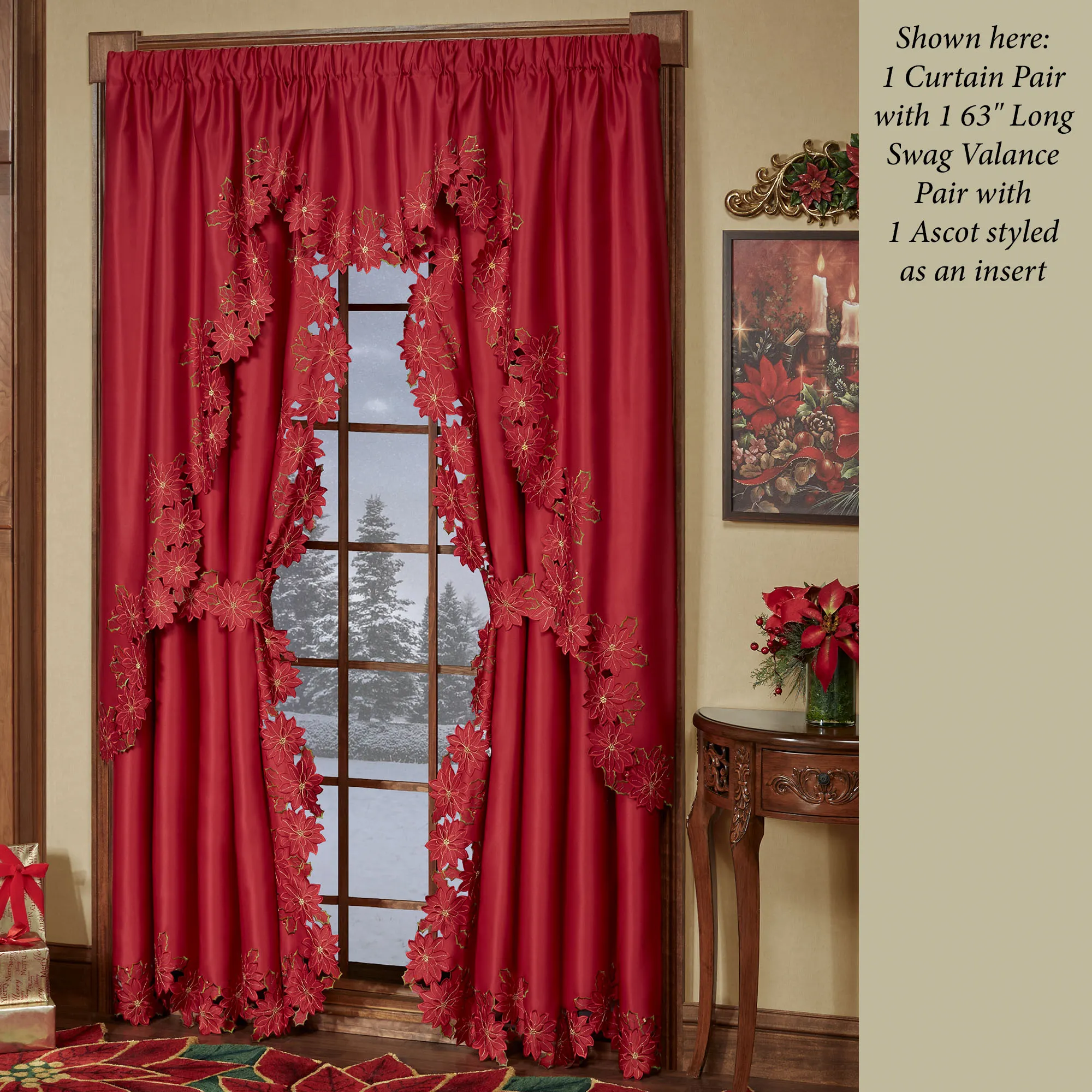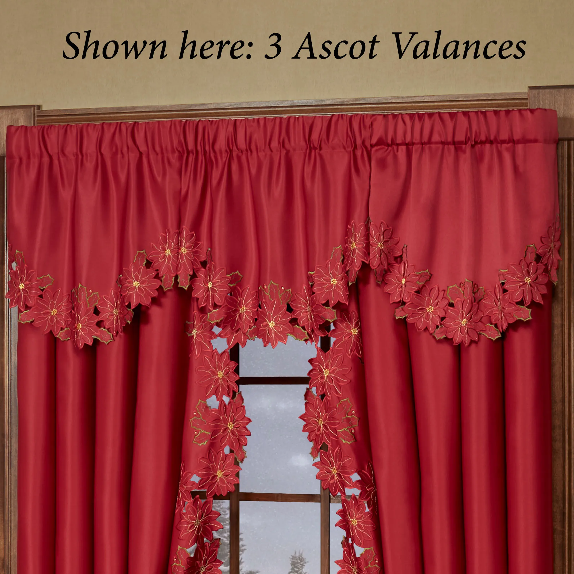 Enjoy the beauty of the Christmas Poinsettia Window Treatment this holiday season. Finely cut by hand, the red polyester satin accents have cutwork florals detailed with green and gold embroidery. Scalloped edges detail all. Specify Scalloped Valance, Tailored Curtain Pair, Swag Valance Pair, or Ascot Valance. Curtains include cutwork tiebacks. Rod pockets are 3". Machine washable. Imported. The curtain pair width is the total width of two panels together.