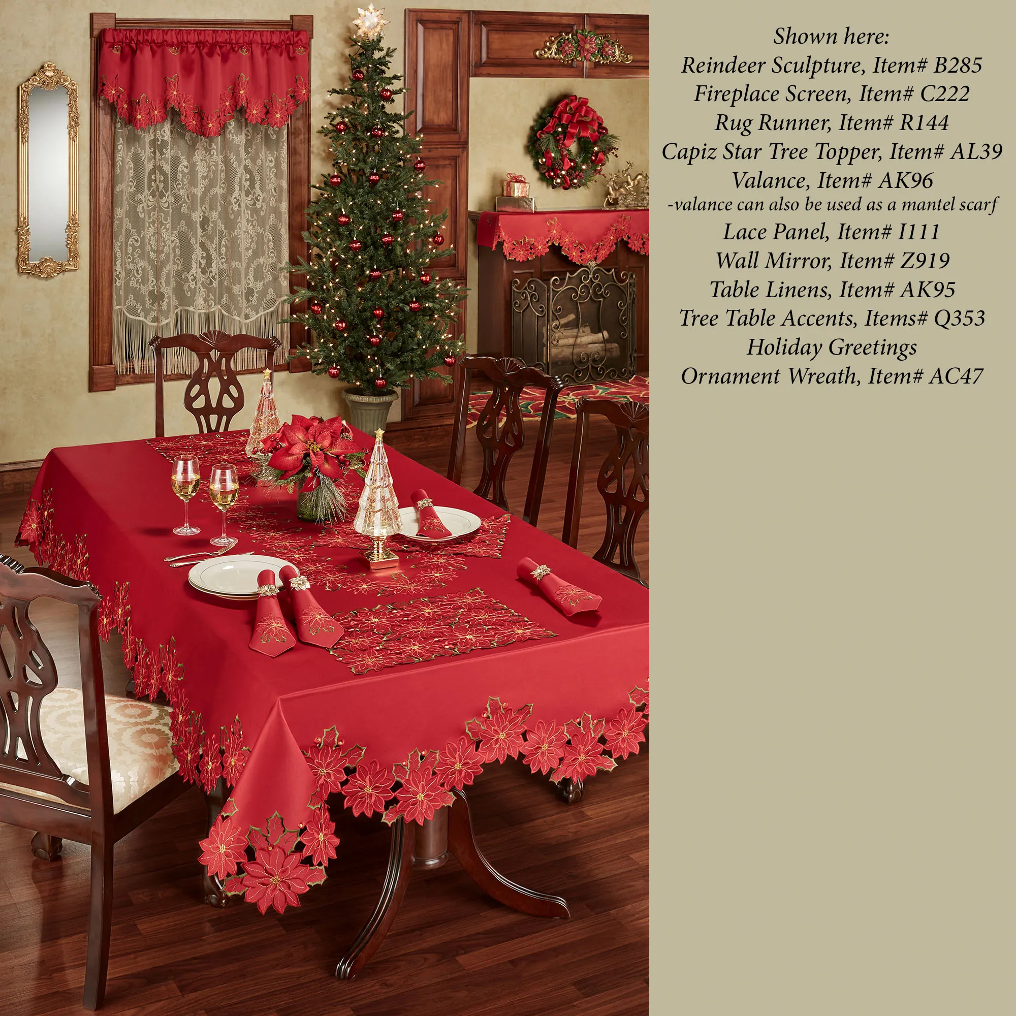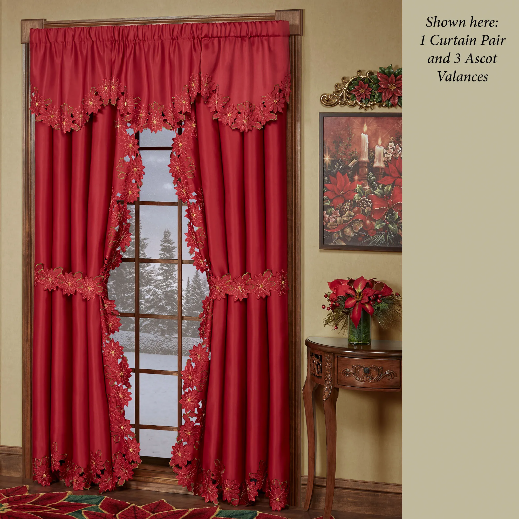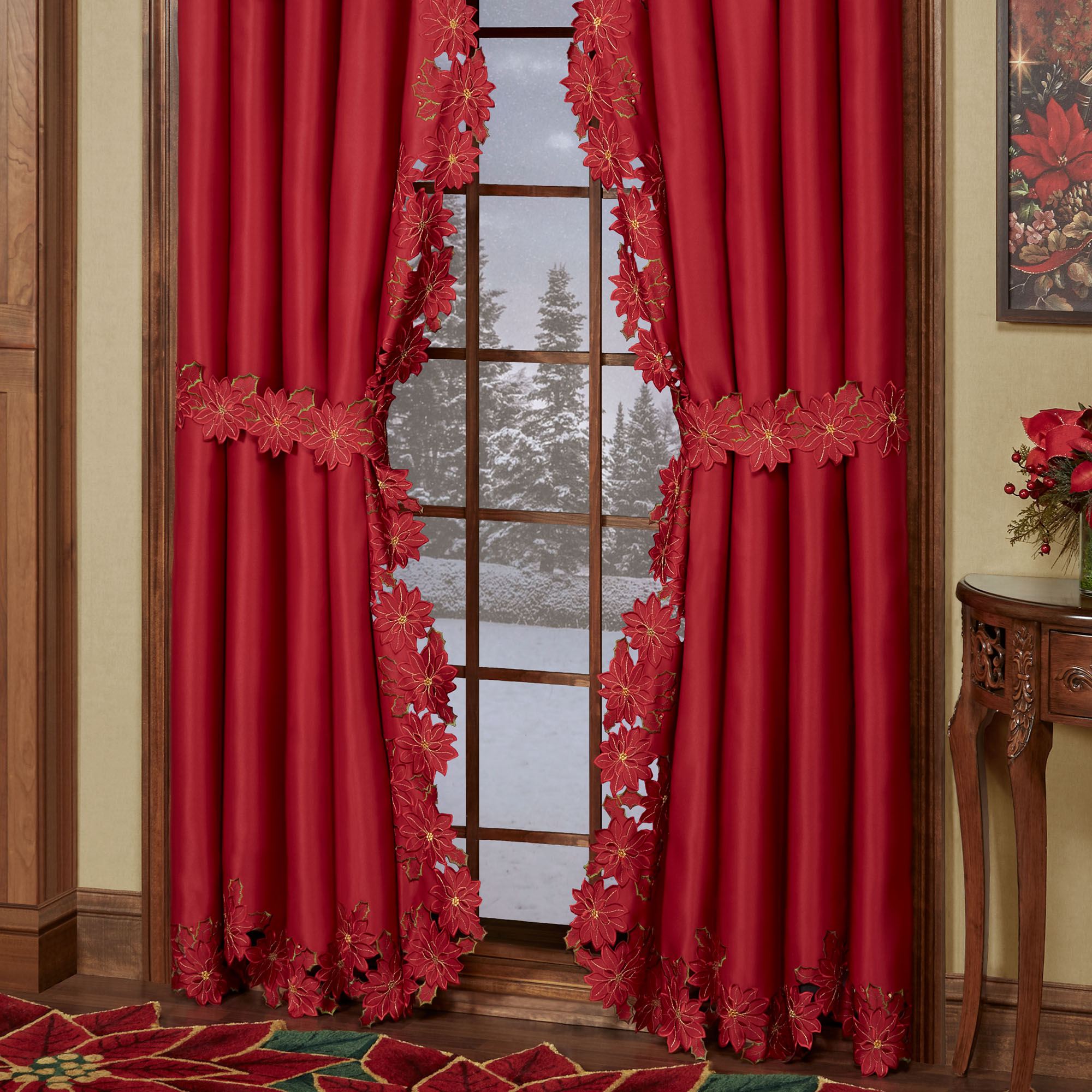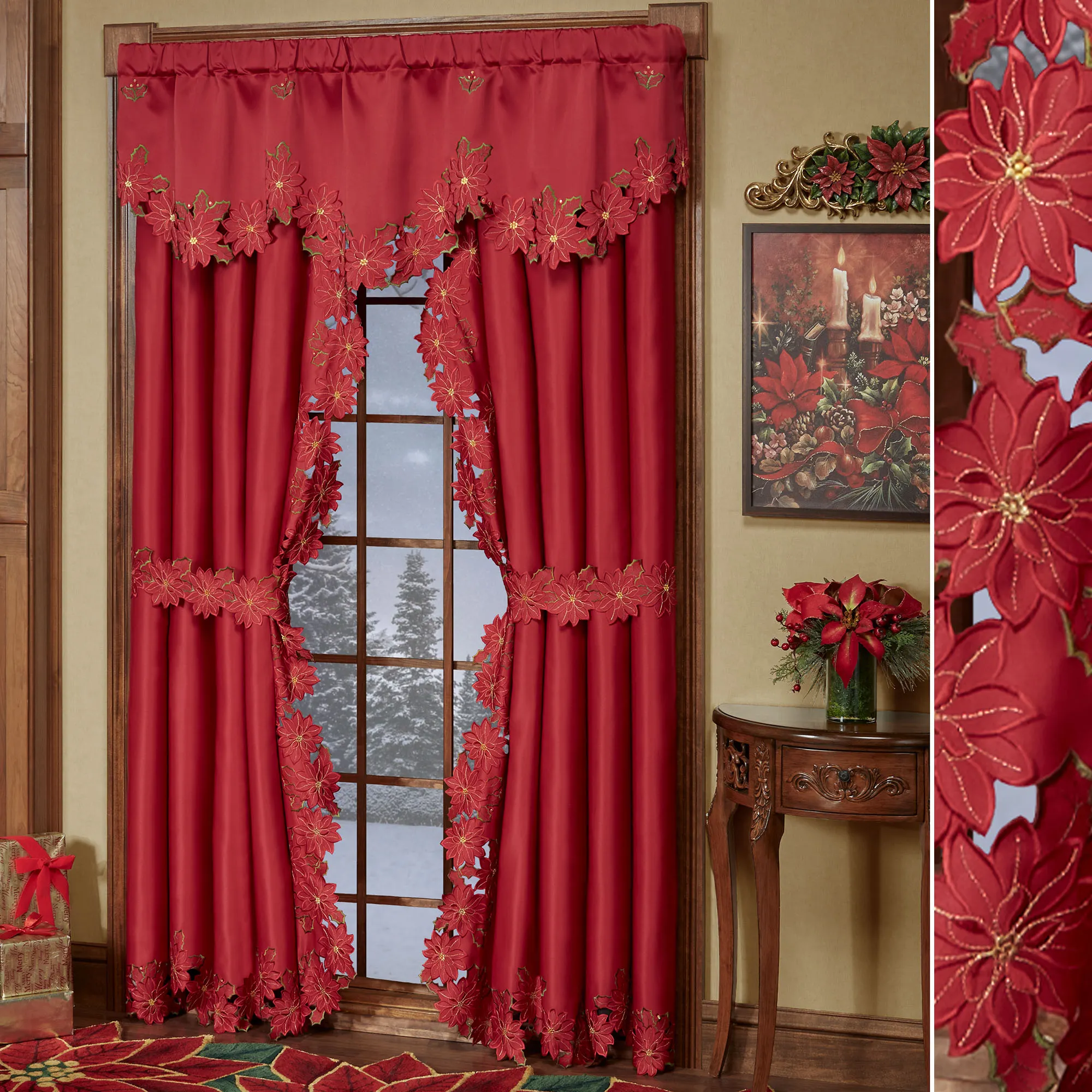 Enjoy the beauty of the Christmas Poinsettia Window Treatment this holiday season. Finely cut by hand, the red polyester satin accents have cutwork florals detailed with green and gold embroidery. Scalloped edges detail all. Specify Scalloped Valance, Tailored Curtain Pair, Swag Valance Pair, or Ascot Valance. Curtains include cutwork tiebacks. Rod pockets are 3". Machine washable. Imported. The curtain pair width is the total width of two panels together.