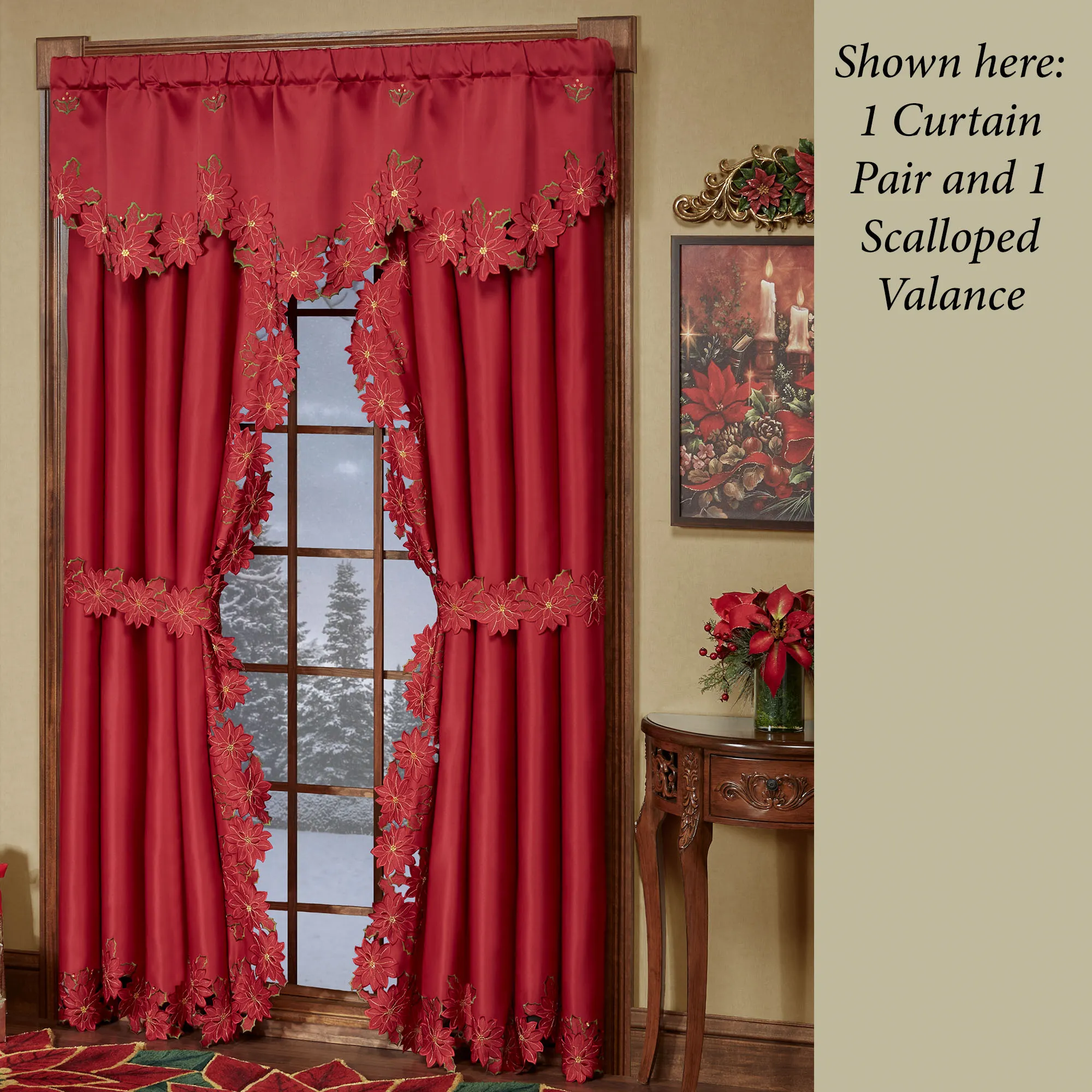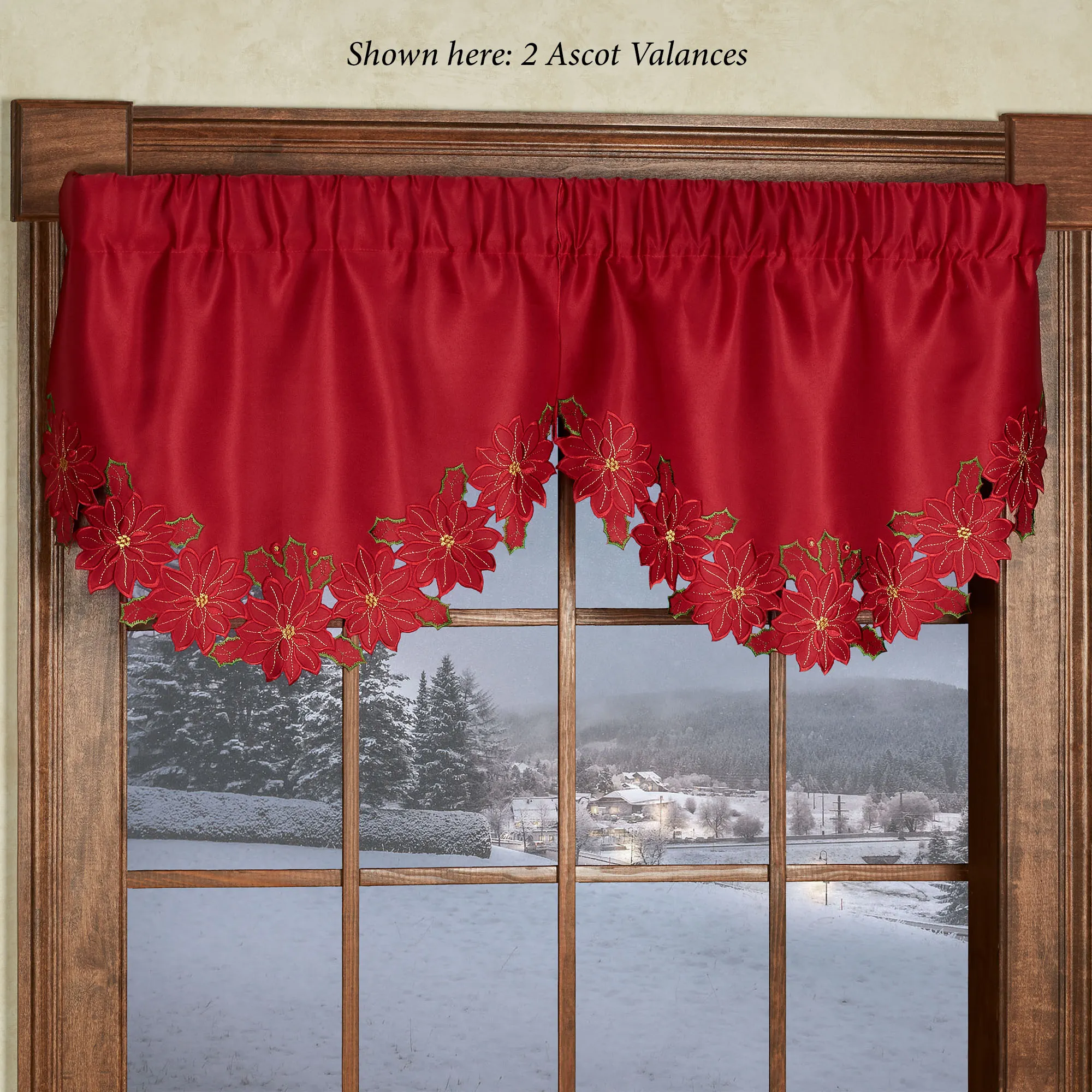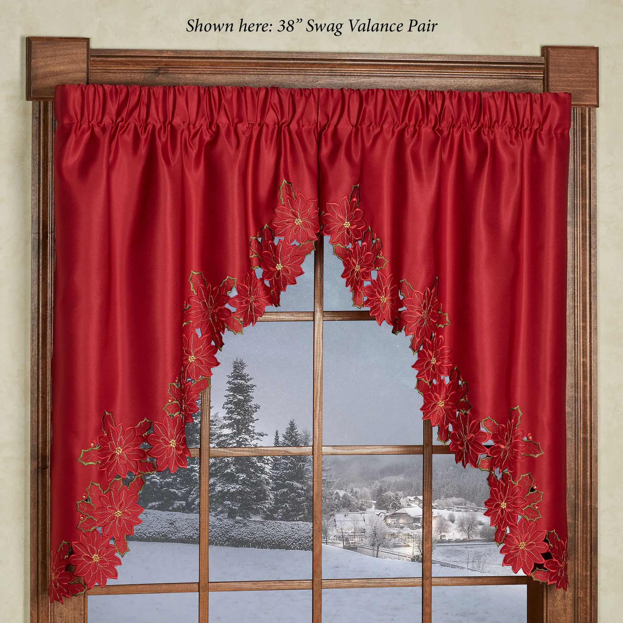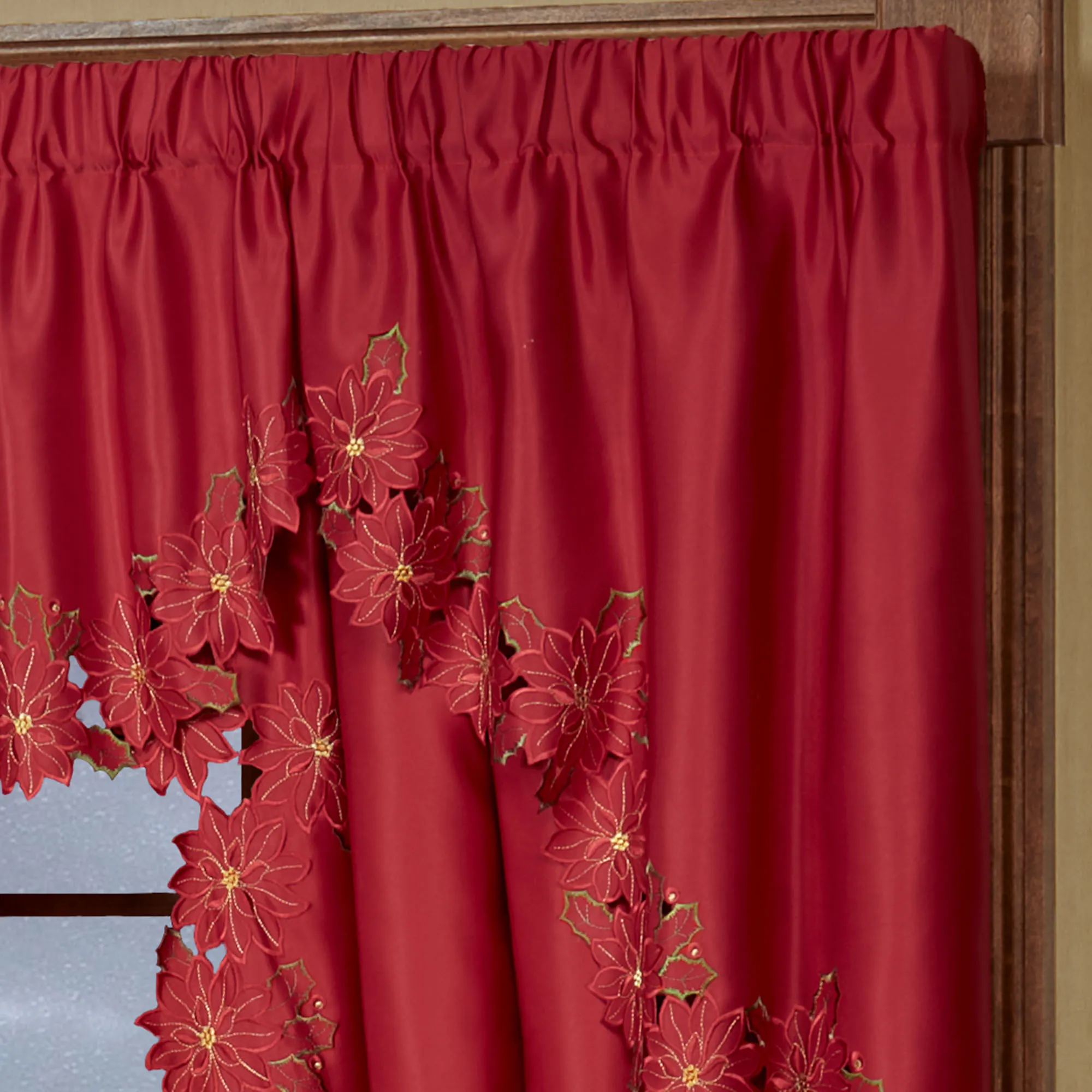 Enjoy the beauty of the Christmas Poinsettia Window Treatment this holiday season. Finely cut by hand, the red polyester satin accents have cutwork florals detailed with green and gold embroidery. Scalloped edges detail all. Specify Swag Valance Pair, Ascot Valance, Tailored Curtain Pair, or Scalloped Valance. Curtains include cutwork tiebacks. Rod pockets are 3". Machine washable. Imported. The curtain pair width is the total width of two panels together.