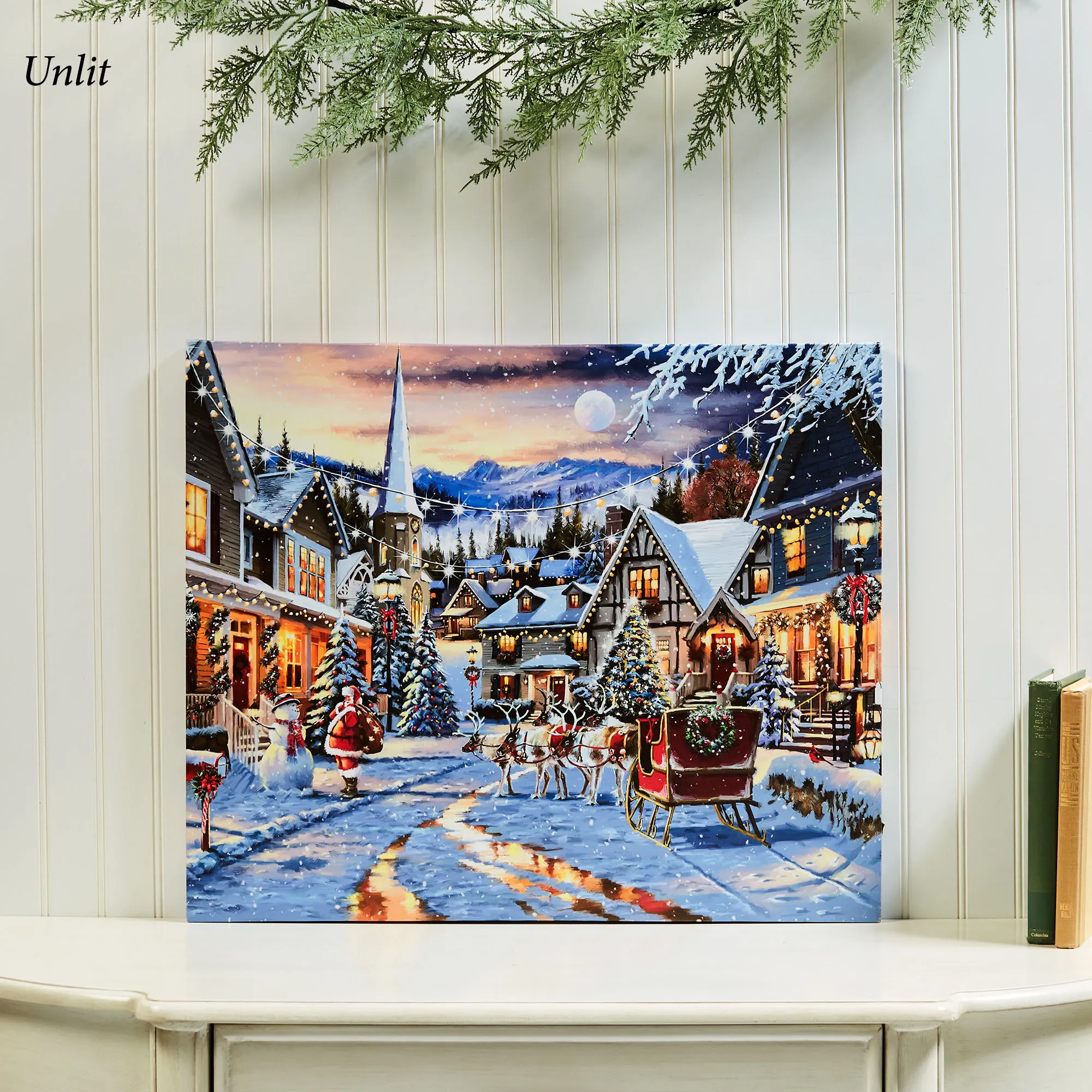 • Lighted canvas wall art features a lively Christmas village