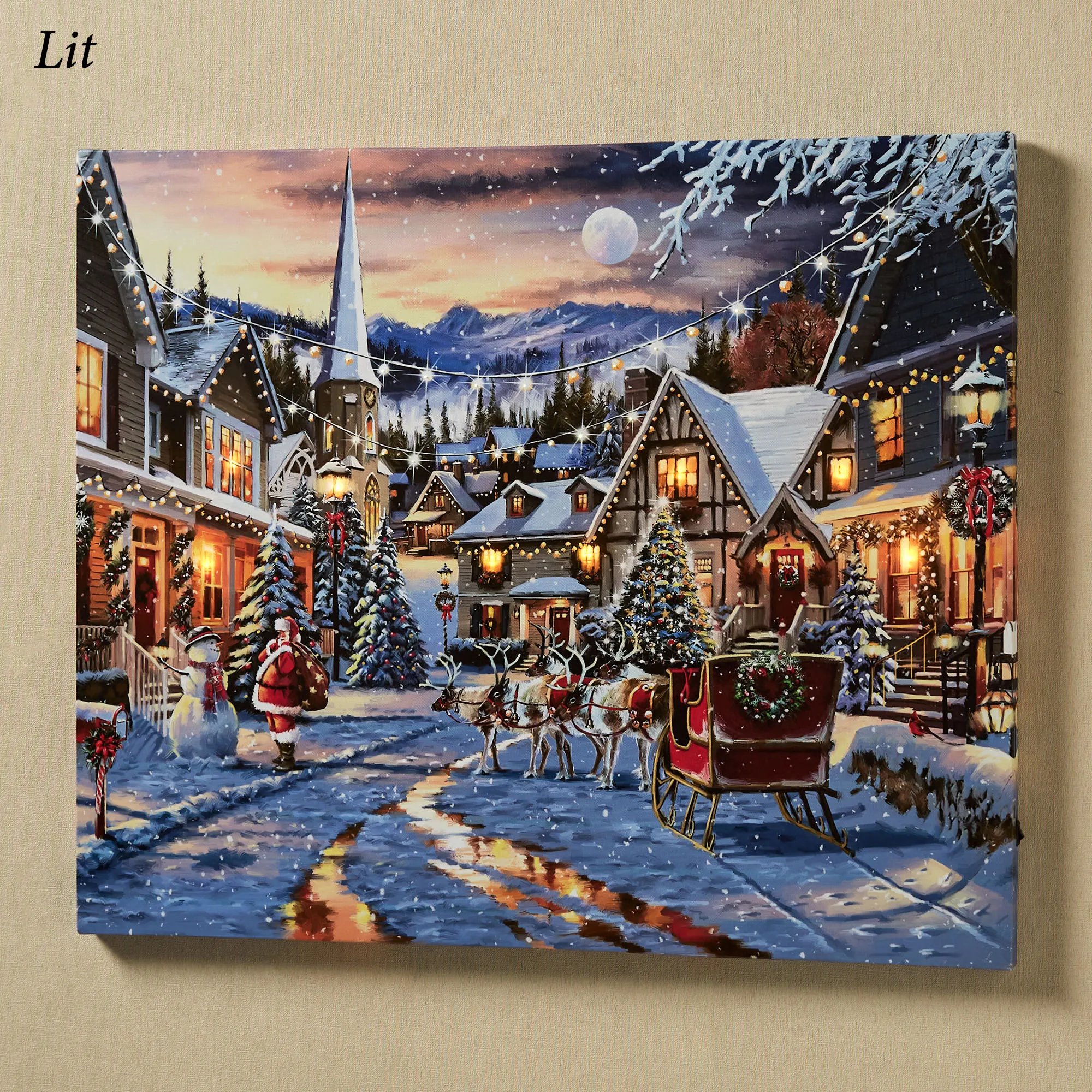 The Christmas Village Lighted Wall Art is canvas stretched over a wood frame.