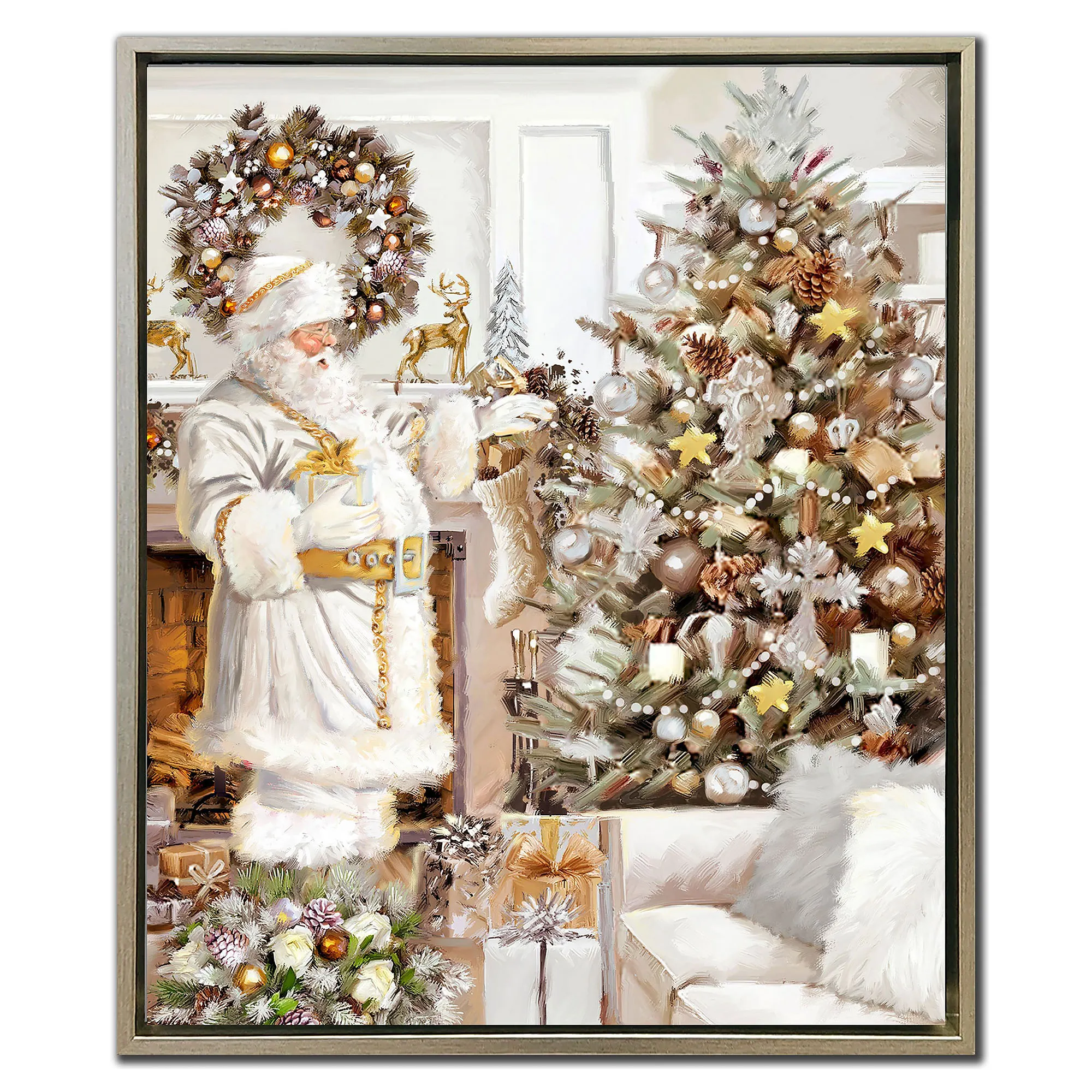 When your home is beautifully decorated, Santa takes the time during his Christmas Visit to admire your finery before perfectly placing his own festive gifts. From original artwork by (C)The Macneil Studio, the canvas artwork features a painterly style in soft hues of white, cream, gold, green, and brown with handpainted gel embellishments and a champagne-hued polystyrene floating frame. Dressed in a fur-trimmed white suit, Santa admires the pristine Christmas tree, lovely wreath, and golden accents throughout the home. Overall, the holiday framed wall art measures approx. 22"Wx2"Dx26"H.