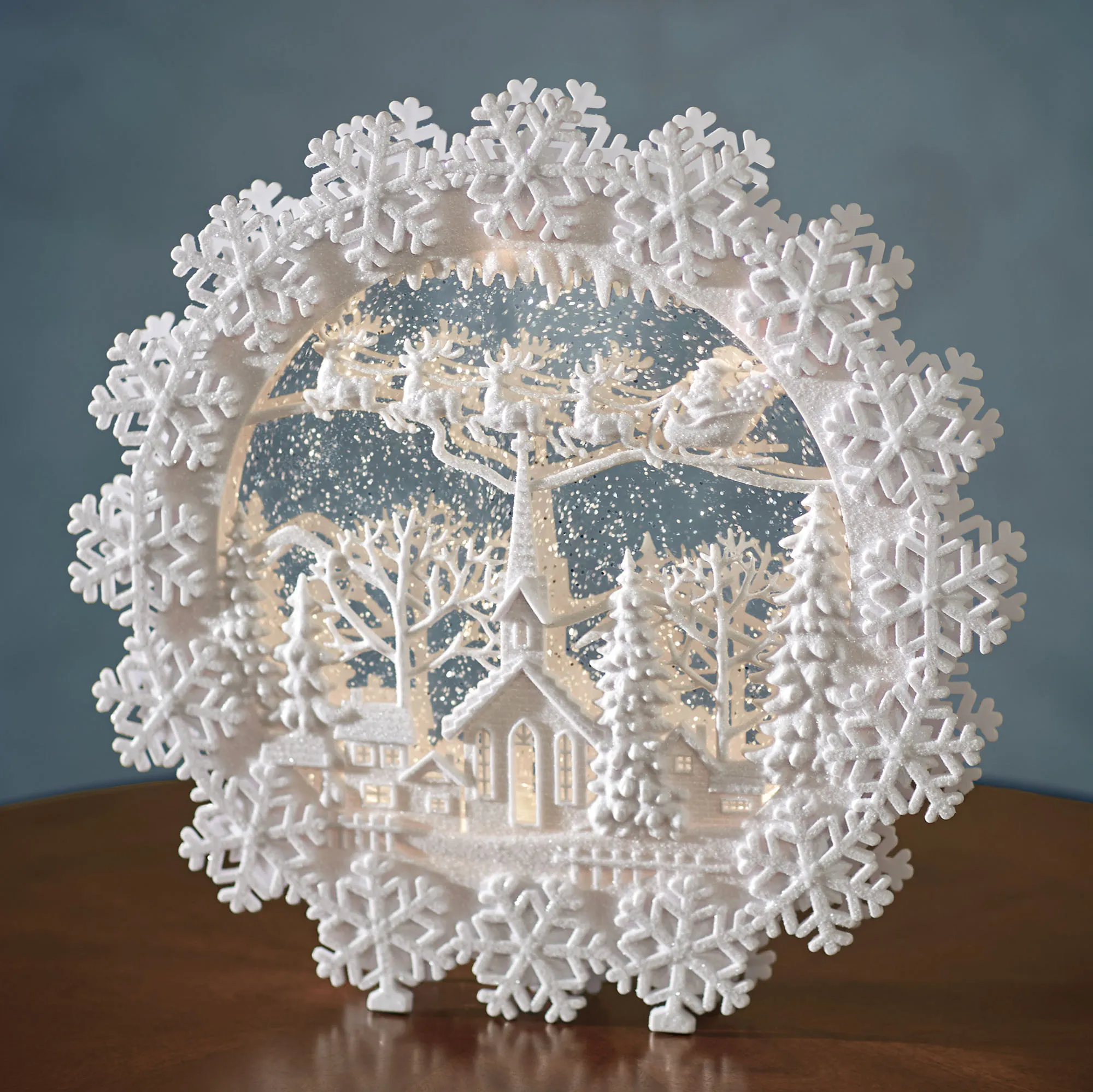 The Church Scene LED Water Globe offers a glimpse of perfect winter magic. Accented with shimmering glitter, the white molded plastic design resembles a ring of snowflakes with a clear liquid-filled center that shimmers and swirls with glitter and LED lights. The center also features Santa and his reindeer flying over a quaint town with a church, houses, and trees. Requires three of your AA batteries and operates from an off/six-hour timer switch on the back side; please use new batteries to ensure the lights work properly. Measures 12.5"dia.x1.5"D.