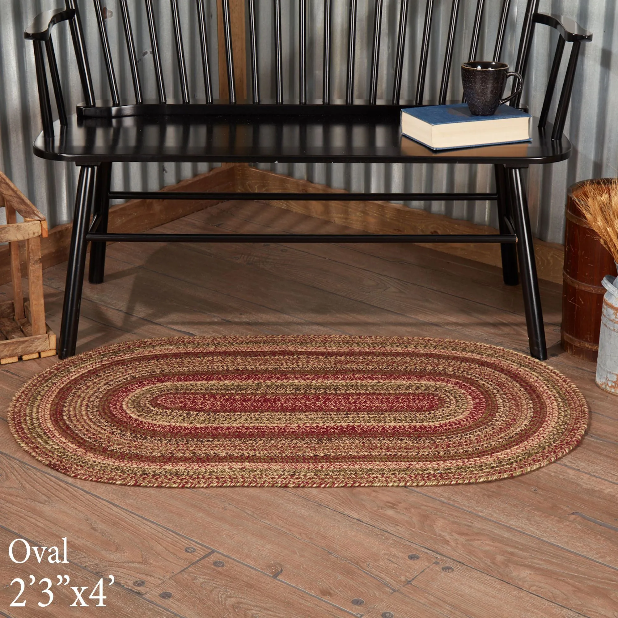Step back into timeless charm with the Cider Mill Braided Rug. Crafted from a jute/cotton/acrylic blend, the .25" thick rug features a machine-braided and -stitched concentric design in shades of tan, burgundy, and olive green. Rug includes a nonslip PVC rug pad for further convenience. Spot clean only. Imported.