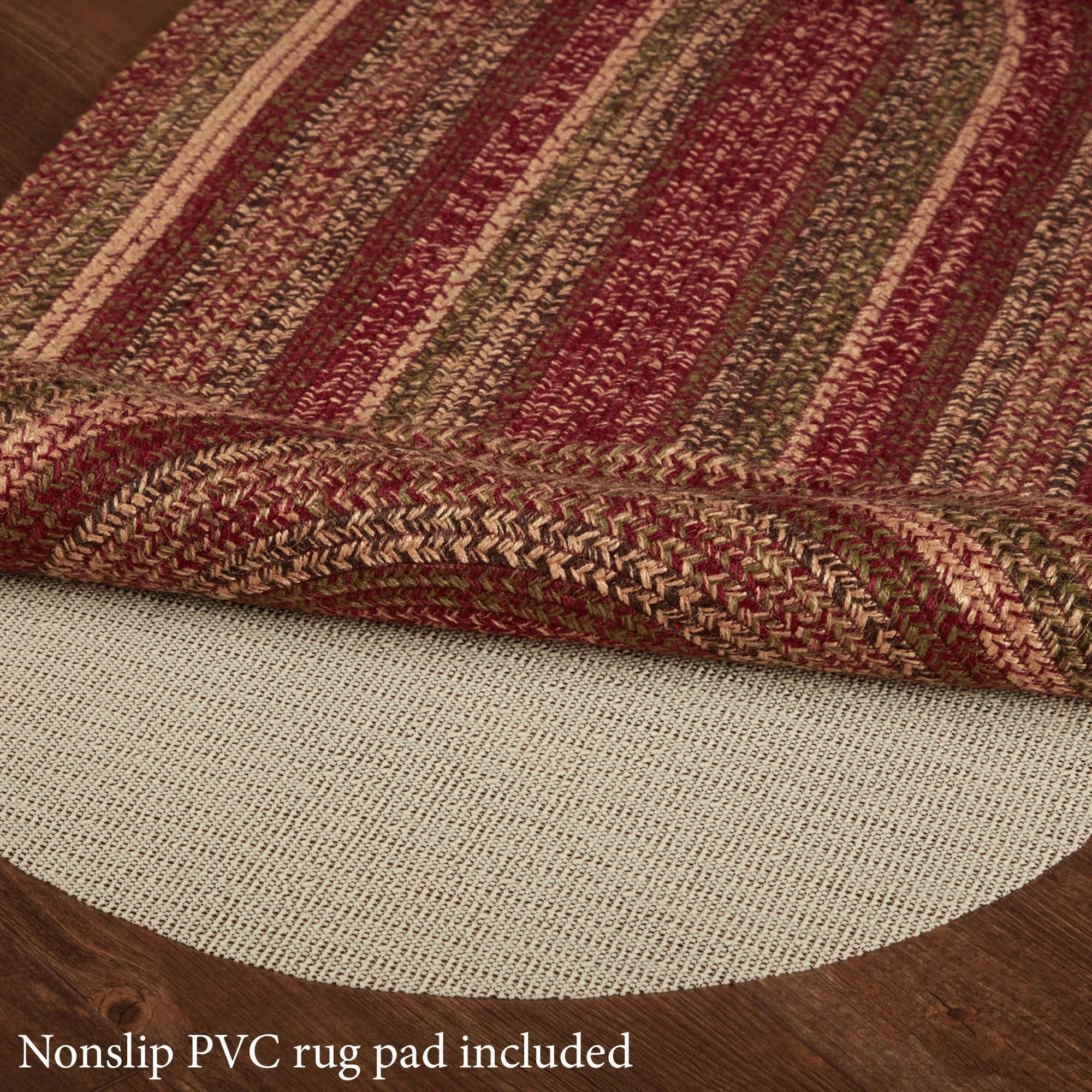 The Cider Mill Braided Rug is a jute/cotton/acrylic blend. The included rug pad is PVC. Imported.
