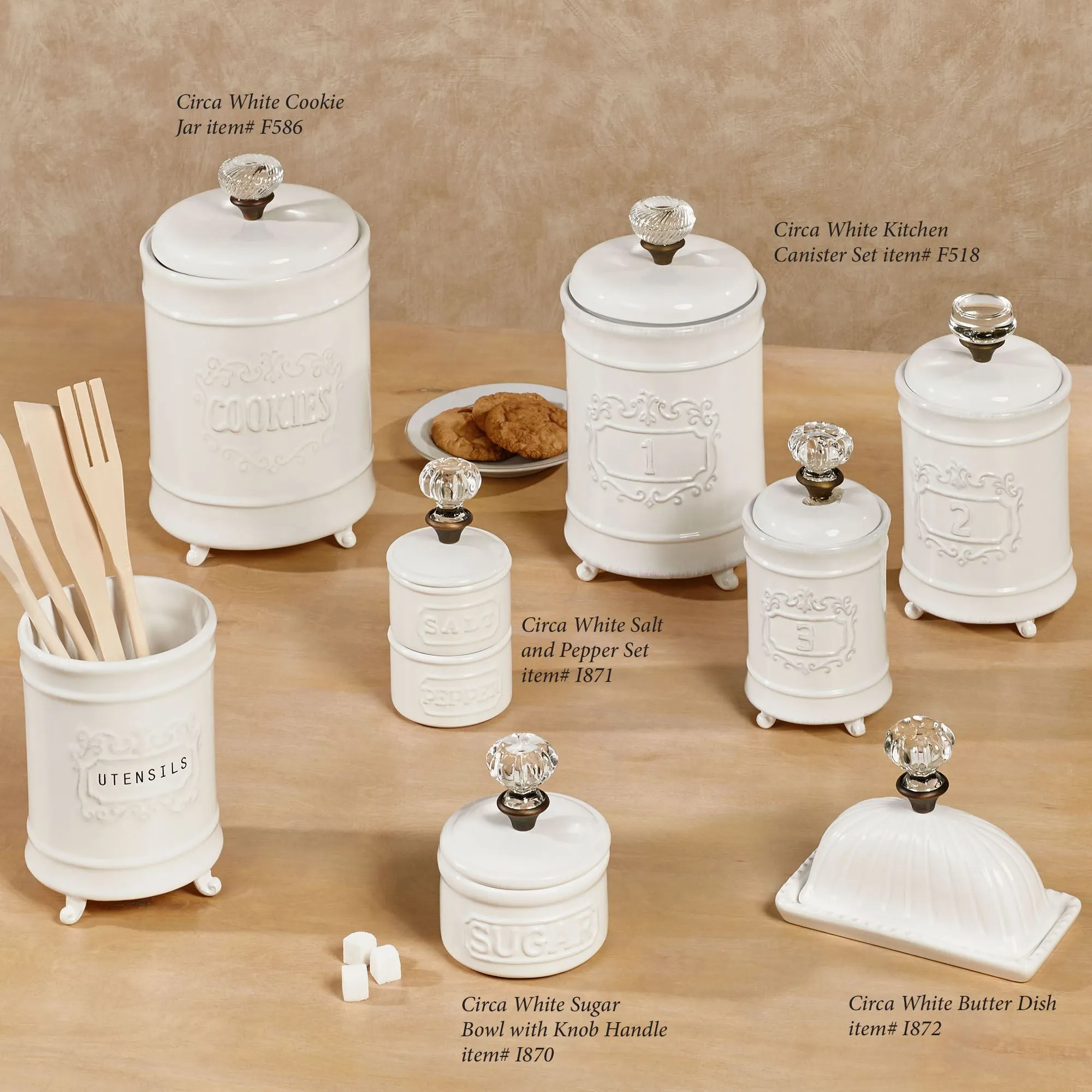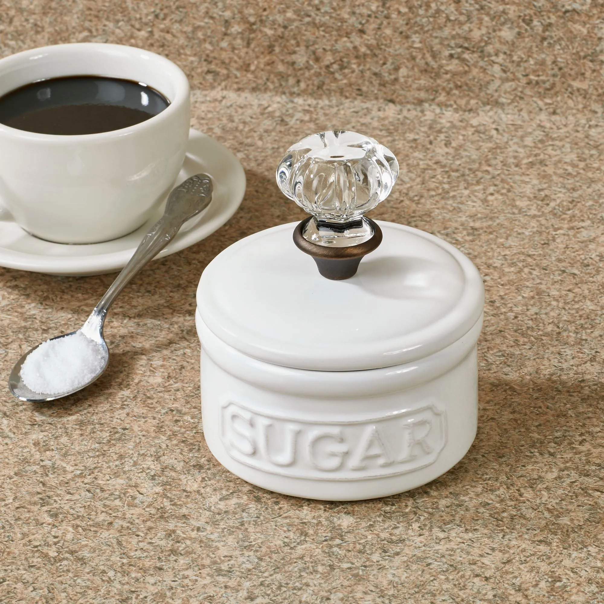 The Circa Sugar Bowl brings old-fashioned elegance to your kitchen with its milk-glazed finish. White ceramic accent features an embossed identifier and a vintage-inspired glass knob handle. Sugar bowl will keep just the right amount of sugar handy; capacity is one cup. Measures 4.5"dia.x5"H. Food safe. Hand wash.