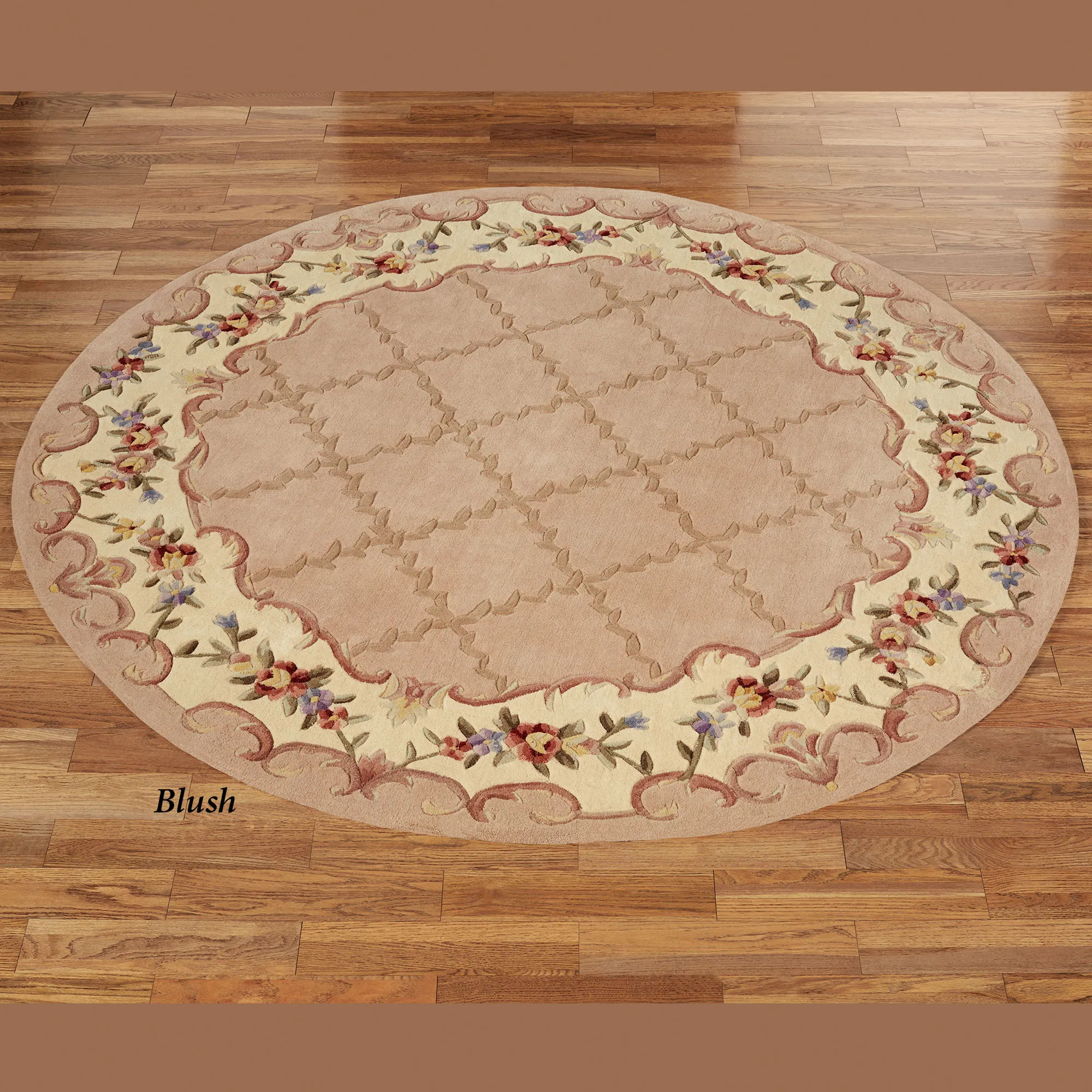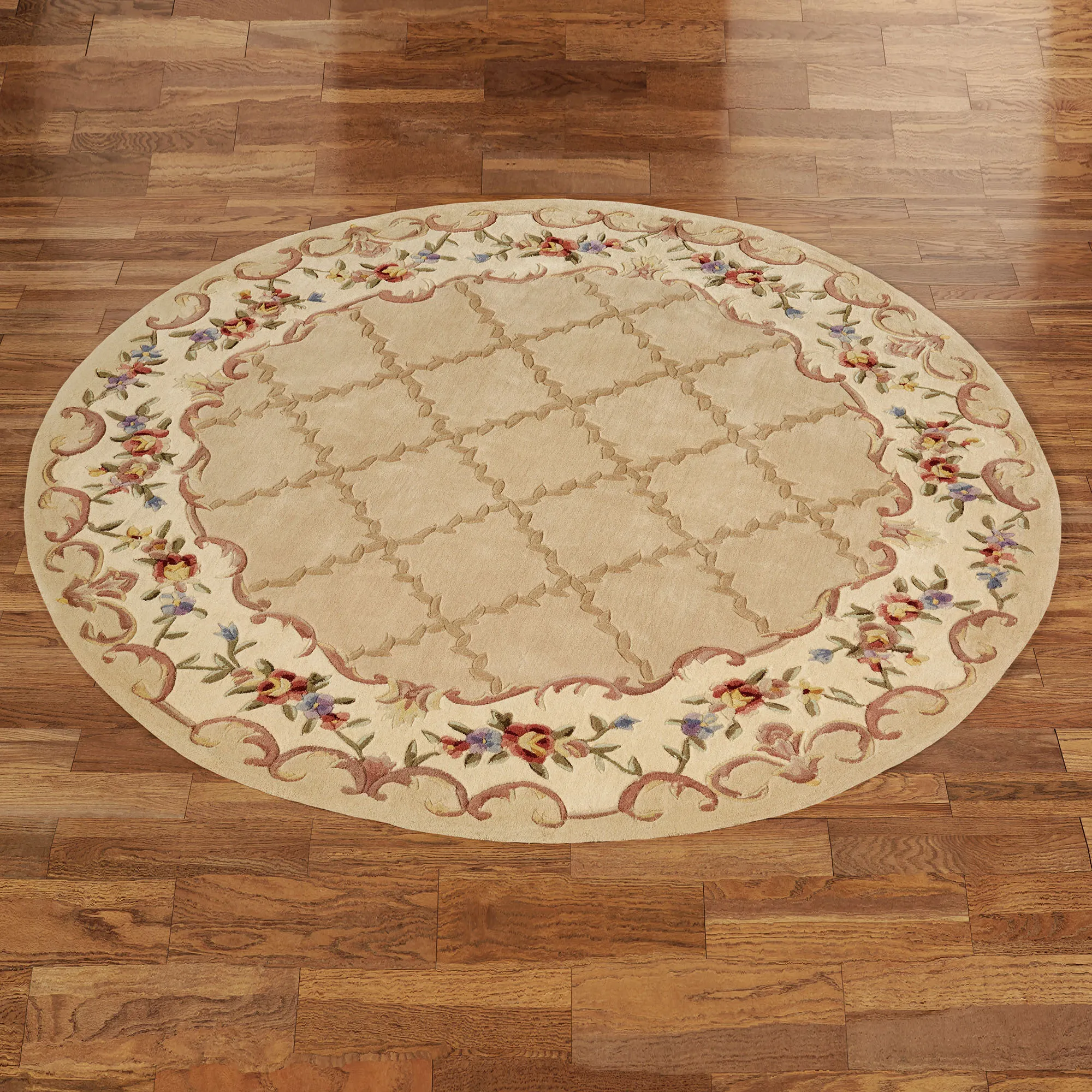 The Clara's Garden Round Rug flourishes with petaled beauties in zinfandel, salmon, ruby, powder blue, lavender, deep sage, eucalyptus, light gold, and light taupe hues. Hand-tufted and handcarved, the .75" thick wool round rug features a dark leaf lattice design on a solid color ground framed in scrolls, floral blossoms on creamy ivory, and a coordinating solid frame. The Ivory coloration has a light gold background with dark gold lattice. Backing is cotton-covered latex. We recommend professional cleaning by a rug cleaner. Imported.