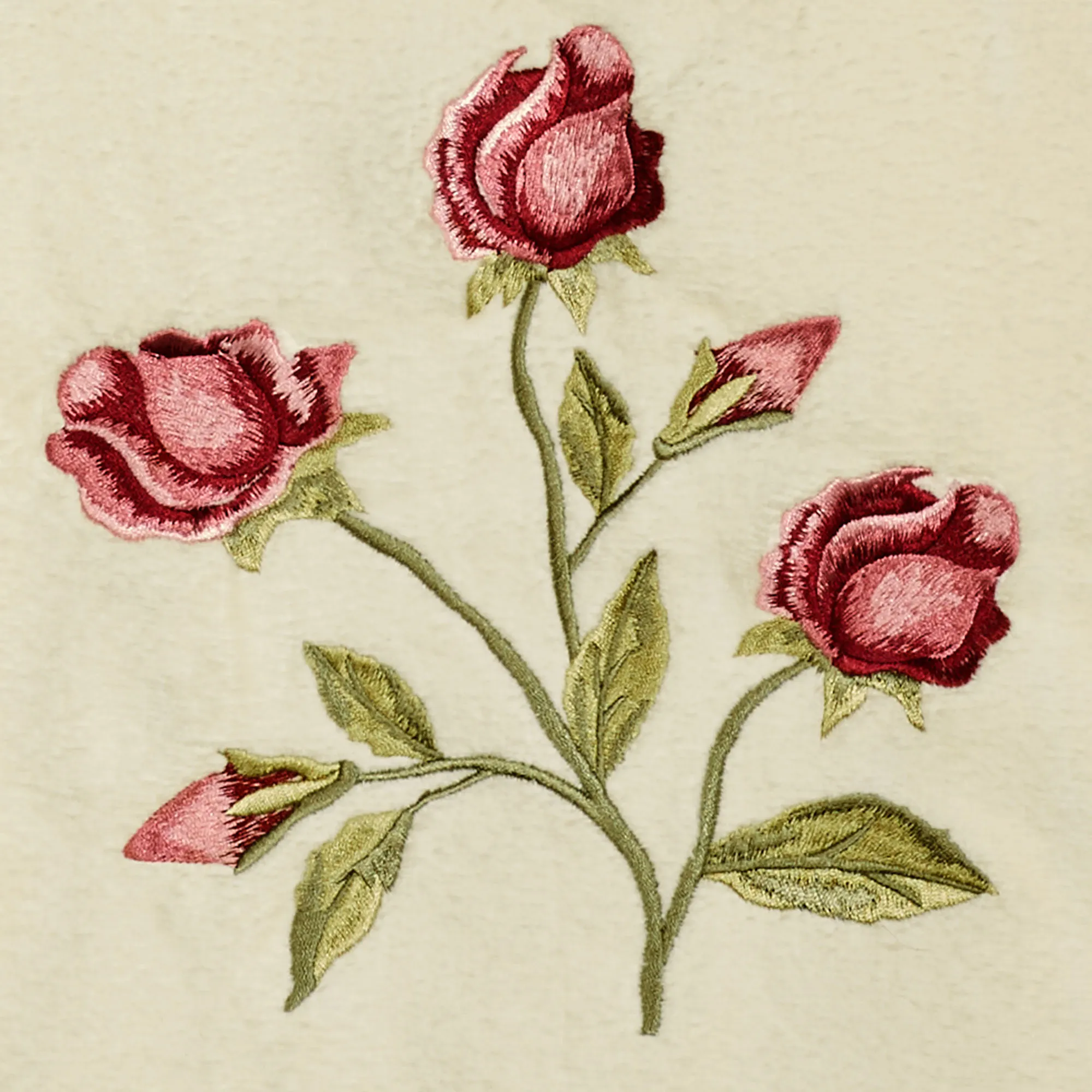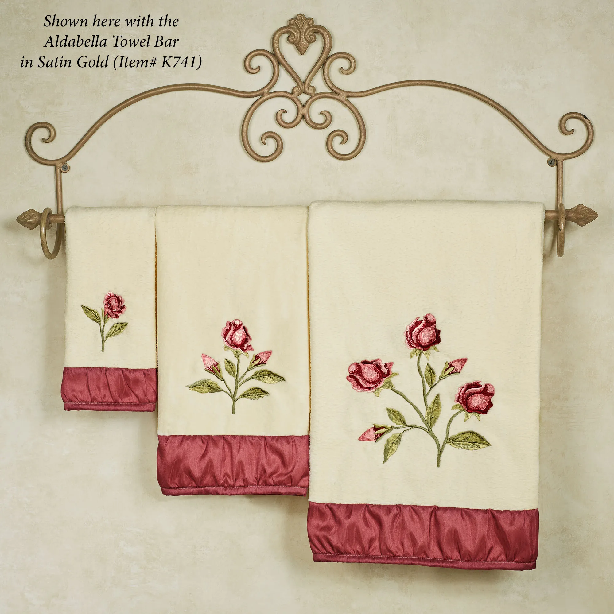 Romanticize your daily routine with the alluring Claret Rose Floral Bath Towel Set. These light cream, cotton velour towels feature embroidered claret roses on green stems. A claret shirred hem borders each. Towel set includes a bath towel, 27"x50"; a hand towel, 16"x30"; and a fingertip towel, 11"x18". Machine washable. Imported.