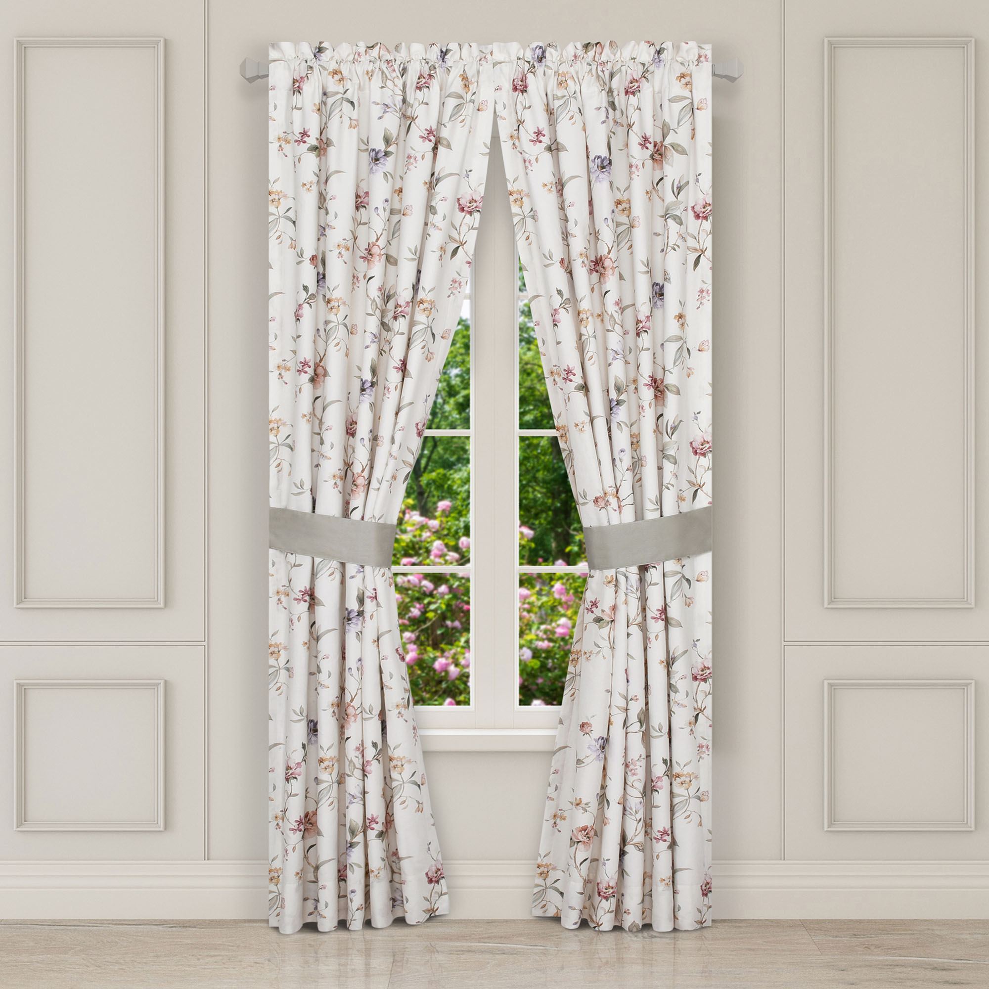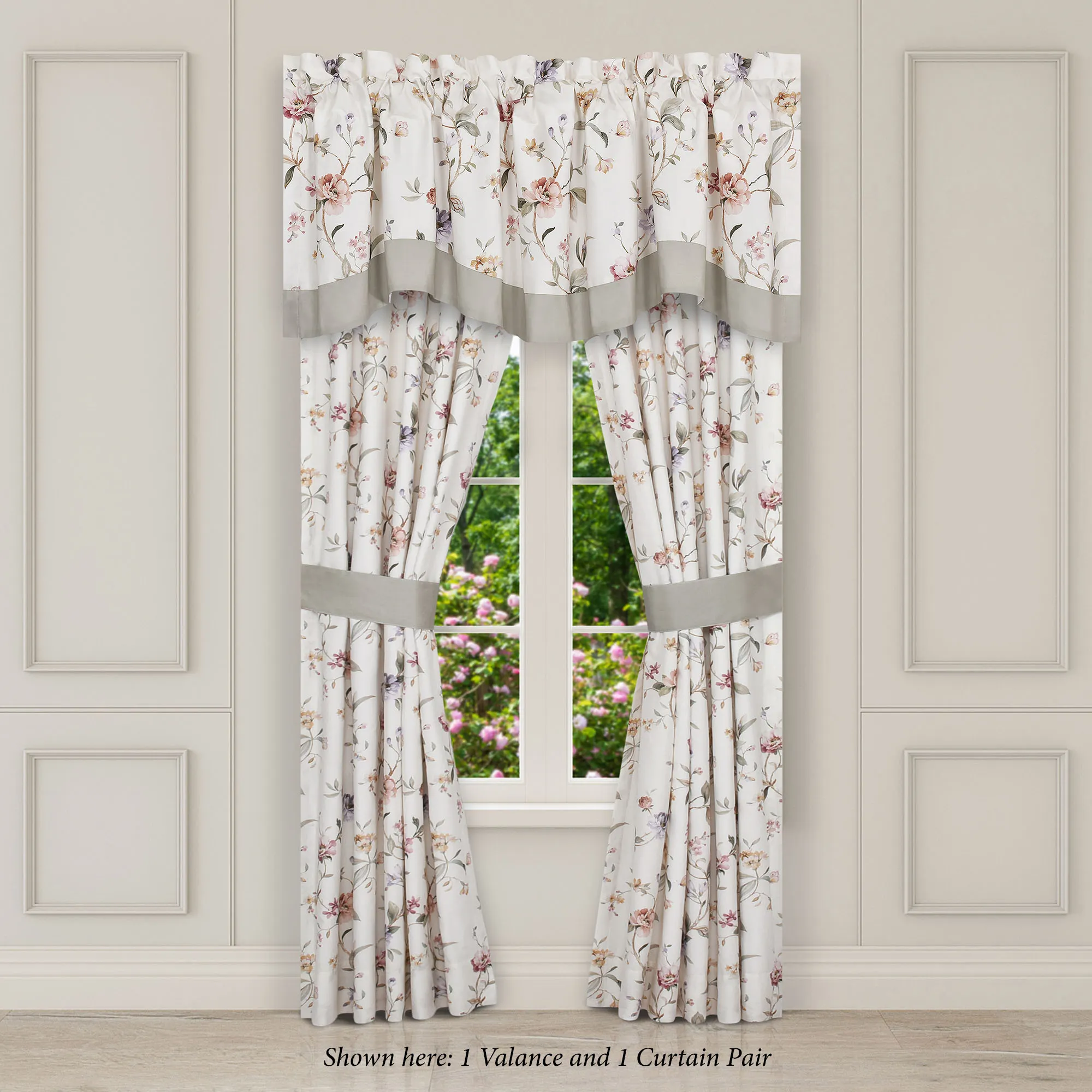Lined Window Treatments have florals, tailored edges, and 3" rod pockets. Curtain Pair includes sage tiebacks. Scalloped Valance is pieced with a solid sage bottom.