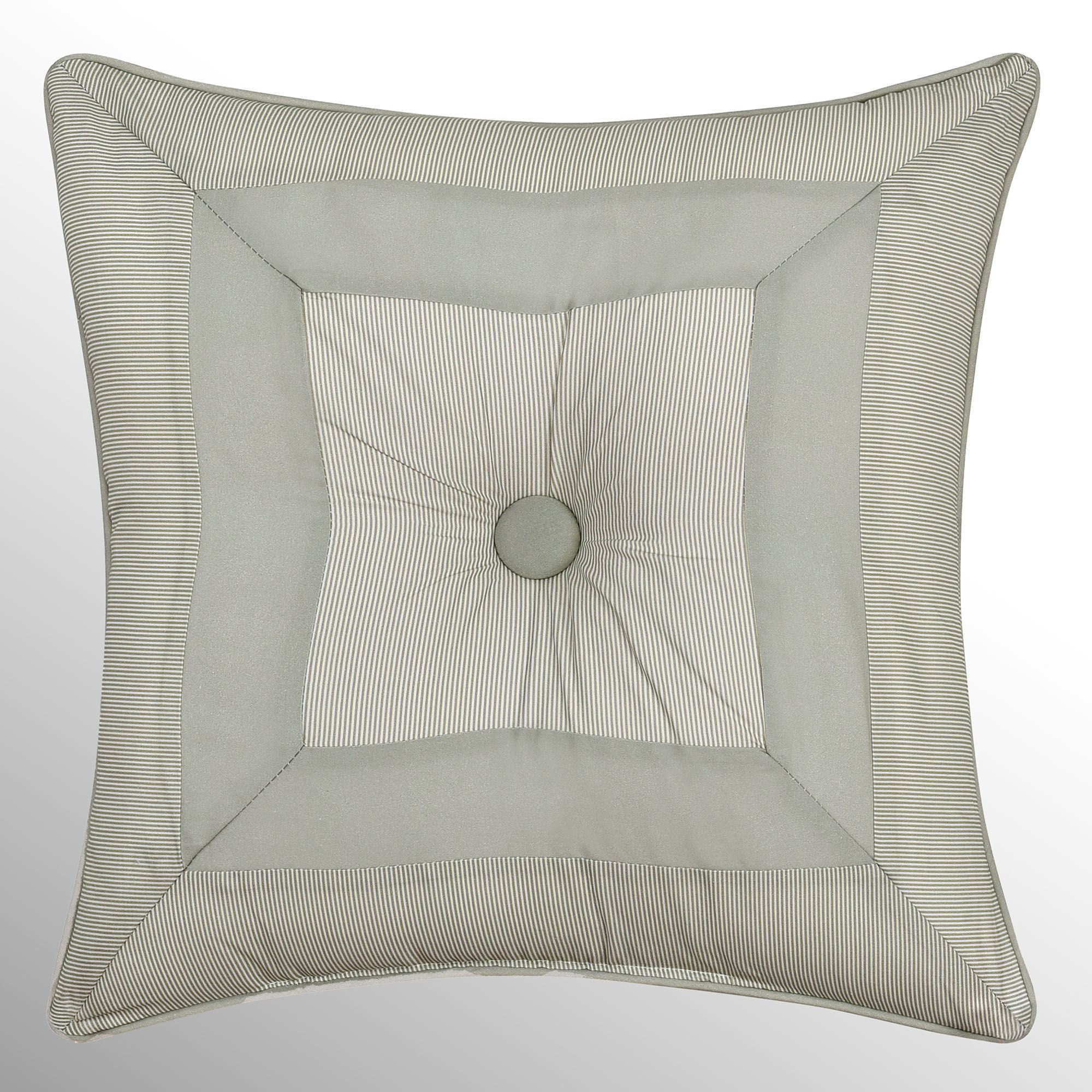 Pillows have piped edges; spot clean. The reversible 20" Square has florals and reverses to micro stripes. Rectangle has florals. The reversible 18" Tufted Square has micro stripes pieced with a solid sage square, a button-tuft center, and mitred corners; reverses to micro stripes.