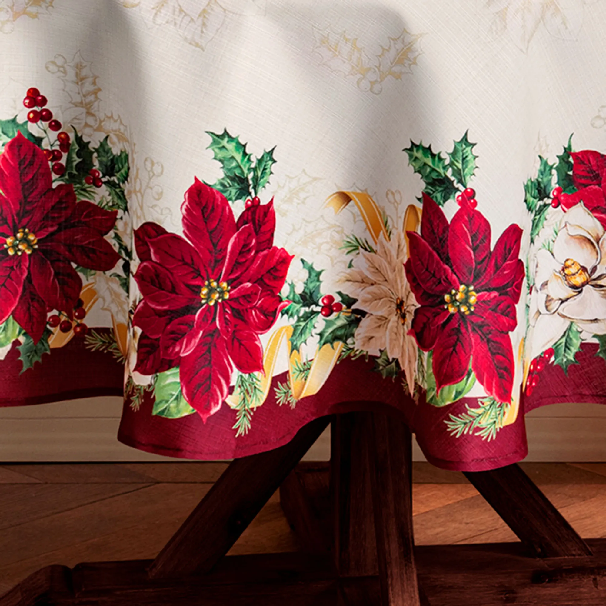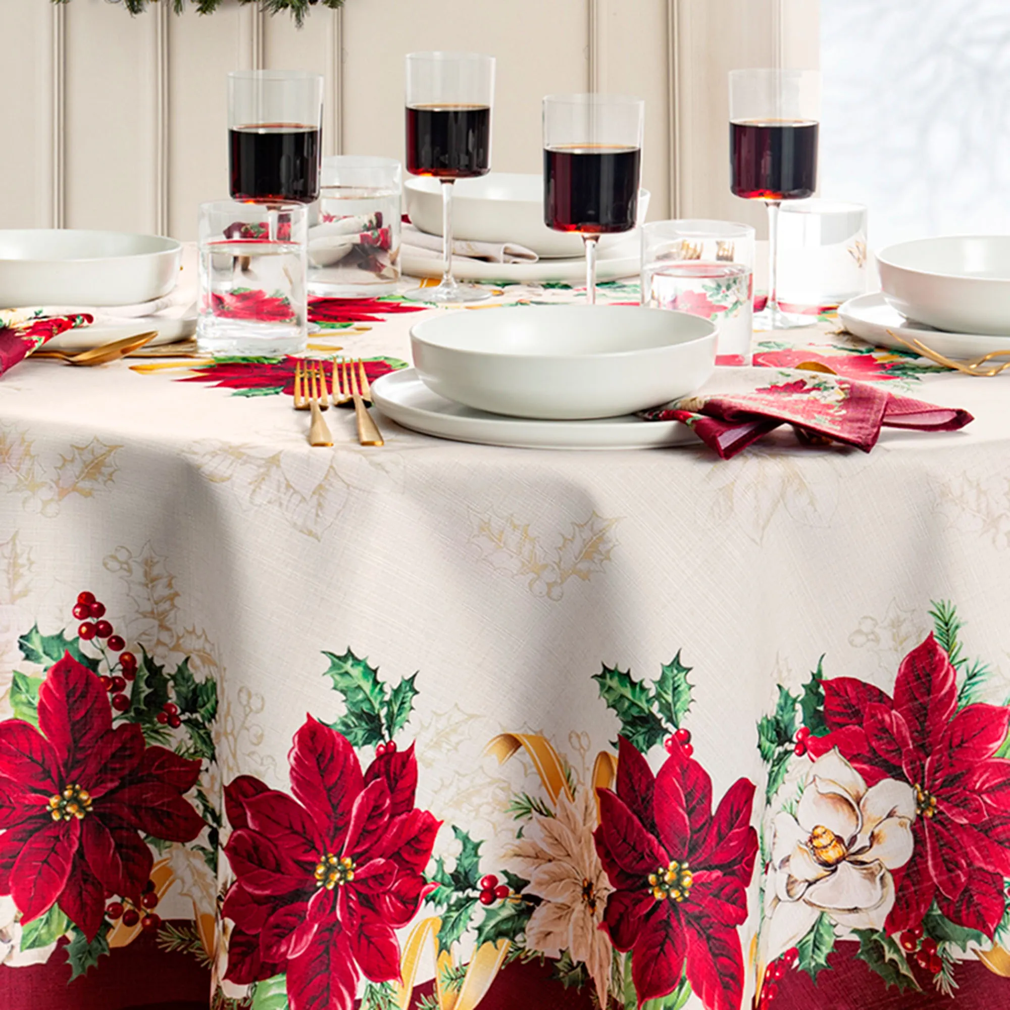 Classic Poinsettia blossoms herald a timeless Christmas style within your tablescape. Blooming in dark red and cream shades, the poinsettias are nestled among ivory magnolia, green pine bough, holly leaf, red berry, and golden curling ribbon motifs. The holiday greenery designs pop from the soft ivory grounds, which also feature tone-on-tone scattered poinsettia and holly clusters. Dark red solid borders and tailored edges finish each polyester table linen for a refined touch. Placemats reverse to solid red for a contrasting design. Choose Round Tablecloth, Rectangle Tablecloth, Oval Tablecloth, Table Runner, Placemat Set of 4, or Napkin Set of 4. Machine washable. Imported.