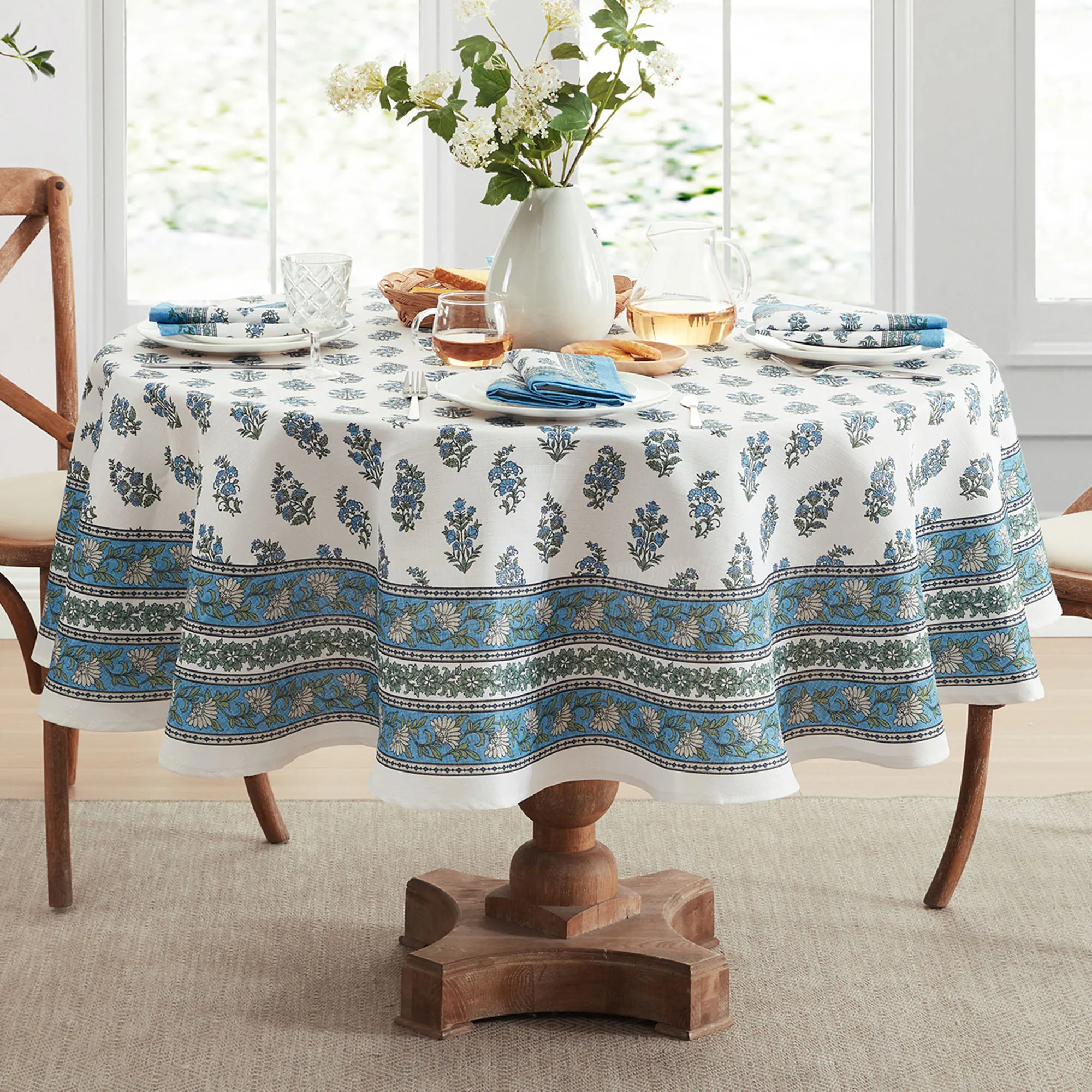 The Classic Tropez Table Linens dress your table in crisp hues of blue, green, and white. Perfect for dining indoors, on a covered porch, or in an enclosed patio, the polyester table accessories feature charming timeless floral sprigs on white surrounded by ornate flowering vine borders. Stain and water resistance makes the tailored table designs a durable dining choice. Choose Placemat Set of 4, Napkin Set of 4, Rectangle Tablecloth, Round Tablecloth, or Table Runner. Placemats reverse to a solid color. Table Runner has bordered ends. Machine washable. Imported.
