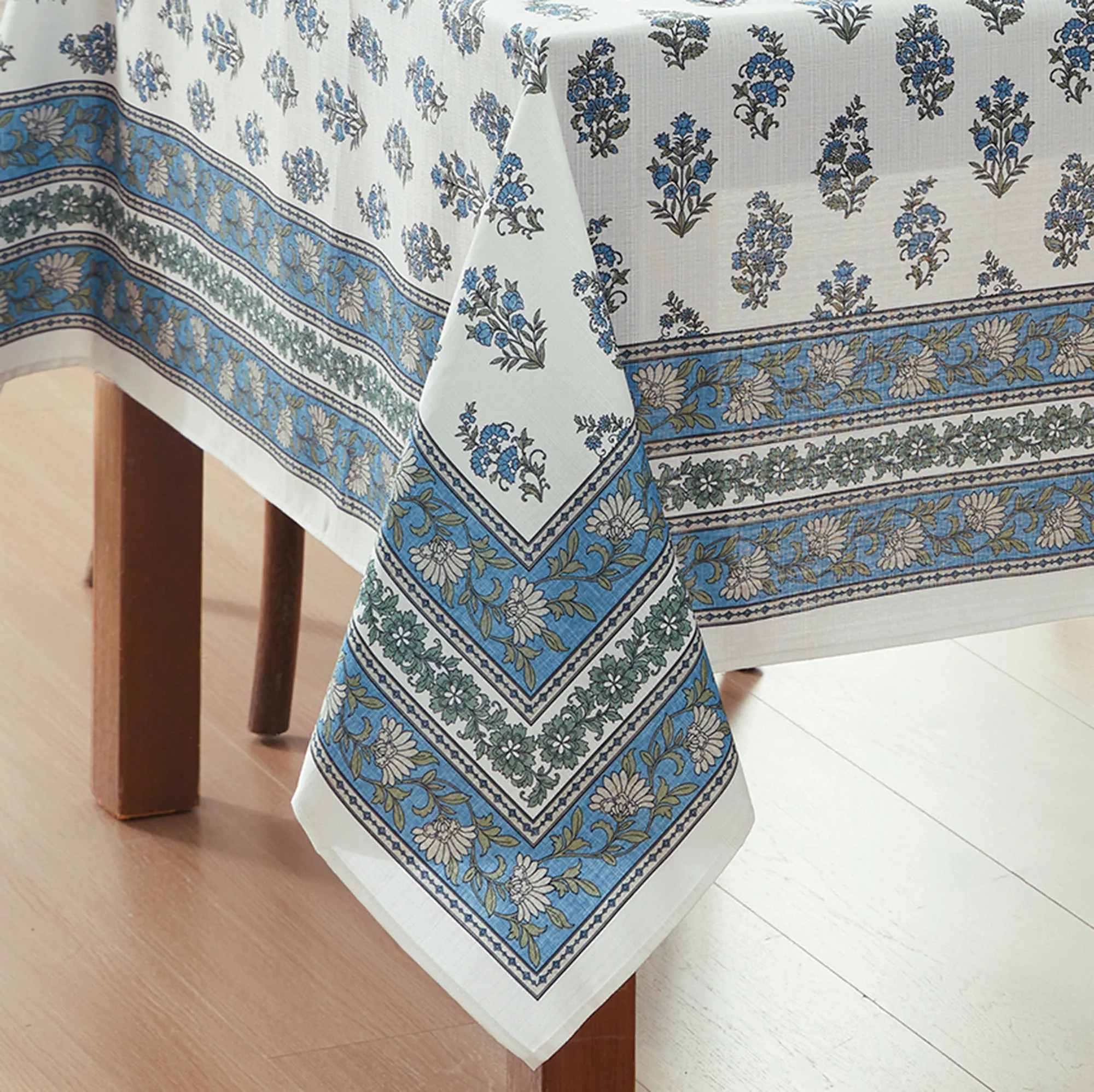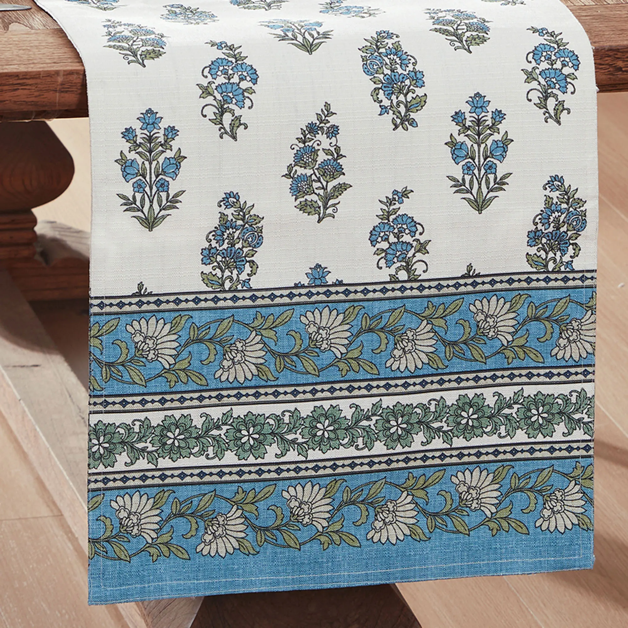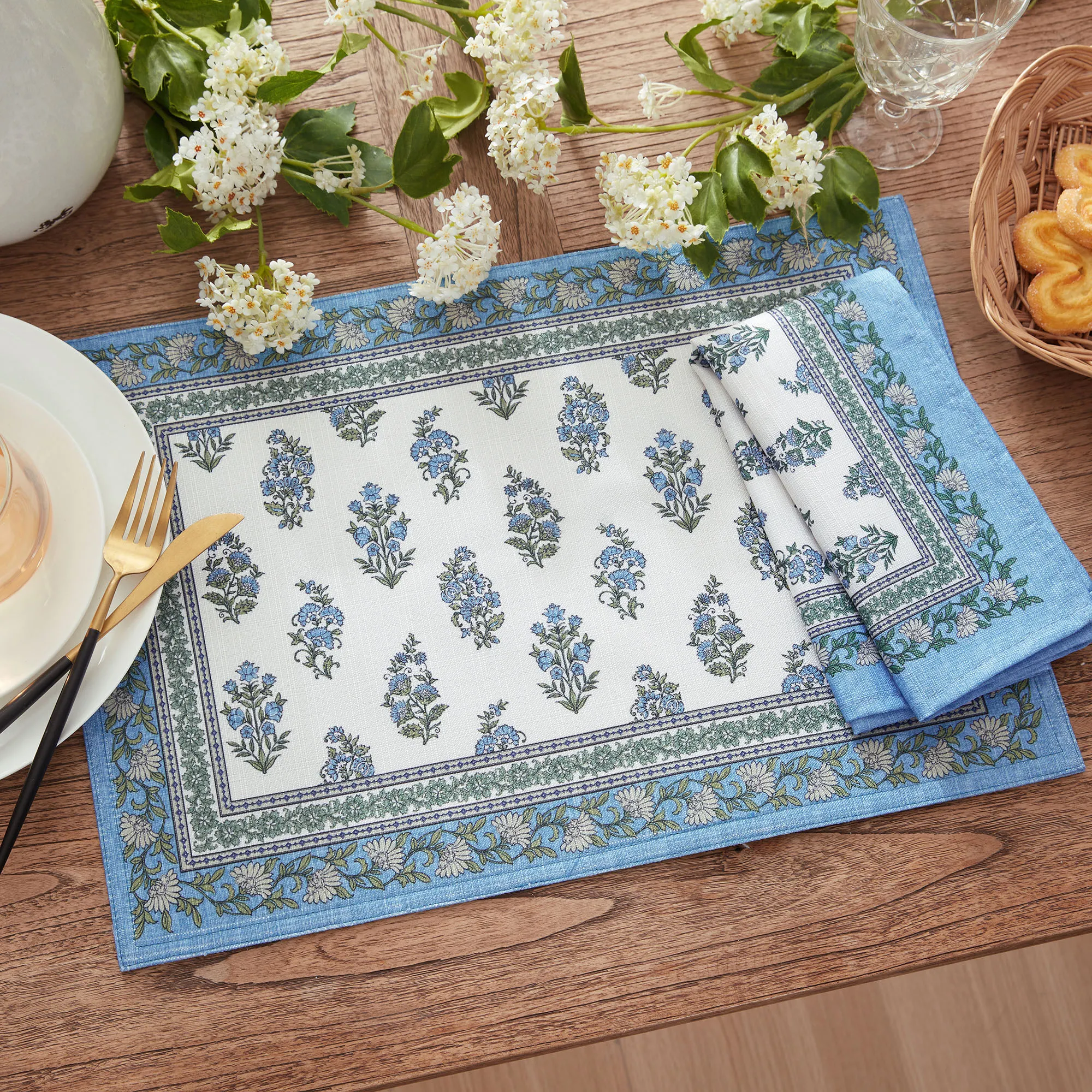 The Classic Tropez Table Linens dress your table in crisp hues of blue, green, and white. Perfect for dining indoors, on a covered porch, or in an enclosed patio, the polyester table accessories feature charming timeless floral sprigs on white surrounded by ornate flowering vine borders. Stain and water resistance makes the tailored table designs a durable dining choice. Choose Round Tablecloth, Rectangle Tablecloth, Table Runner, Placemat Set of 4, or Napkin Set of 4. Table Runner has bordered ends. Placemats reverse to a solid color. Machine washable. Imported.