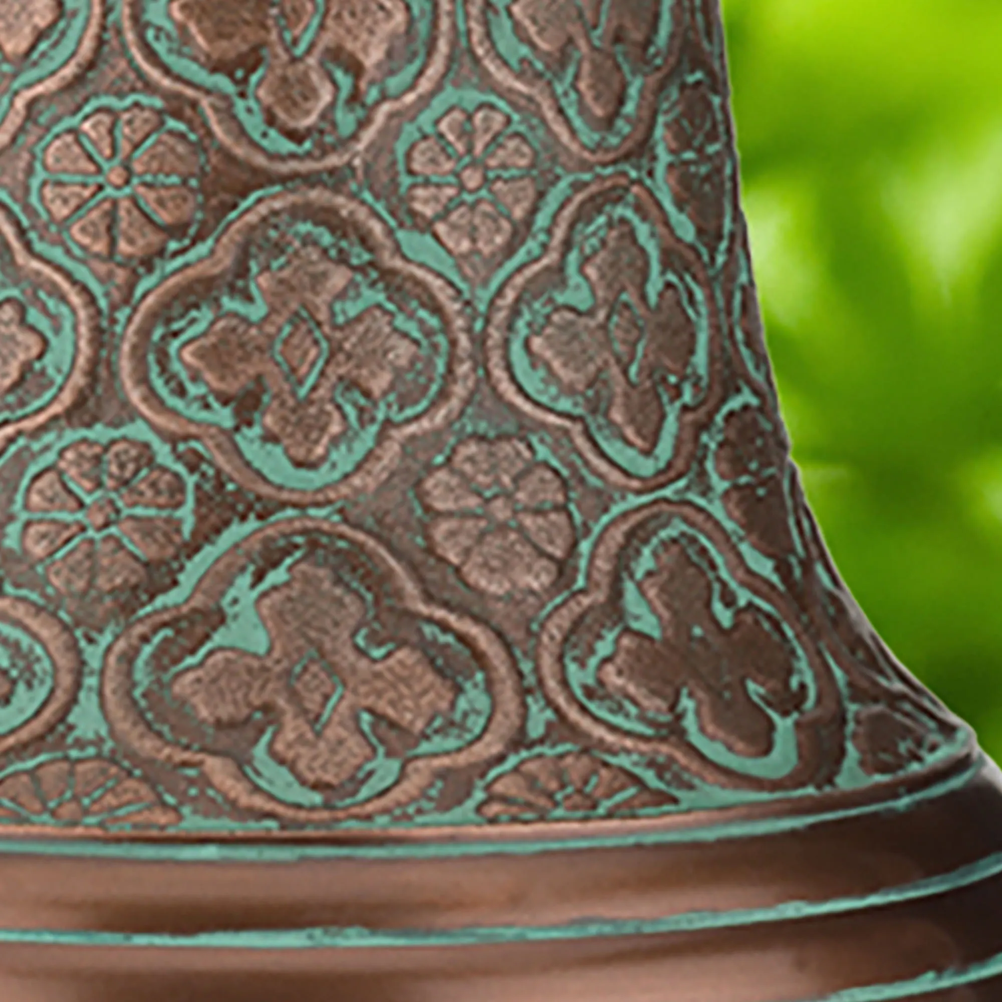 Echoing reverberations from the Classic Wind Bell fill your outdoor space year round with timeless charm. With a weather- and fade-resistant finish, the copper-hued metal design features a thick, hollow chambered bell patterned with embossed medallions and detailed with a verdi green patina. Overall, the bell measures 10"dia.x33"H when hanging.