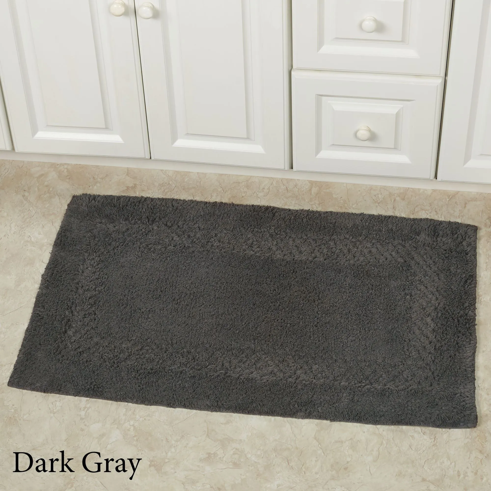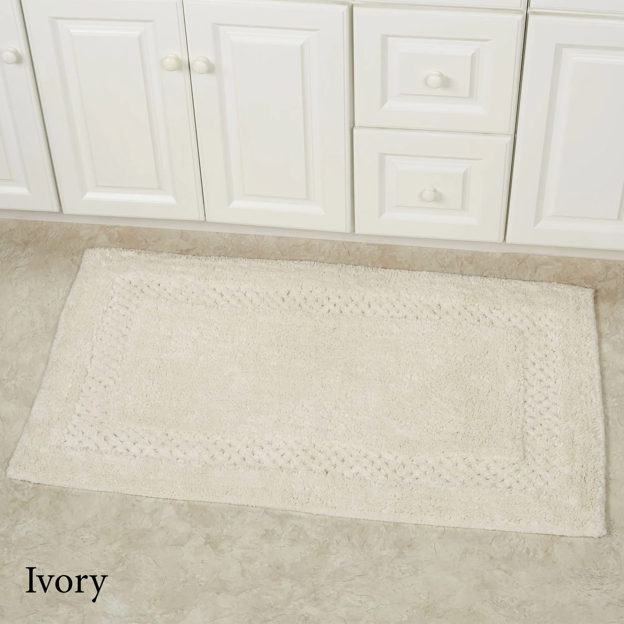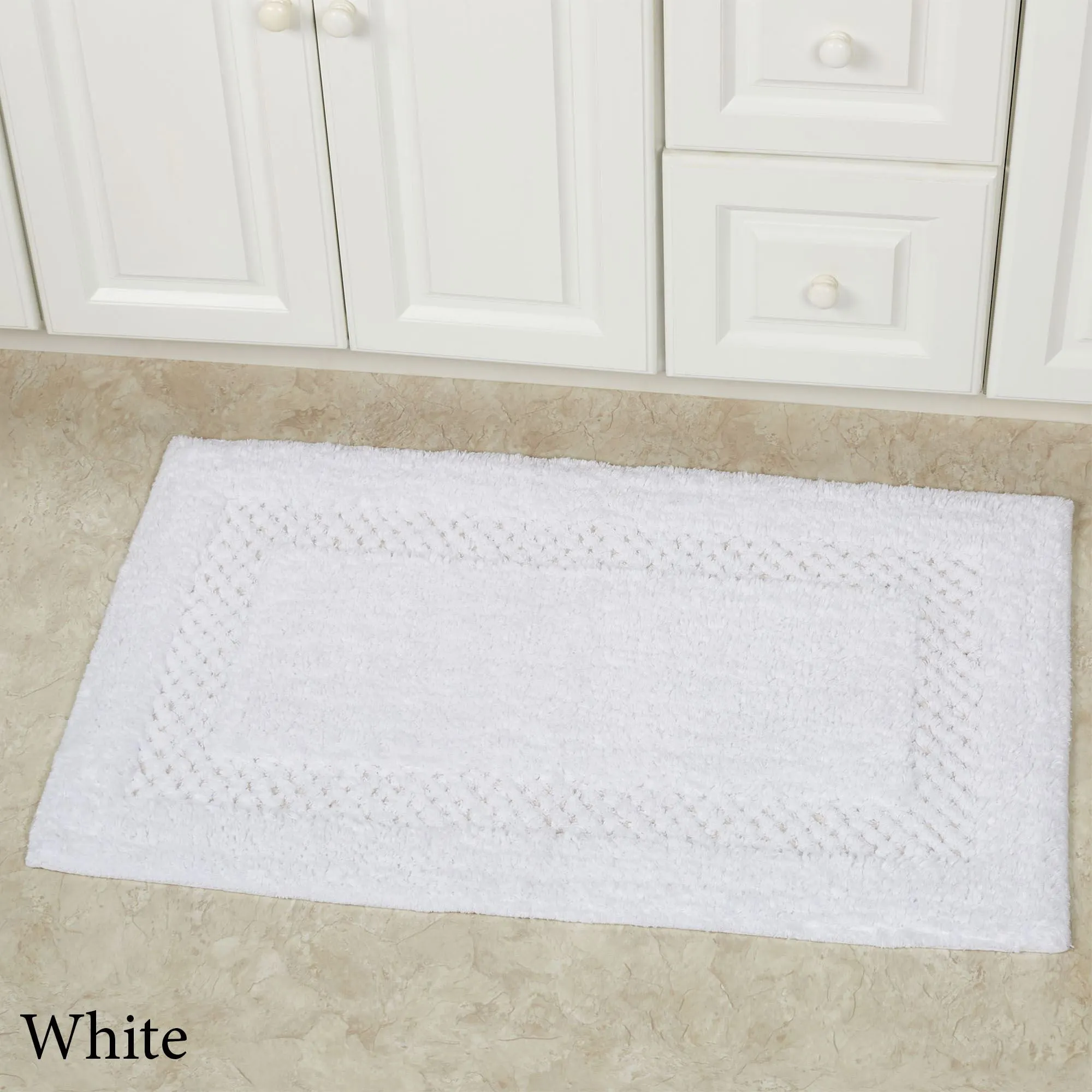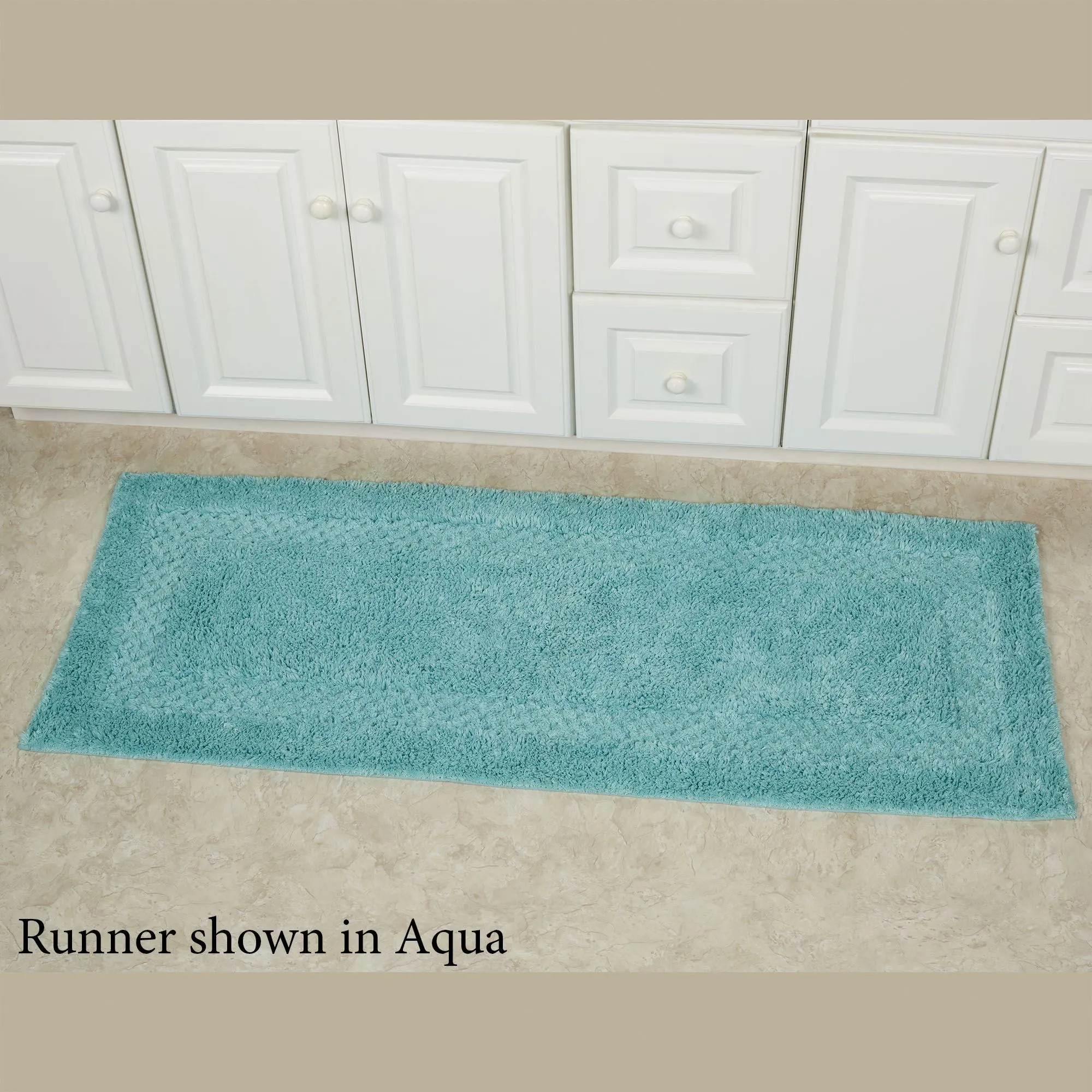 Step out of the shower or bath onto the Classy Bath Rug. This plush cotton bath rug is a solid color with a frame design. Slip-resistant backing is spray latex. Rectangle Rug is available in two sizes. Runner is 54"x21". Machine washable. Imported.