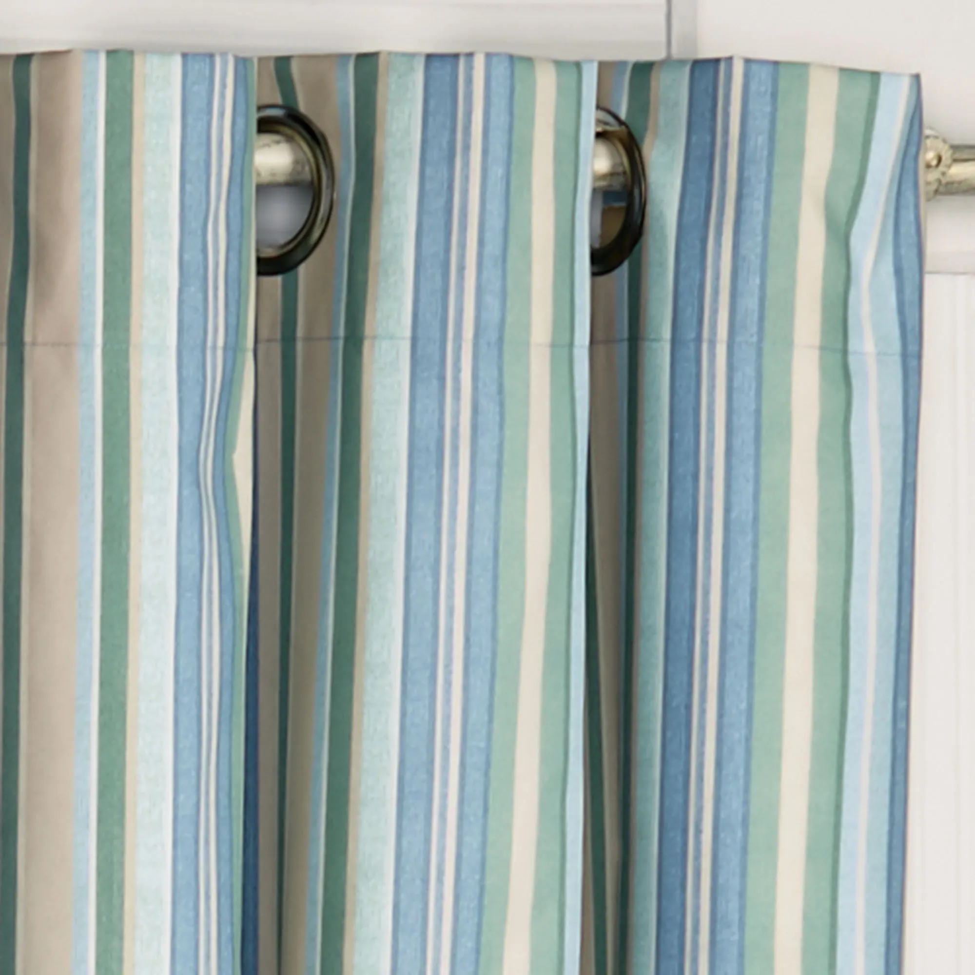 The soothing stripe designs on the Clearwater Coastal Window Treatment will remind you of blue skies and sandy beaches. This brushed polyester microfiber window treatment features classic coastal colors. The Grommet Curtain Pair has stripes in vanilla, ivory, spring green, glacier, jade, blue shadow, and light blue. Curtains have 1.5" dia. silver-finished metal grommets and a foam back for room darkening and energy efficiency. Washable. Imported. The curtain pair width is the total width of two panels together.